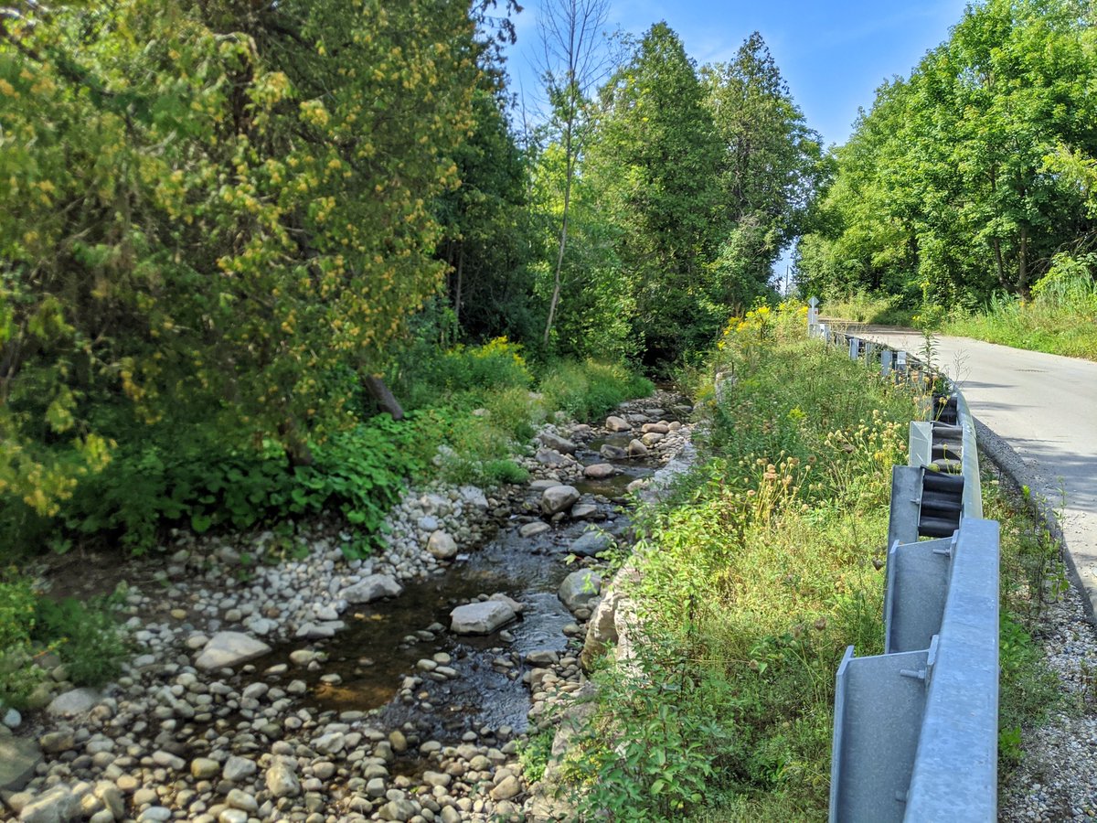 The channel continues in the same fashion through Wilson Park, but gains a parallel stonedust trail. Then it meets the Conestoga Parkway, meaning it ducks into a large culvert.