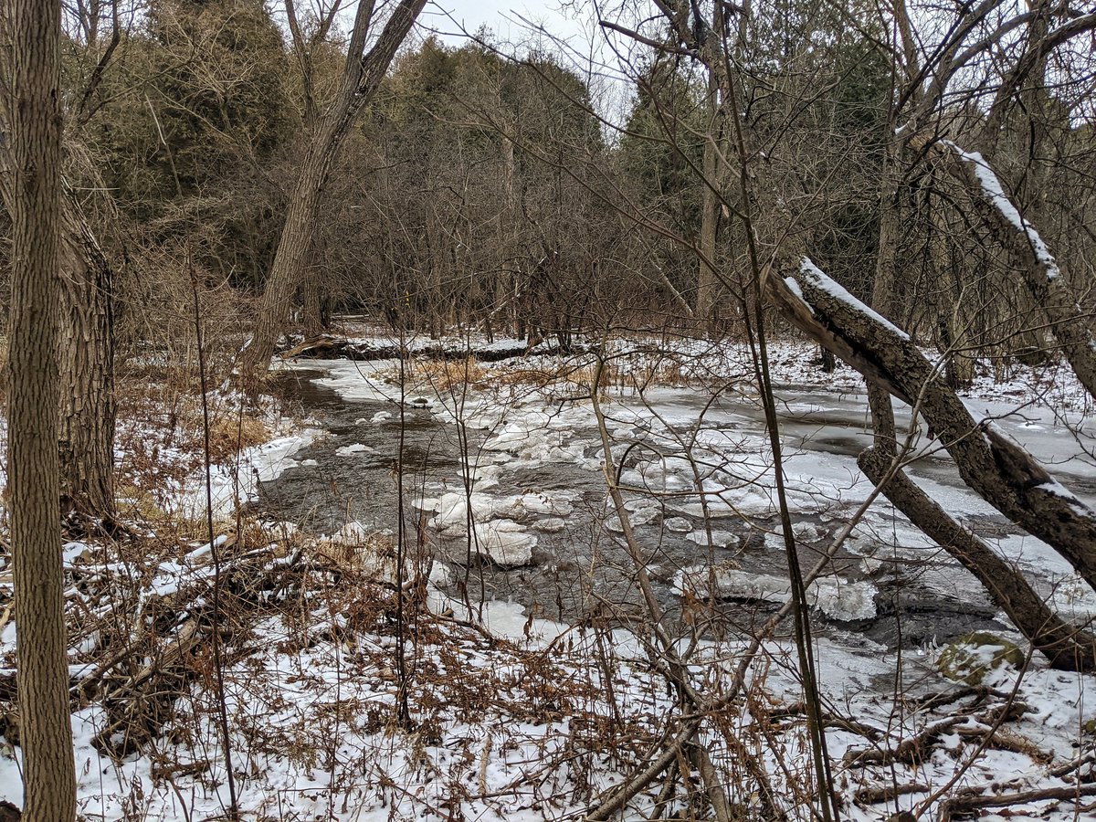 Okay, a detour I didn’t fully plan on. Chilligo Creek runs across the corridor, and I underestimated the amount of flow it had. Can’t hop across, gotta navigate the northeast bank until it meets the Speed River. But hey, I’ll take a creek detour over a silly fence any day.