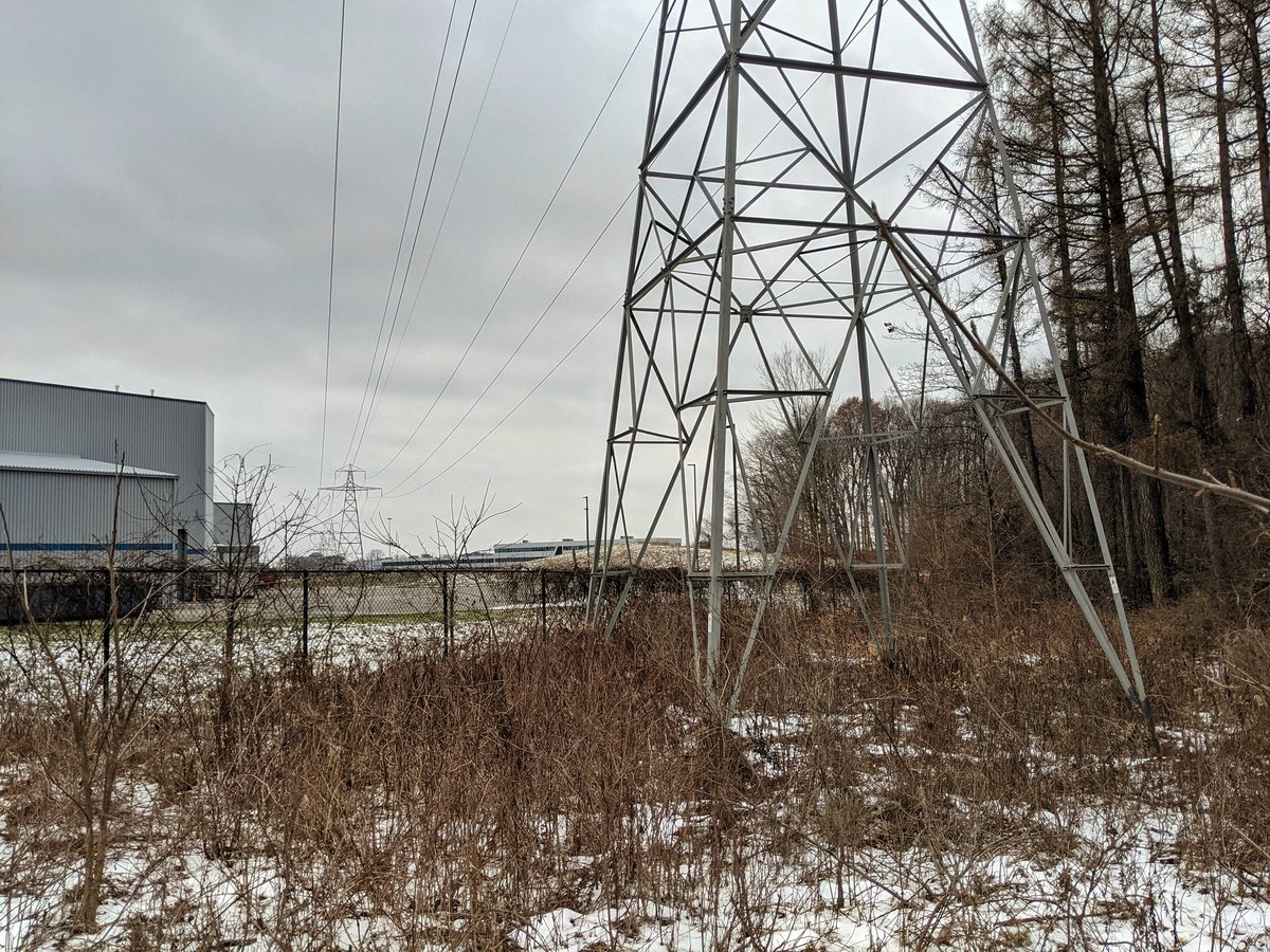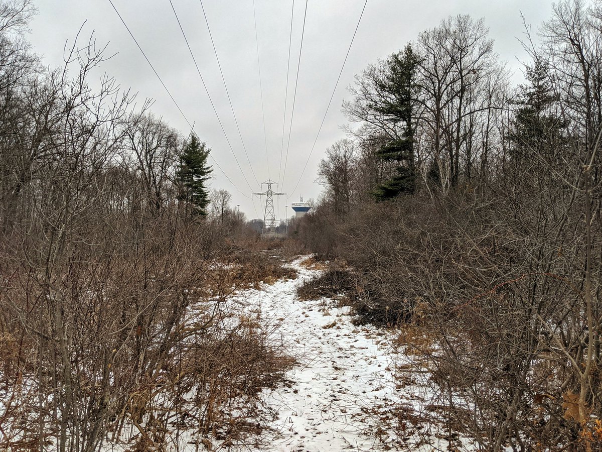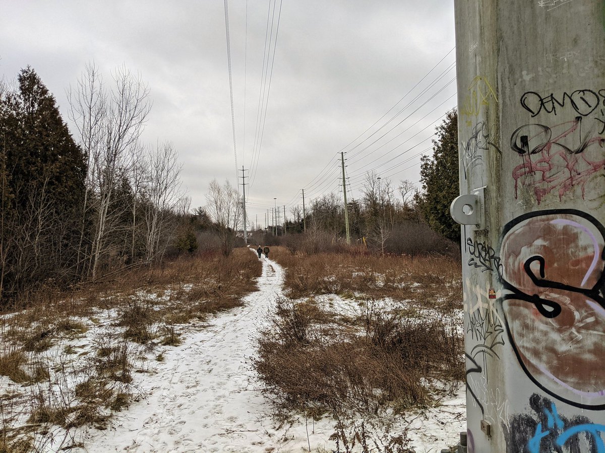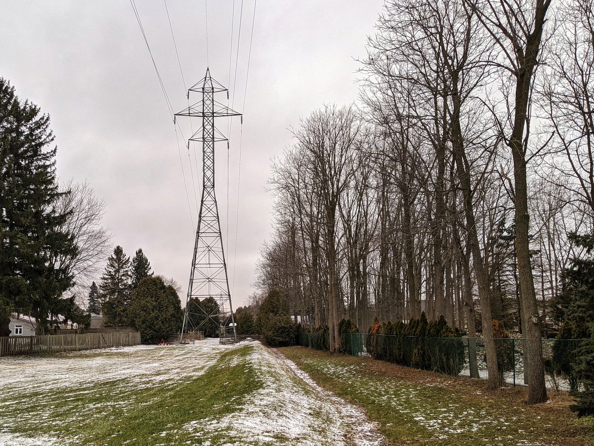 Relegated to the Speed Island Trail, there’s a glimpse of the junction between the last and the next corridor. This is a trunk leading from a transformer station south of the 401. Over the river, it splits: east is where I came from. West goes to the Conestoga Parkway.