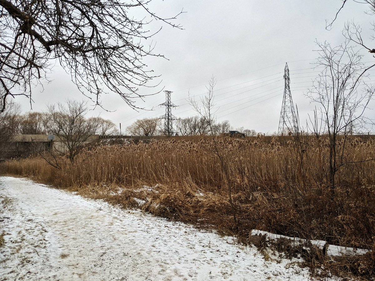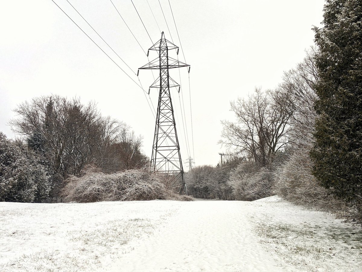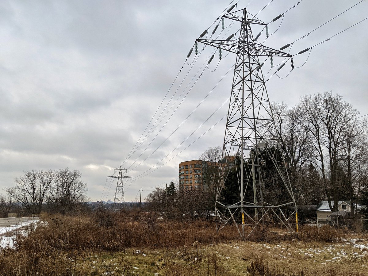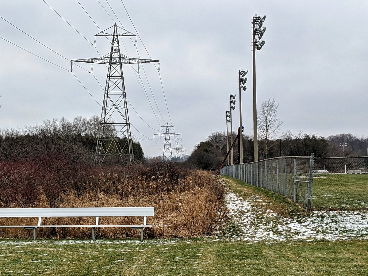 Relegated to the Speed Island Trail, there’s a glimpse of the junction between the last and the next corridor. This is a trunk leading from a transformer station south of the 401. Over the river, it splits: east is where I came from. West goes to the Conestoga Parkway.