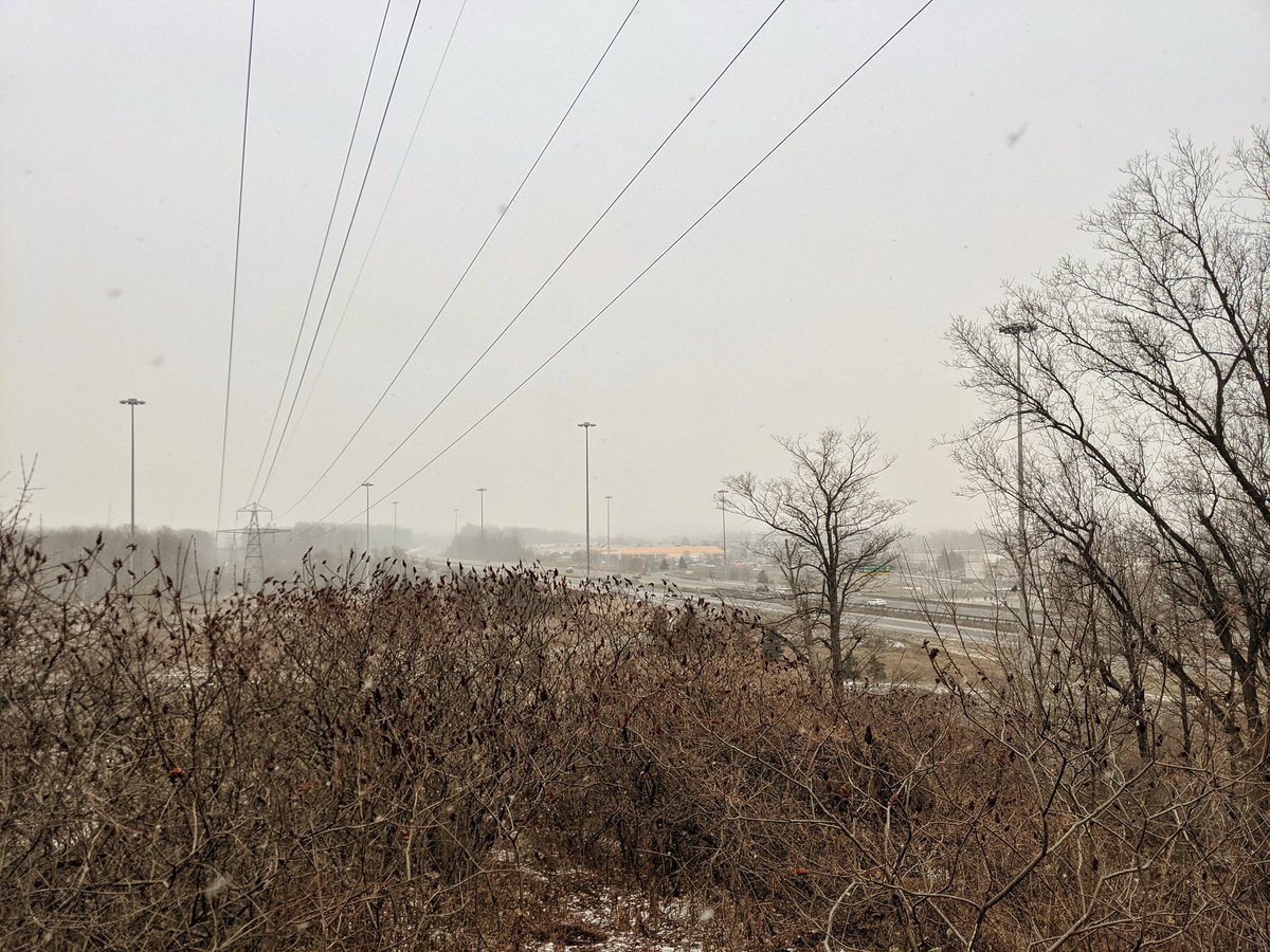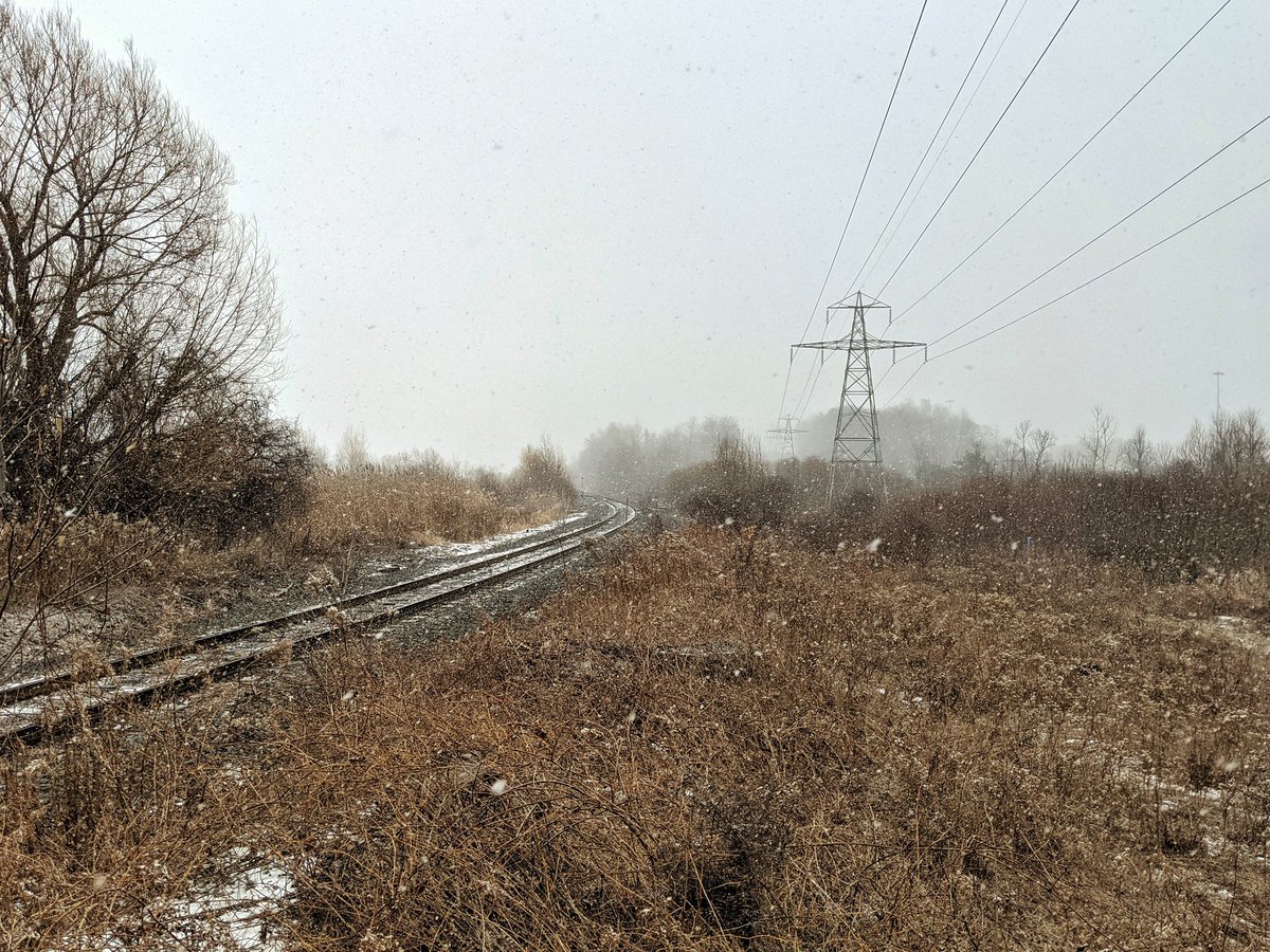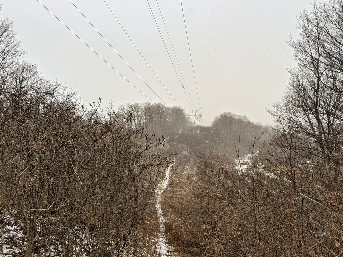 Now for a hilly part between Sportsworld and King Street. It’s beginning to snow, but at least the ground is frozen, making the trip through this mucky area easier.