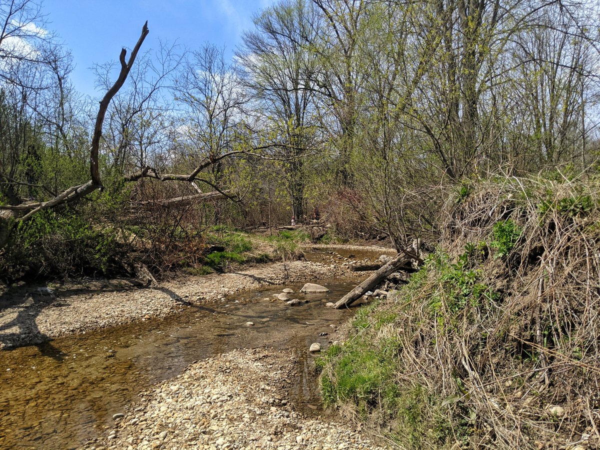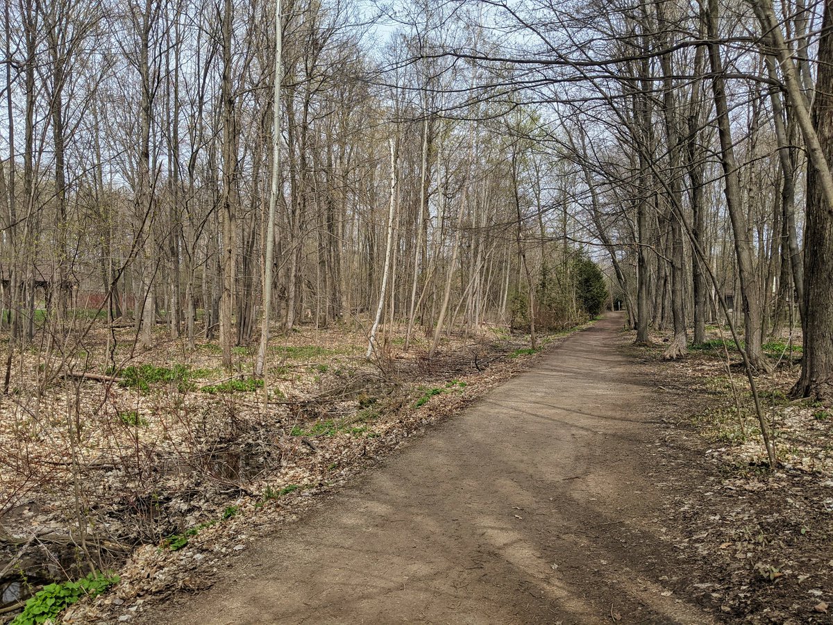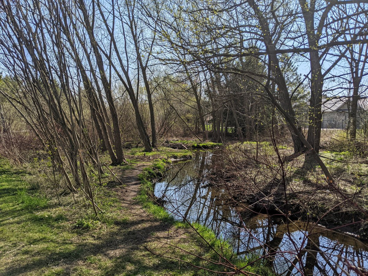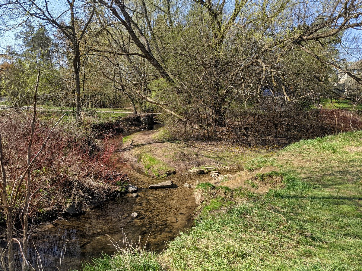 A nice trailway at the end of a cul-de-sac. Looks prone to flooding. It’s a nice trail and valley nonetheless. Got a glimpse of the confluence between the creek’s two branches. I’ll try following the north one, and come back to the south.