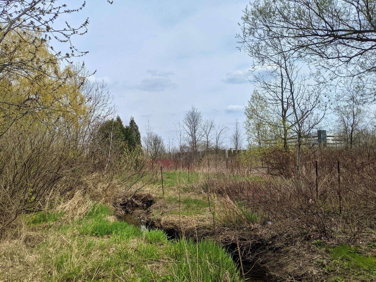 The creek parallels a railway to St Jacobs and Elmira, before turning onto the Waterloo-Woolwich border. Some meander reappears next to some stormwater ponds for the Stockyards.