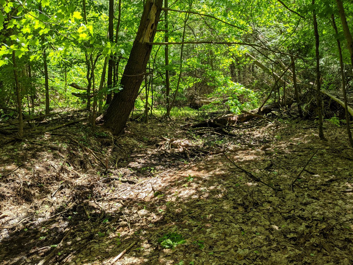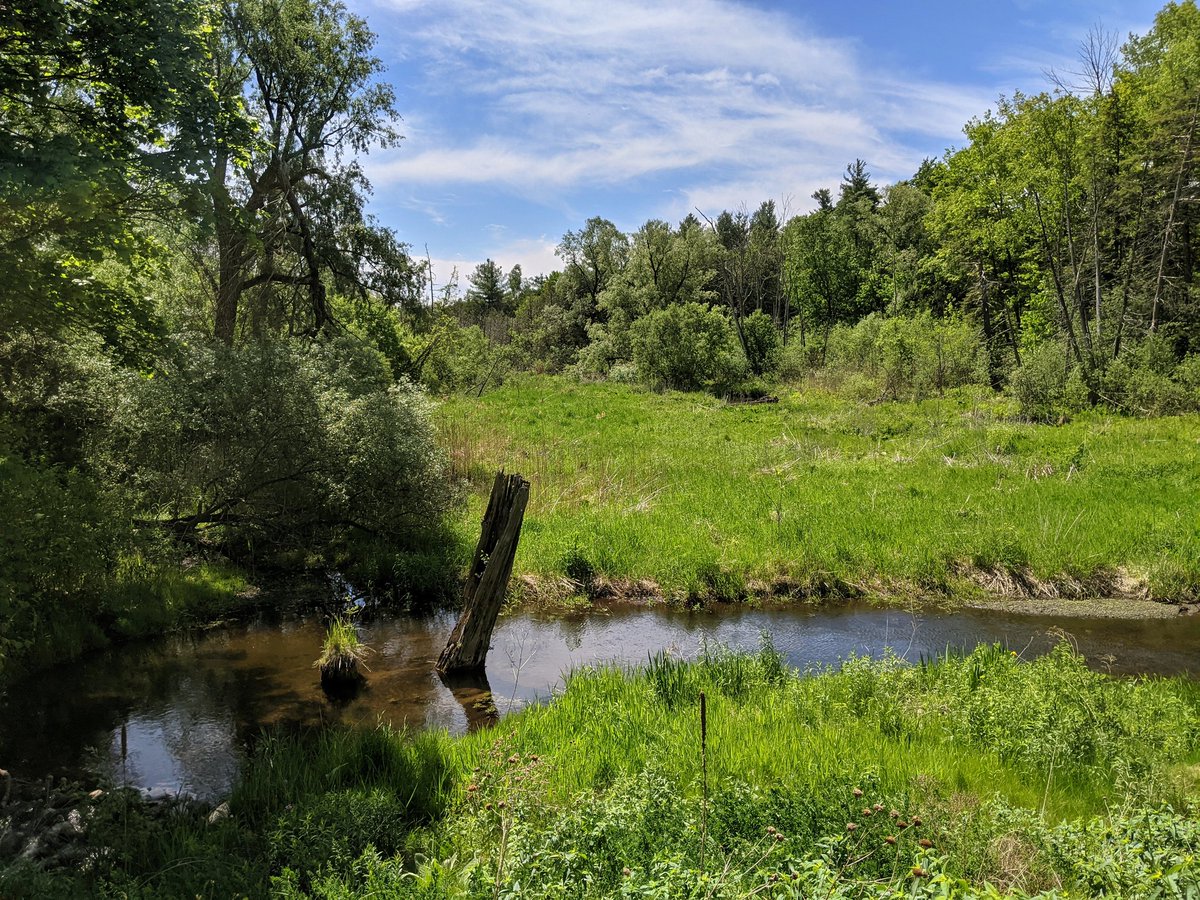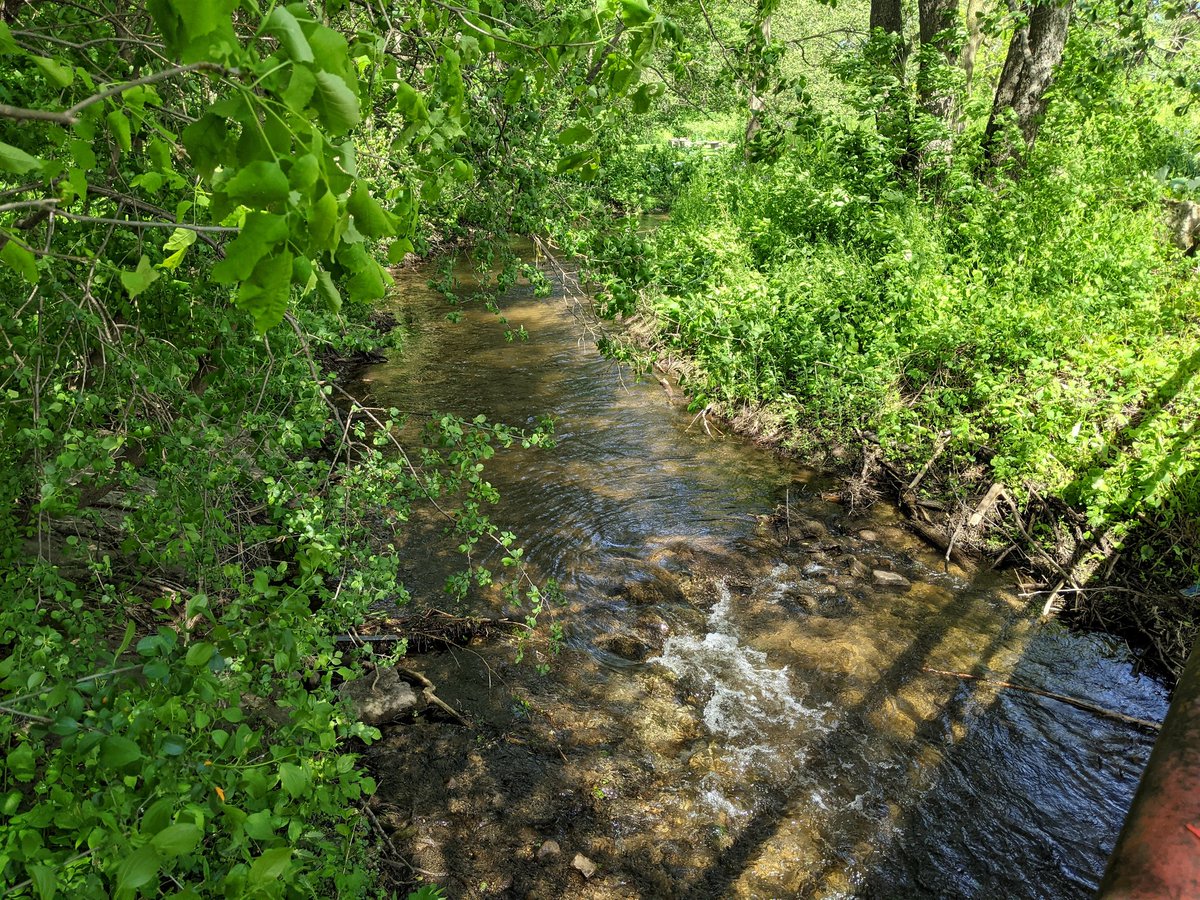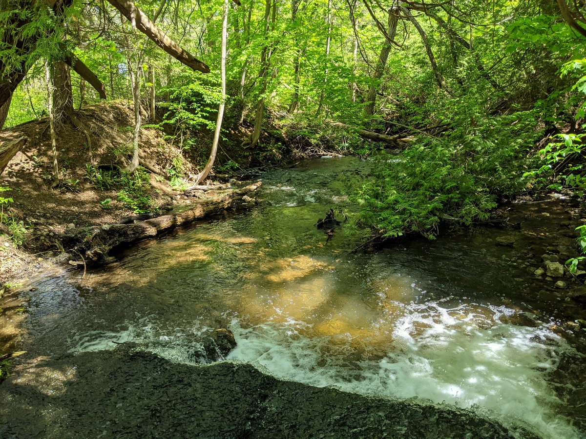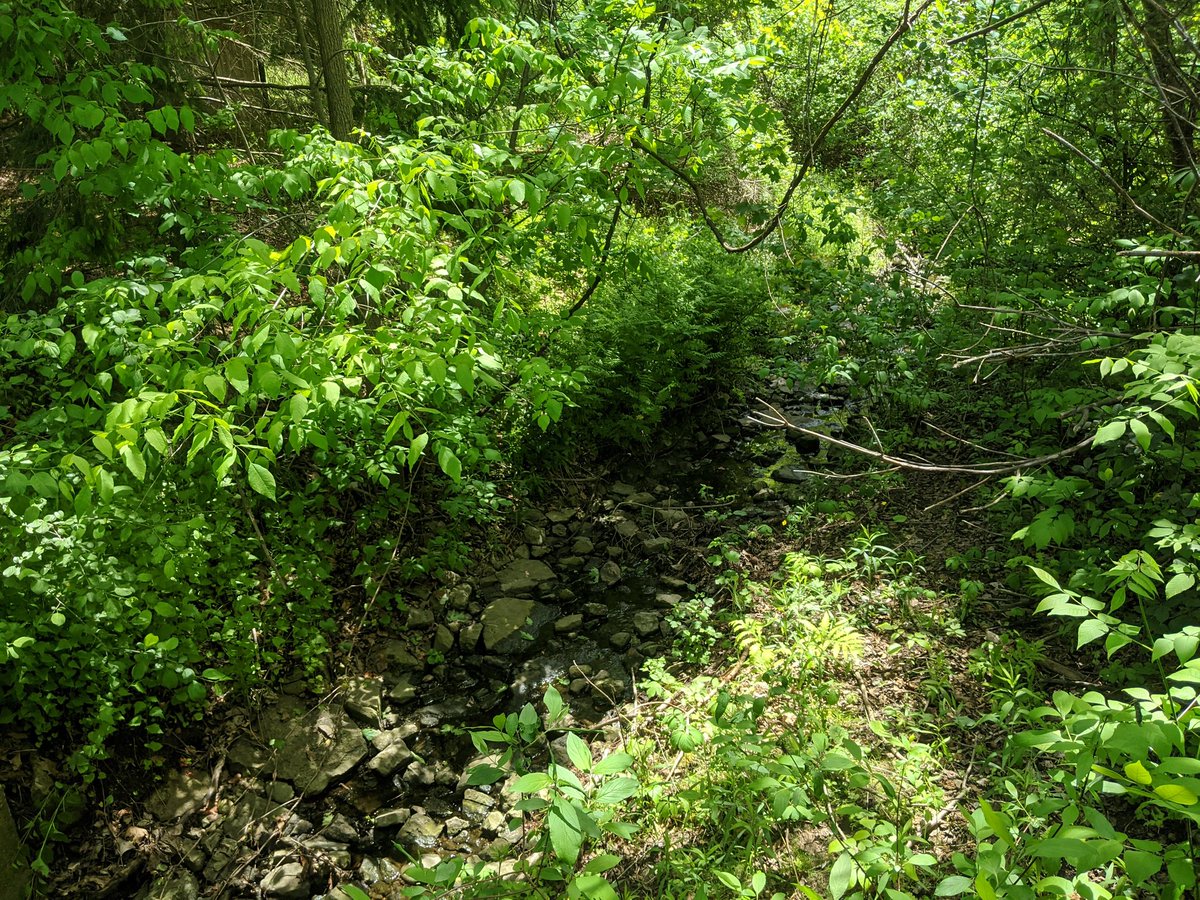 Next: School Creek. Thought there would be some bushwhacking involved, but turns out there’s a hiking trail. First reach has no defined bed and bank, it appears to be groundwater seepage from the same moraine that makes up Pinnacle Hill. Becomes defined further downhill.