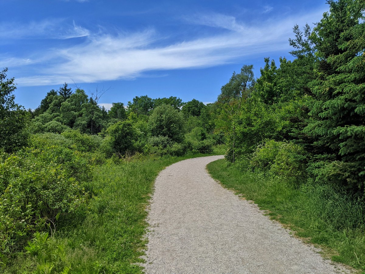 At the watershed divide. Another rural laneway turned suburban trail leads to stormwater management ponds by the hydro corridor. The water works its way into a trickle.