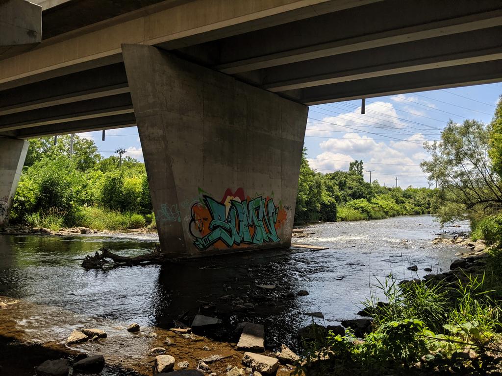Excellent high view from upon a pedestrian bridge. Leaving the core, the river goes au naturel again, and the trail turns back to stonedust.
