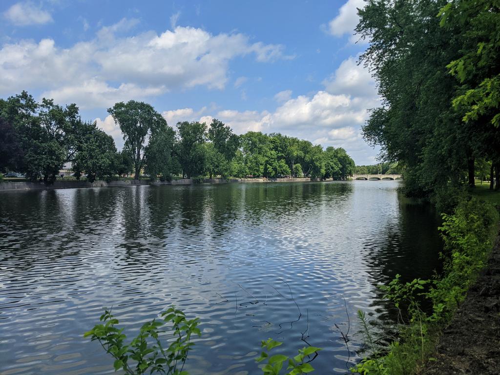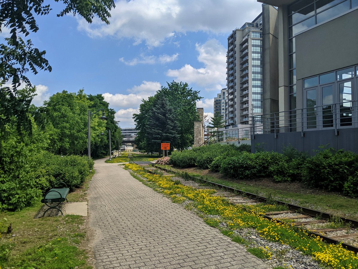 Into the downtown core. Lots of bridge crossings. New mid- and high-rise that never would have happened a decade ago. Brick trail and railway paralleling the river.
