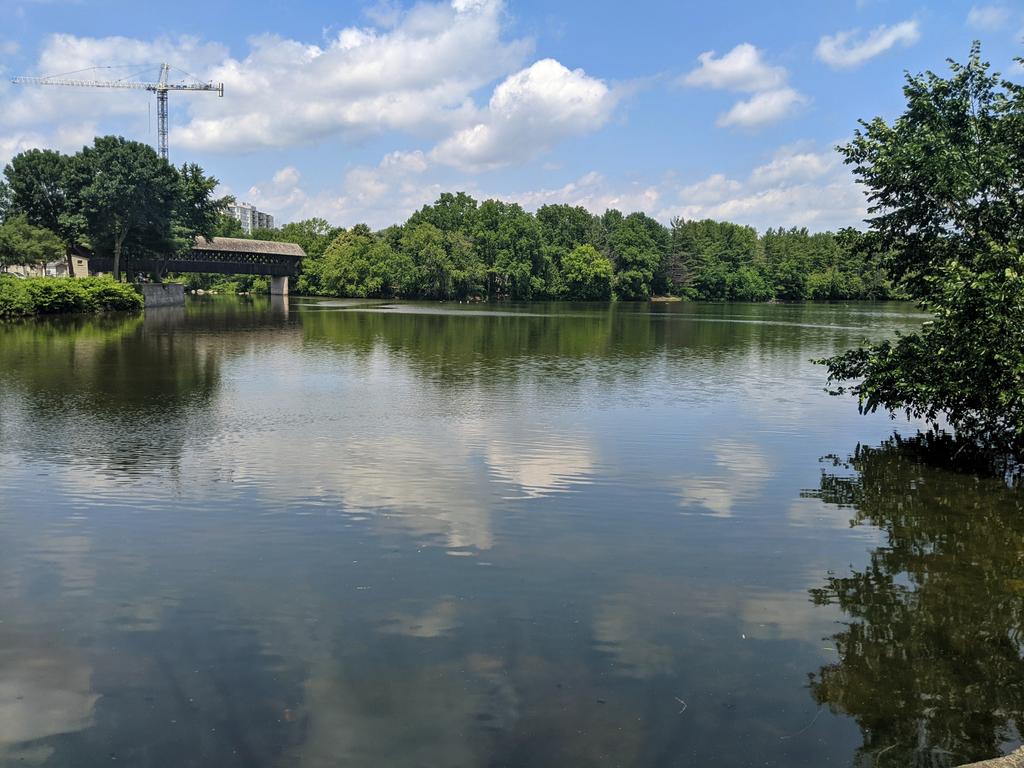 River gets wide and still, as it forms a headpond towards its confluence with the Eramosa River. Over the covered bridge past the fork. Lots of paddlers.