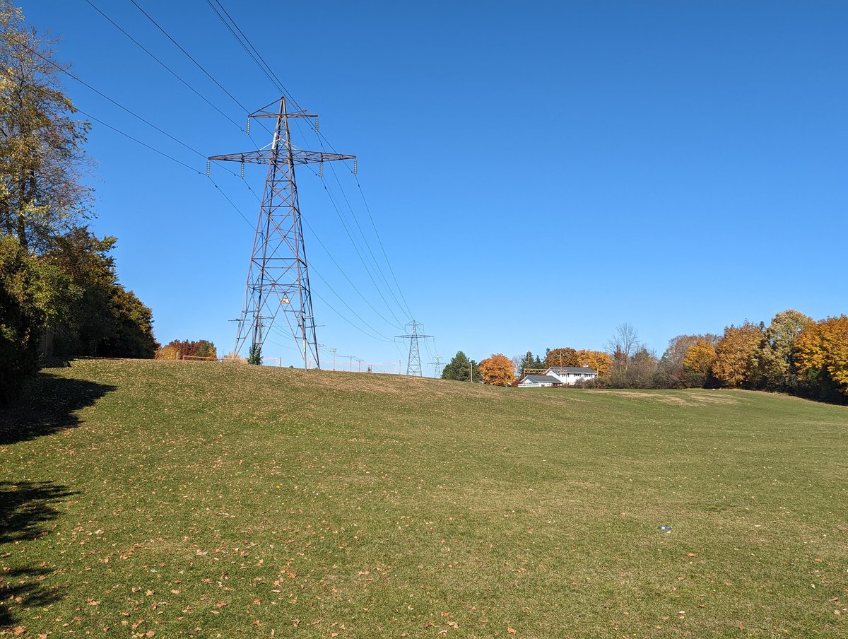 Along the Speed River some more. At the southwest corner of the plant, the two sets of hydro lines split, right at the city’s technical border. One corridor heads along County Road 124 to Cambridge. We’re sticking with Guelph’s corridor to the north.