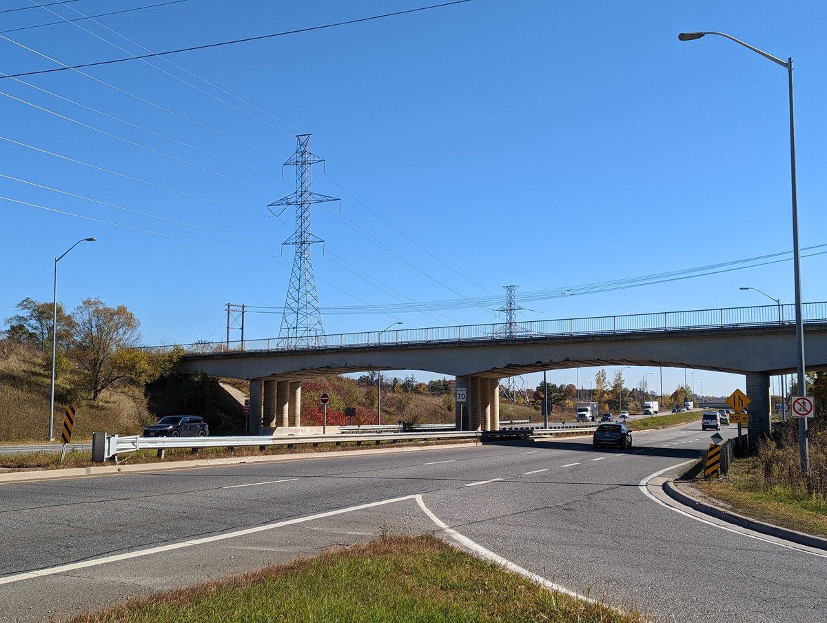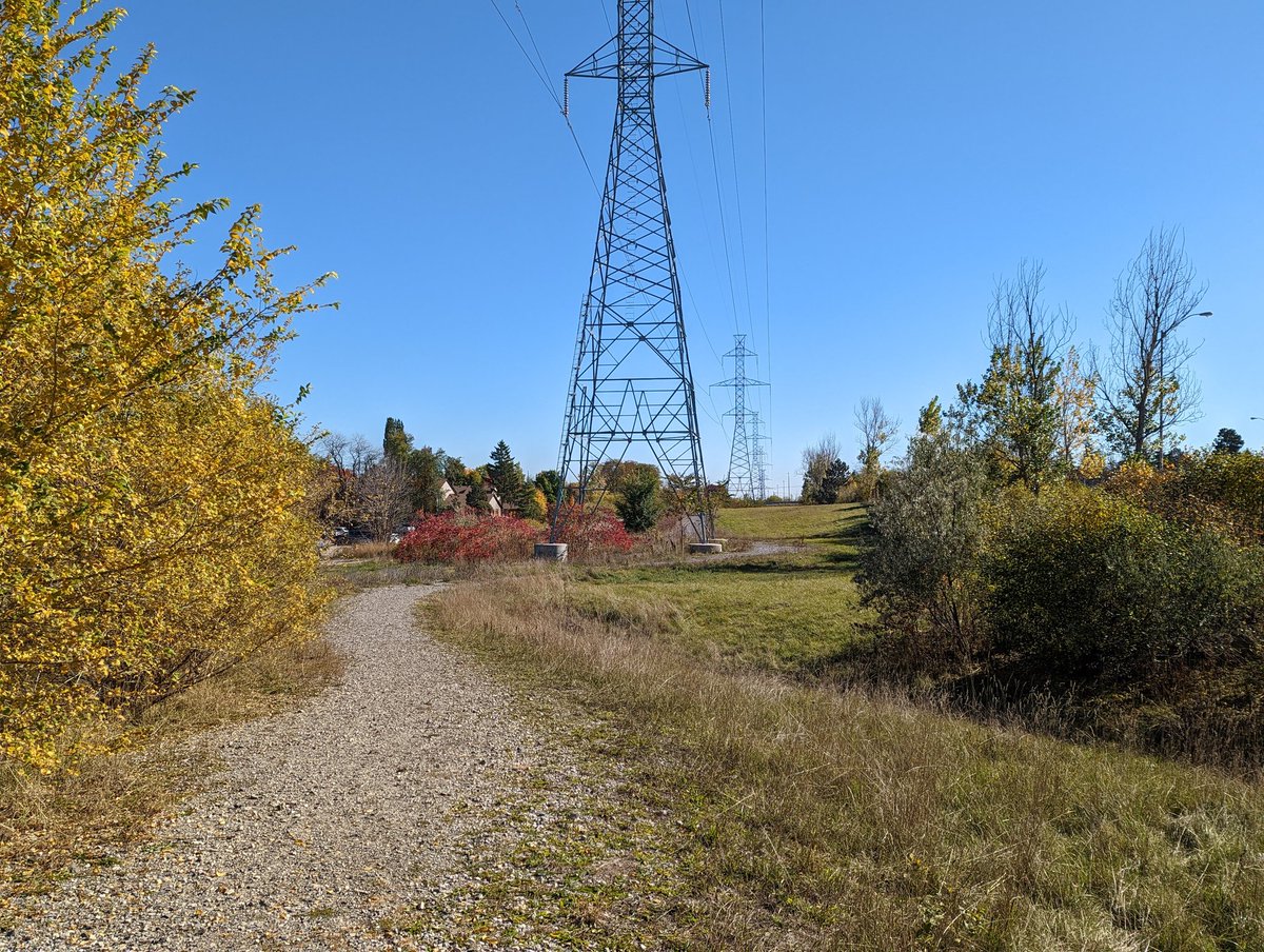 The hydro corridor comes up from the south, crossing the south city border at Maltby Road. As you approach the Laird Road interchange, there’s new towers that must have been put in with the grade separation, but no direct trail crossing. Gotta detour around.