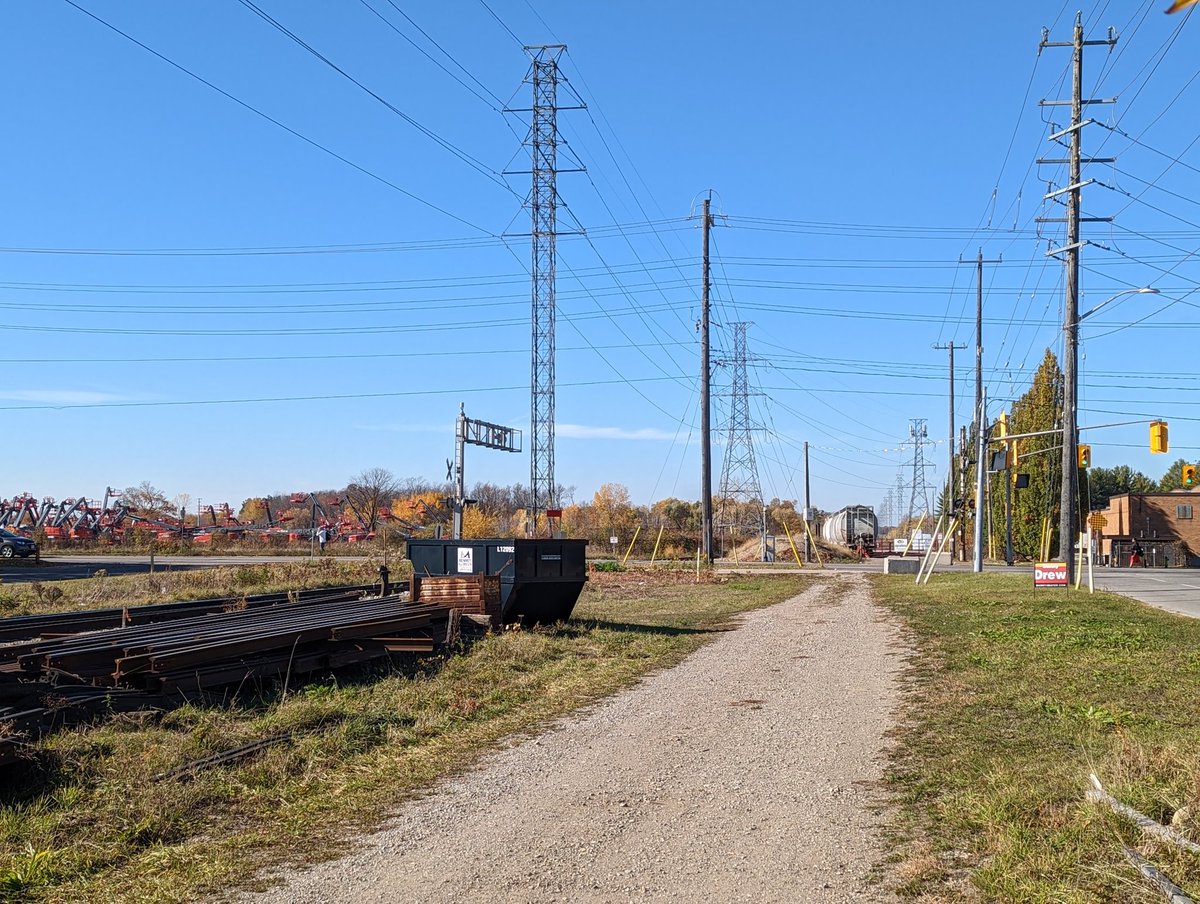 After routing through a transformer station, another 90° turn puts the corridor northward again. This time it parallels Guelph Junction Railway’s South Spur. This takes you up to Woodlawn Road. I was going to go further but industrial lots block it off. That’s today’s walk.