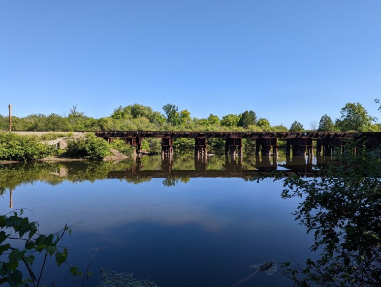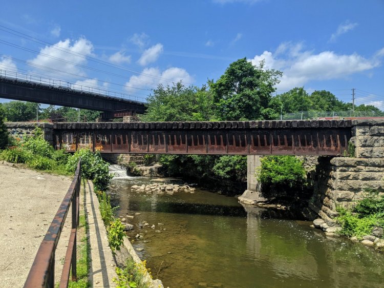 The tracks start bending south as they cross Highway 7. There’s a couple more industrial customers here. Gotta detour down to the Eramosa River to pick back up with the tracks again.