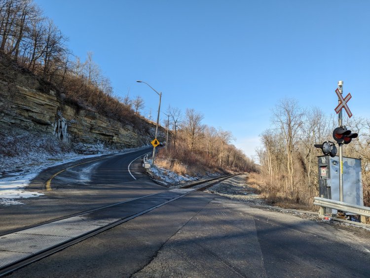 One of the prettiest outcrops I’ve ever seen. An unexpected culvert. Then the tracks come to Stone Road before heading out of the city. That’s it for today’s walk.