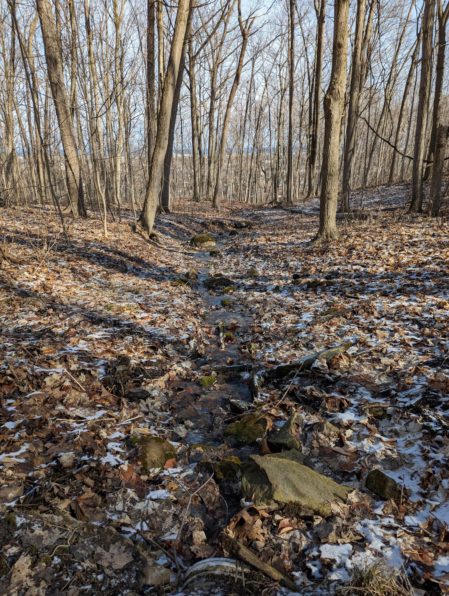 The CP tracks start their descent from the tabletop east of this crossing at Dewitt Road. I’ll have to follow the Bruce Trail to stay with them, but it’s not my only objective today. Two waterfalls are near the crossing: Ridge and Dewitt Falls.