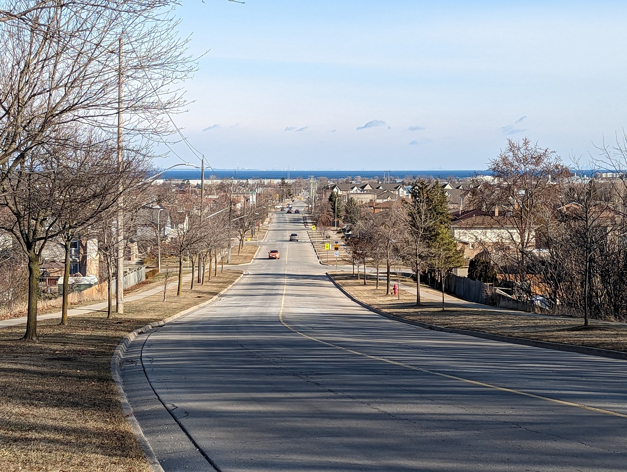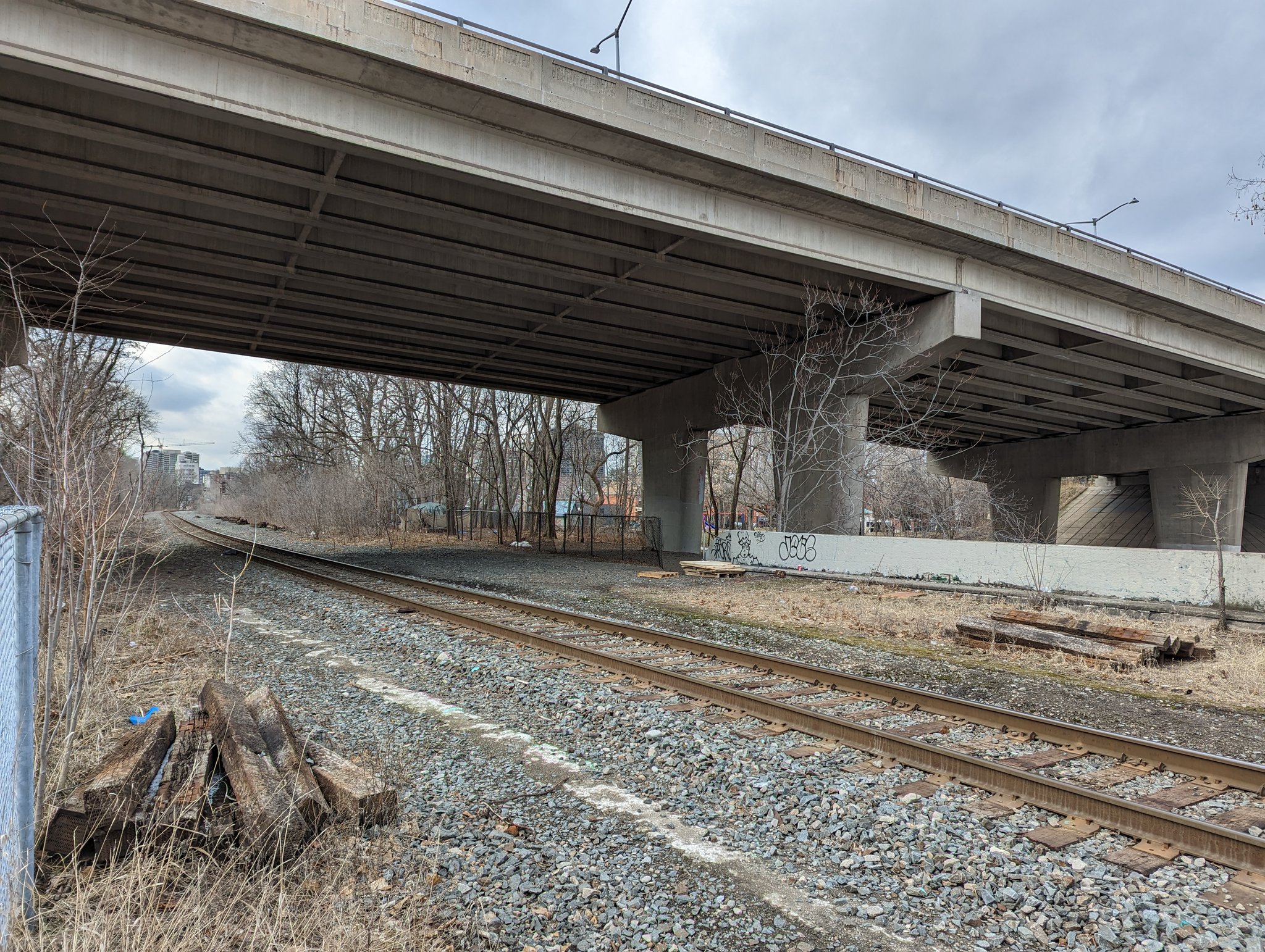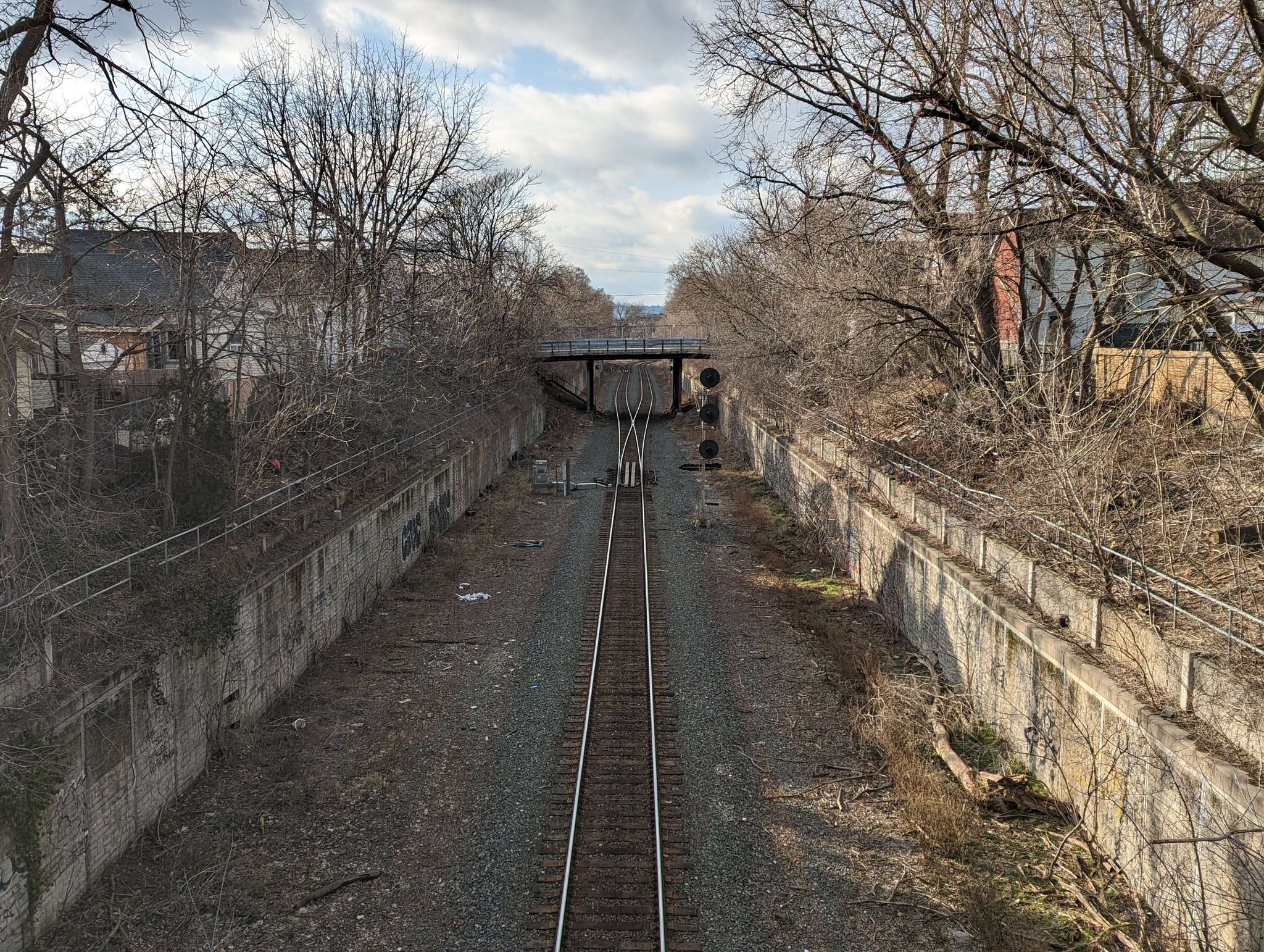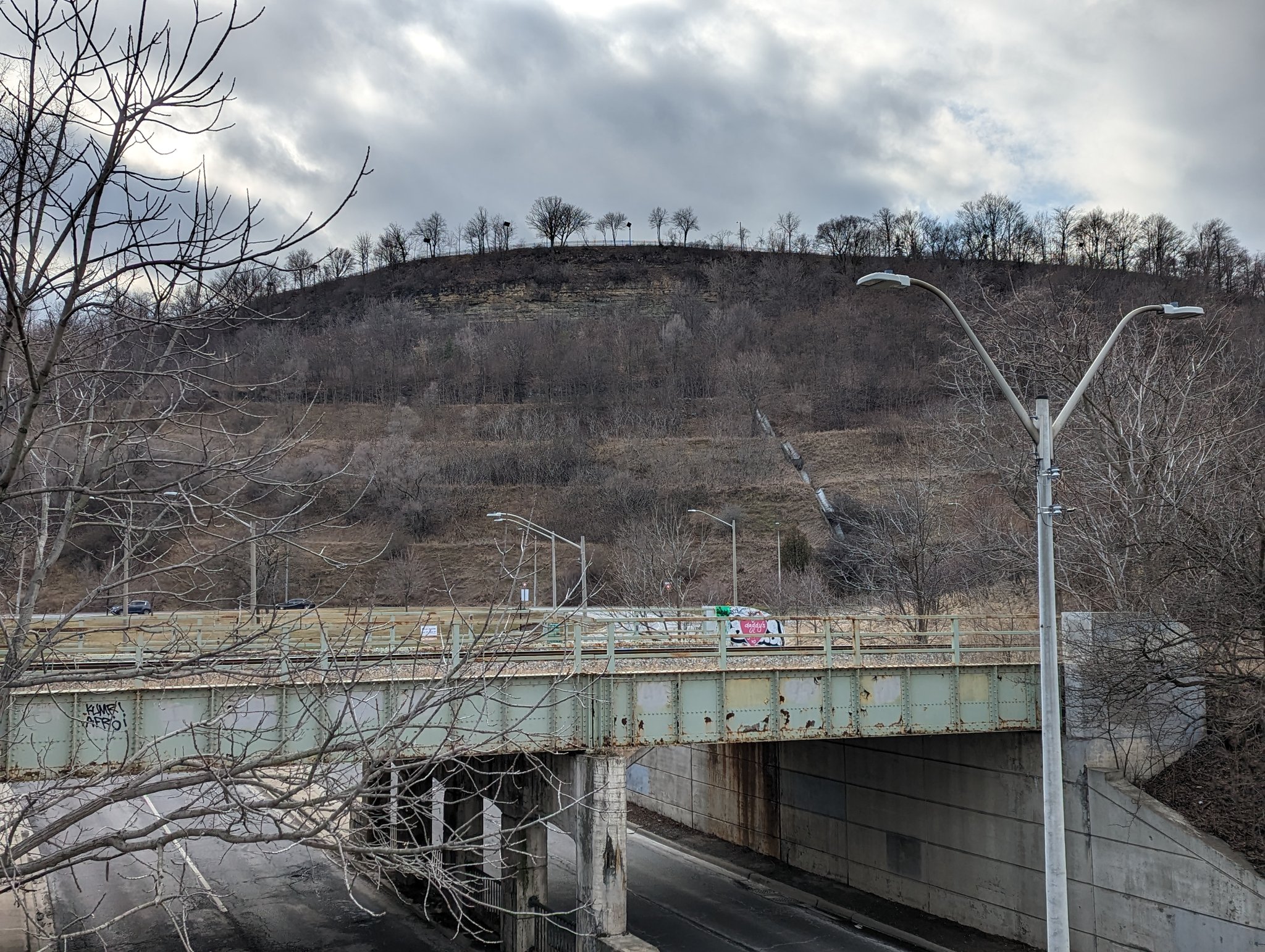 A bit more zagging through low-density streets until Lawrence Road, which is directly adjacent to the tracks. The Kenilworth Access starts up the escarpment on the other side, so you could argue this is the toe of the mountain. Downtown is now coming into view.