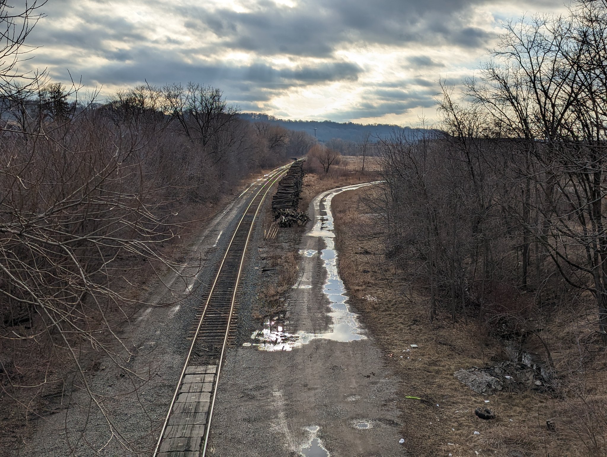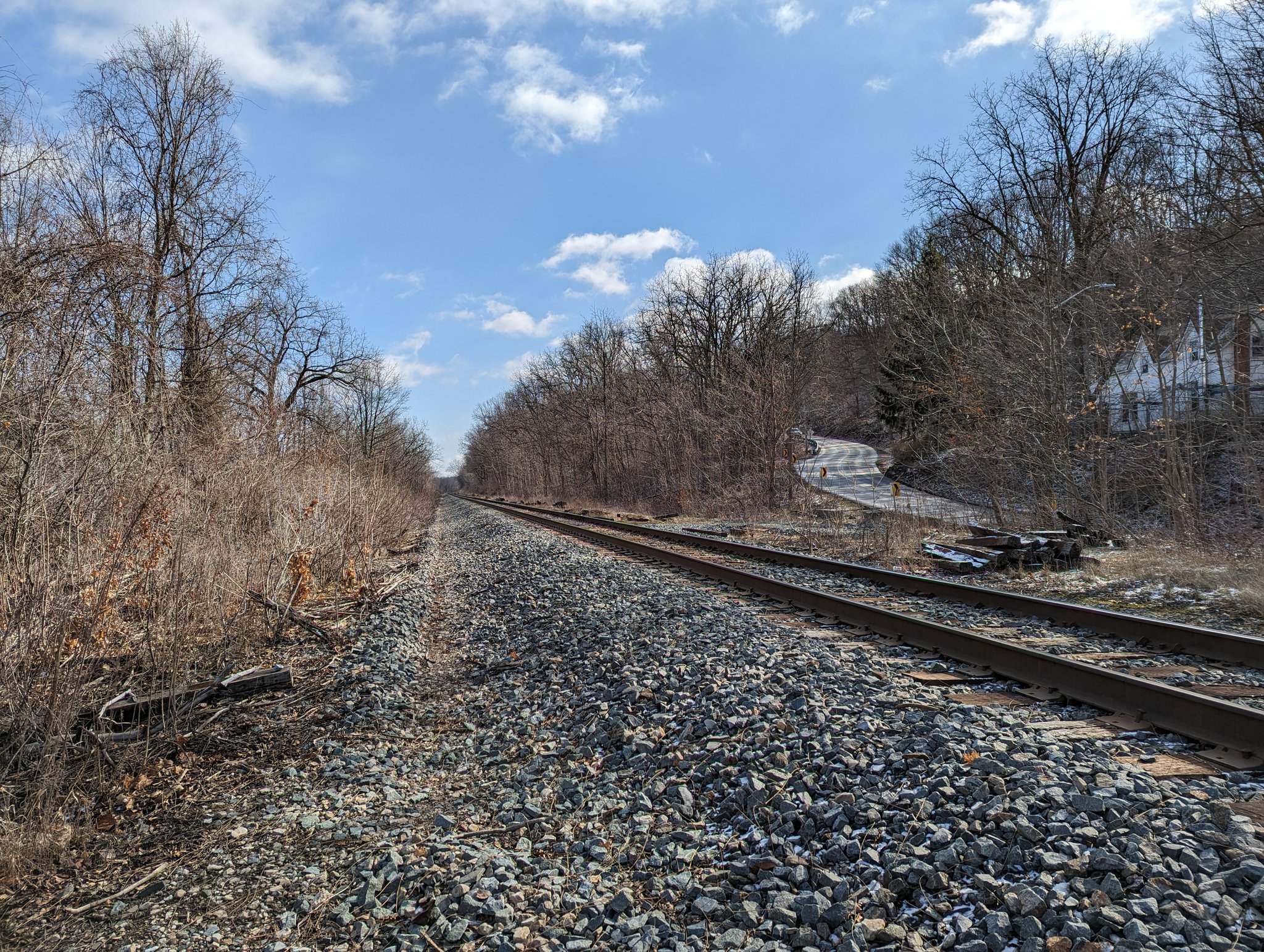The trail’s topography continues to be dramatic, and takes you to New Mountain Road, where you cross the tracks. The bridge and road underneath collude to give you a peek down slope.