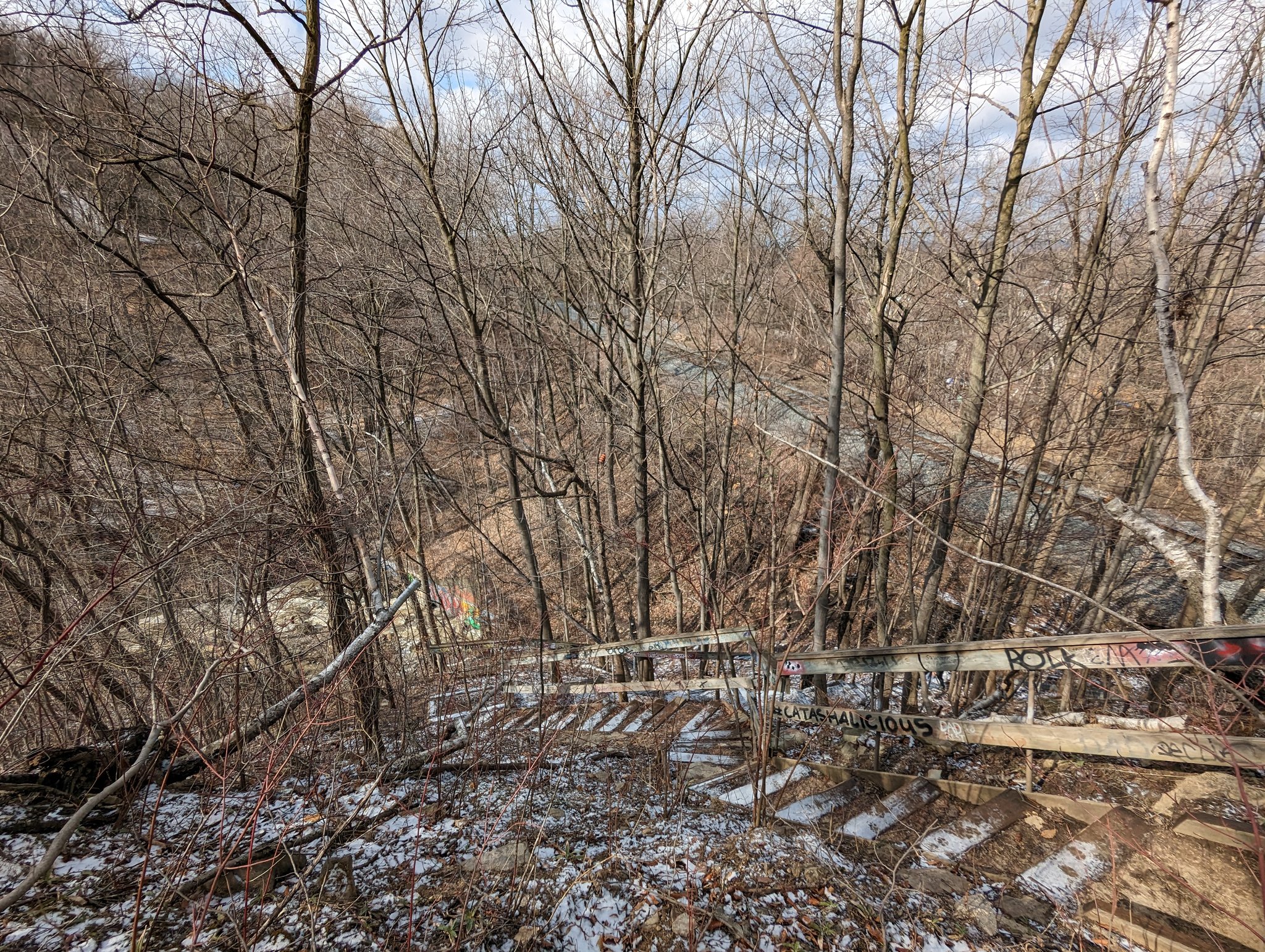 The railway intersects Stoney Creek (the watercourse) near Mountain Ave South. This is home to Devil’s Punchbowl, a famous pair of Hamilton waterfalls consisting of the upper falls and lower falls / cascade. This also marks the end of my documentation of falls near the tracks.