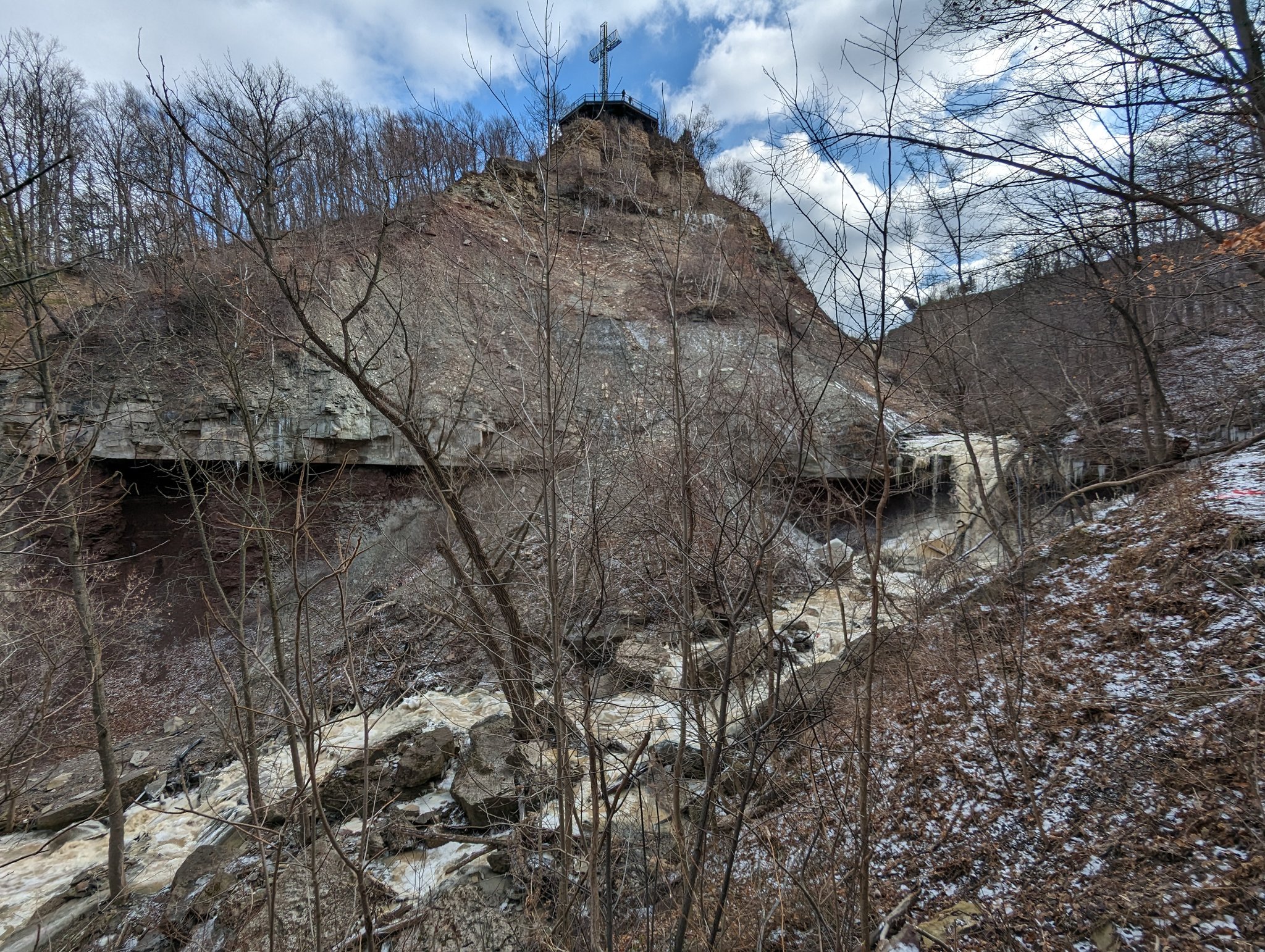 Down the eroding escarpment face and onto the trail below. The tracks keep making their cut above, and you cross the downstream cascades.