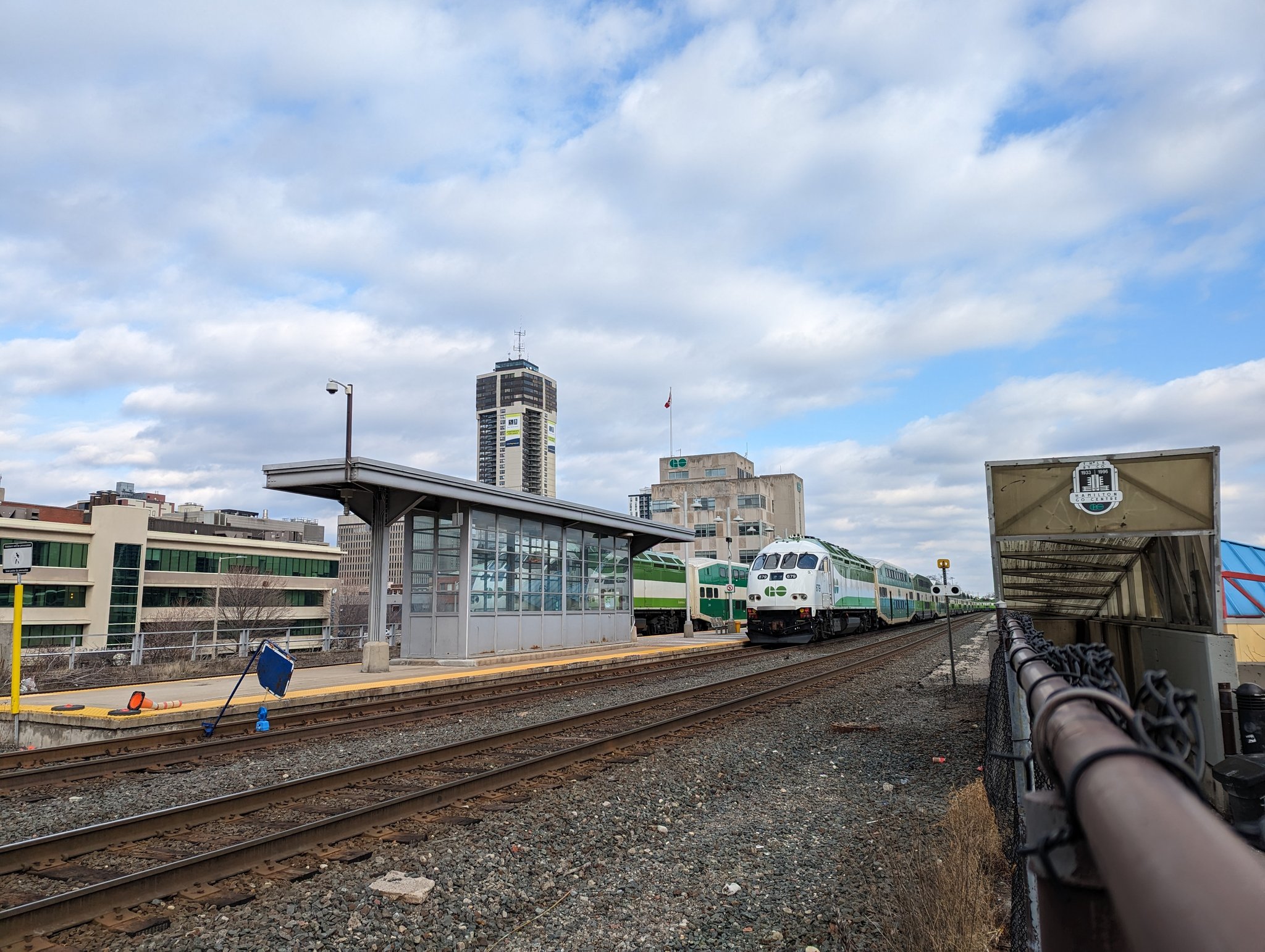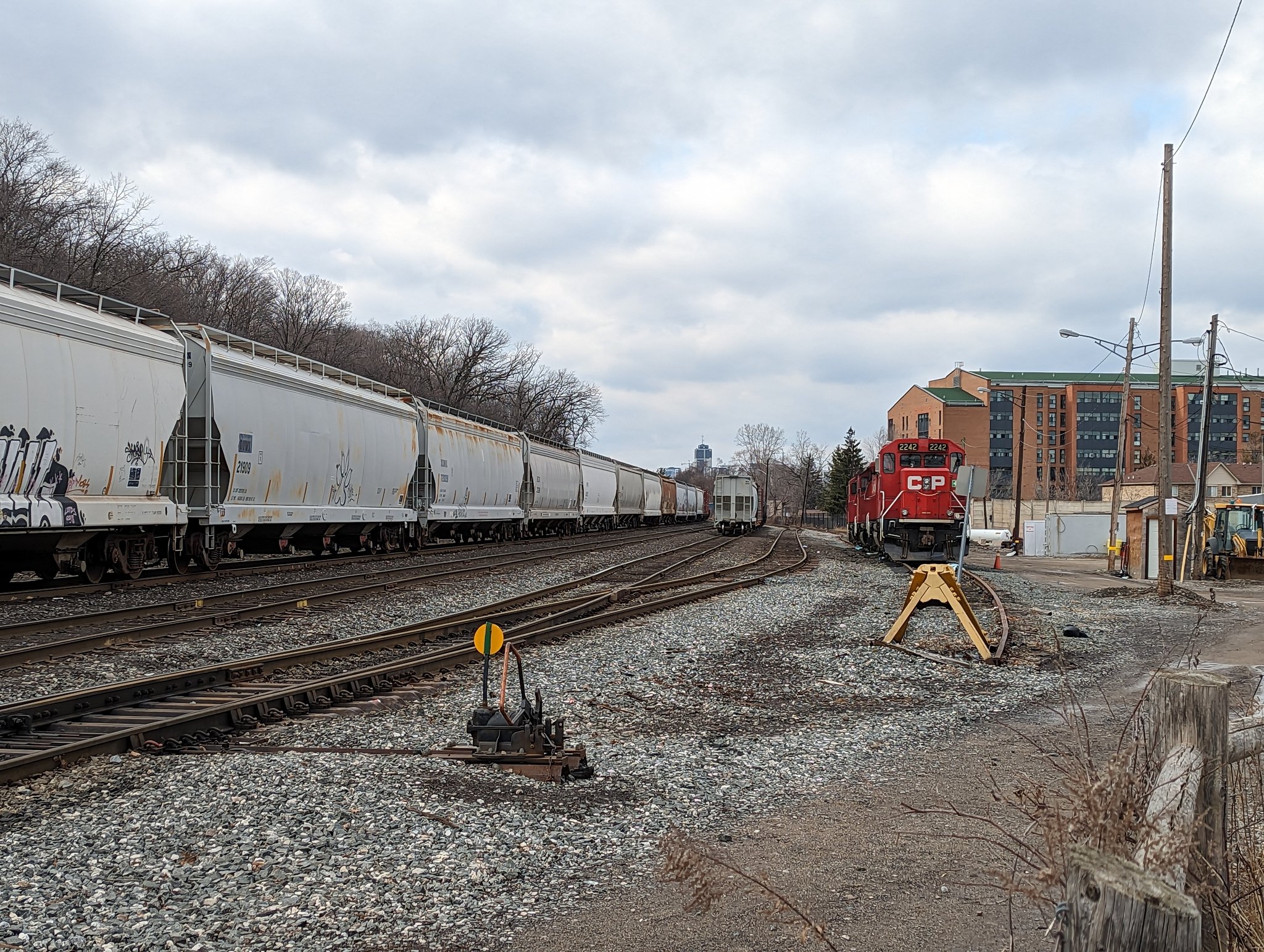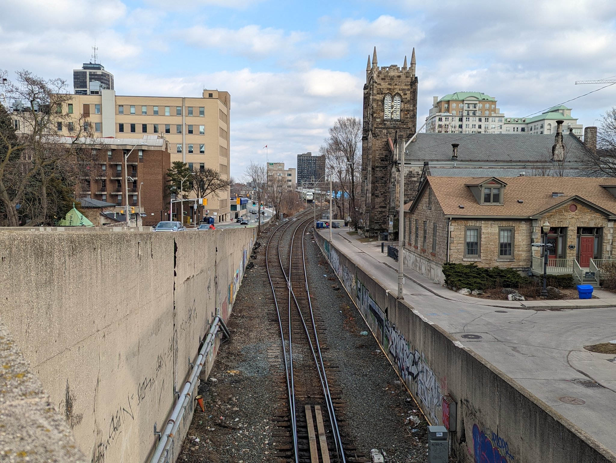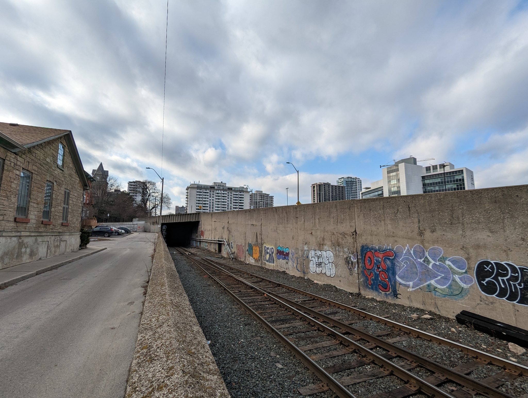Past a wye that connects CP to the industrial harbour, and along Cumberland. Lots of old townhouses and past industrial/commercial use between this avenue and the tracks. Towering apartments and a hospital on the brow. Across the tracks to the Escarpment Rail Trail.