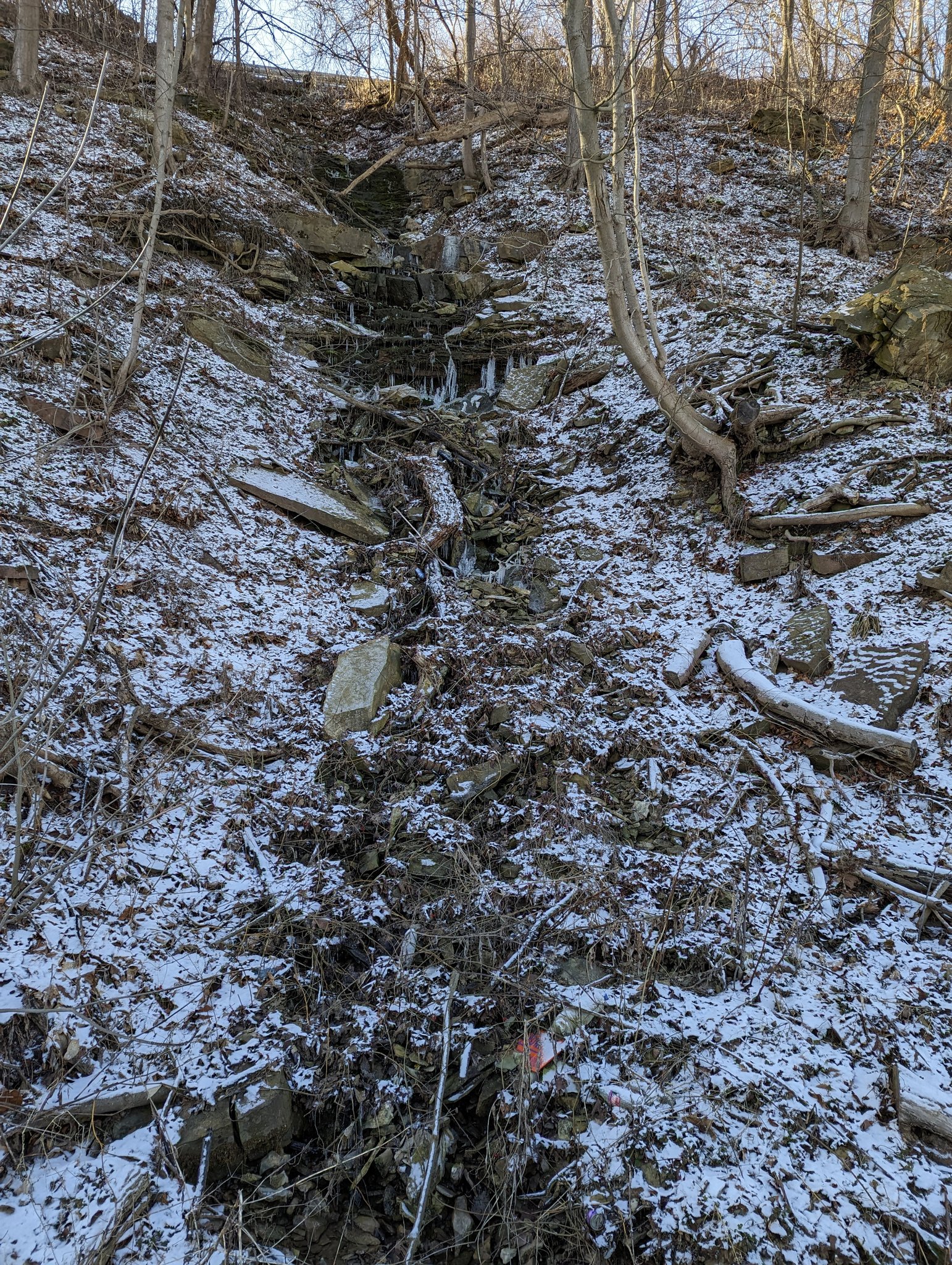 The line between a waterfall and riffled stream is very fine. Same goes for the line between a surface stream and groundwater seepage. The way the railway berm pools water uphill and downhill also messes things up.
