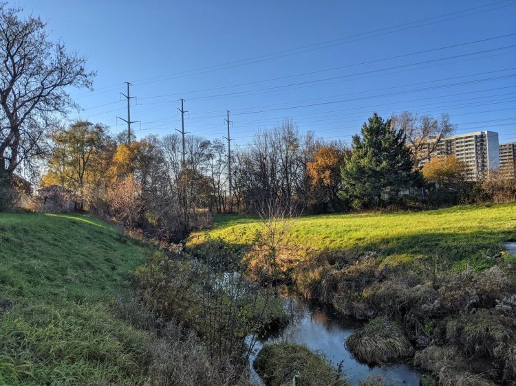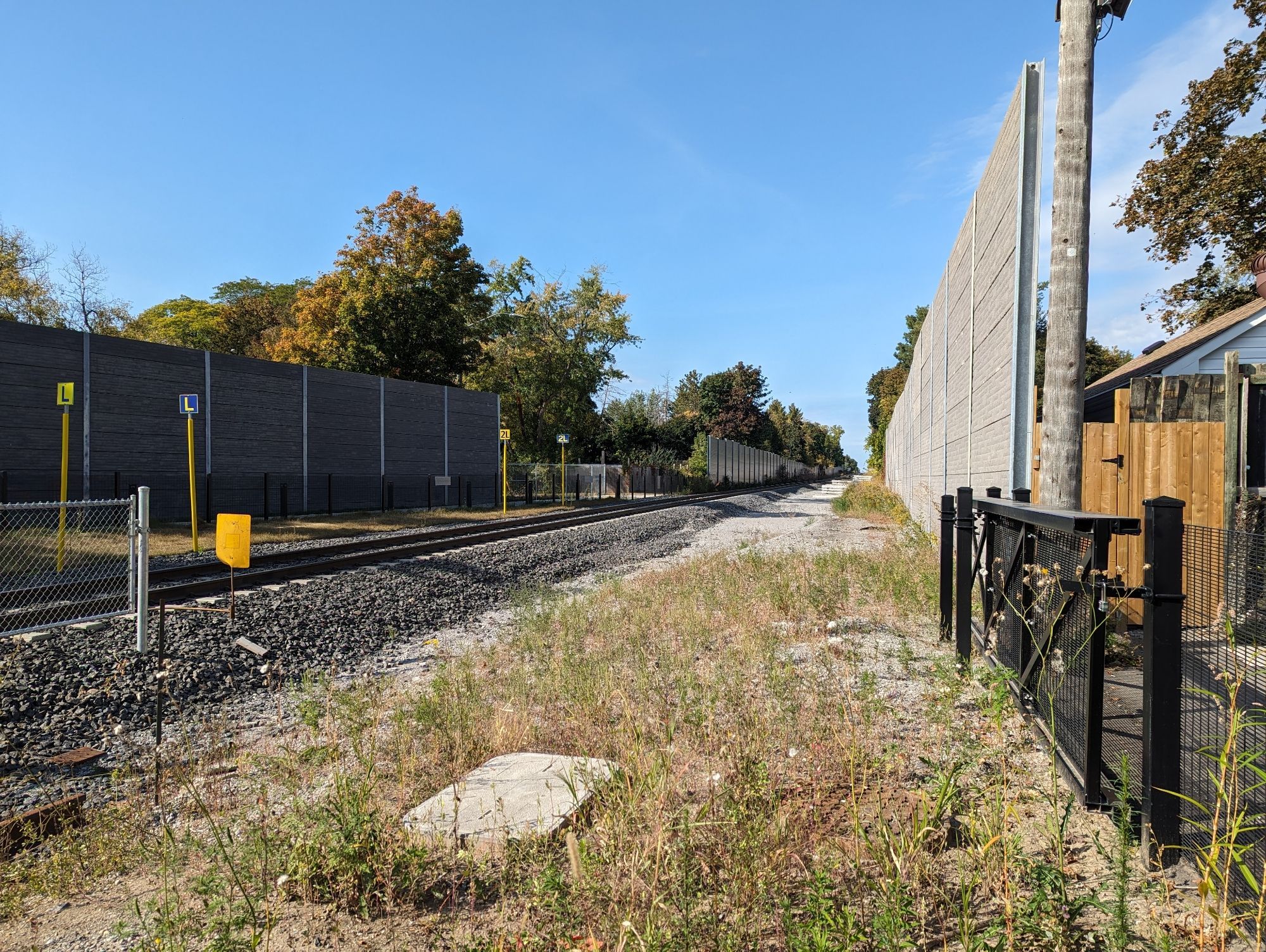 Not many spaces parallel to the line or crossing it north of Agincourt. Havendale Park has a good neighbourhood connection. Trainspotting at Finch.