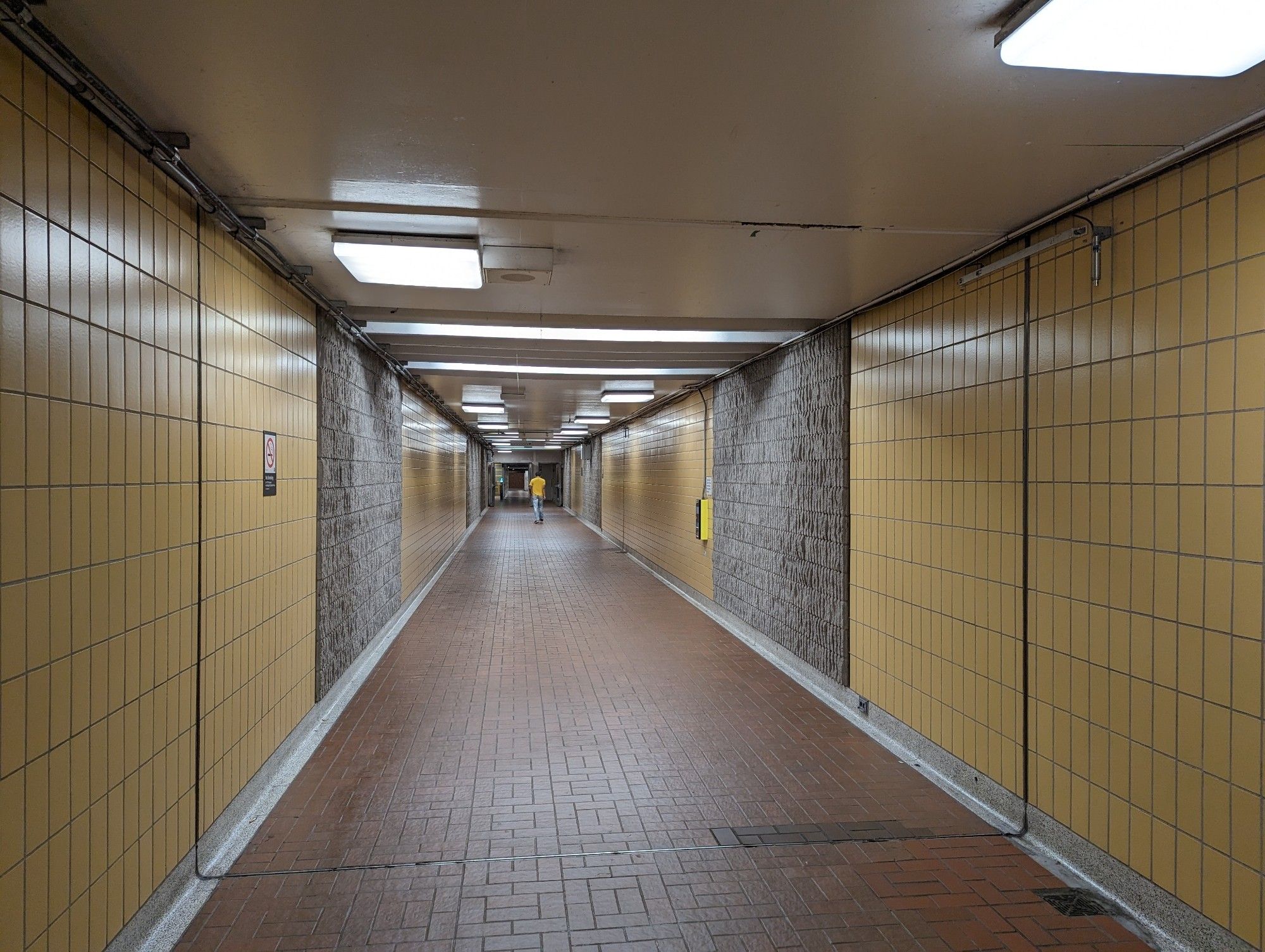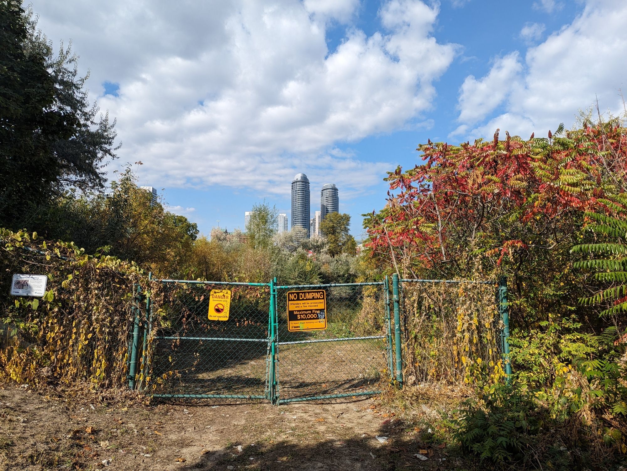 Once we get around the transformer station, we return to the corridor at Lawrence Station. The road overpass is similar, but unlike Kennedy, this station is completely shuttered as there’s no other transit connections. Poking around in here also shows us an open but fenced link to the Meadoway.