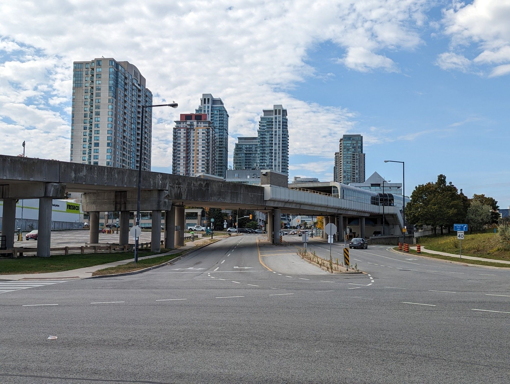 I tried to get under the guideway, but much of it is fenced off. After trudging in the concrete channel for West Highland Creek’s main branch, I get a glimpse of the guideway’s beauty. A detour back down to Ellesmere Road, and then you get a clear shot of the guideway into Scarborough Town Centre.