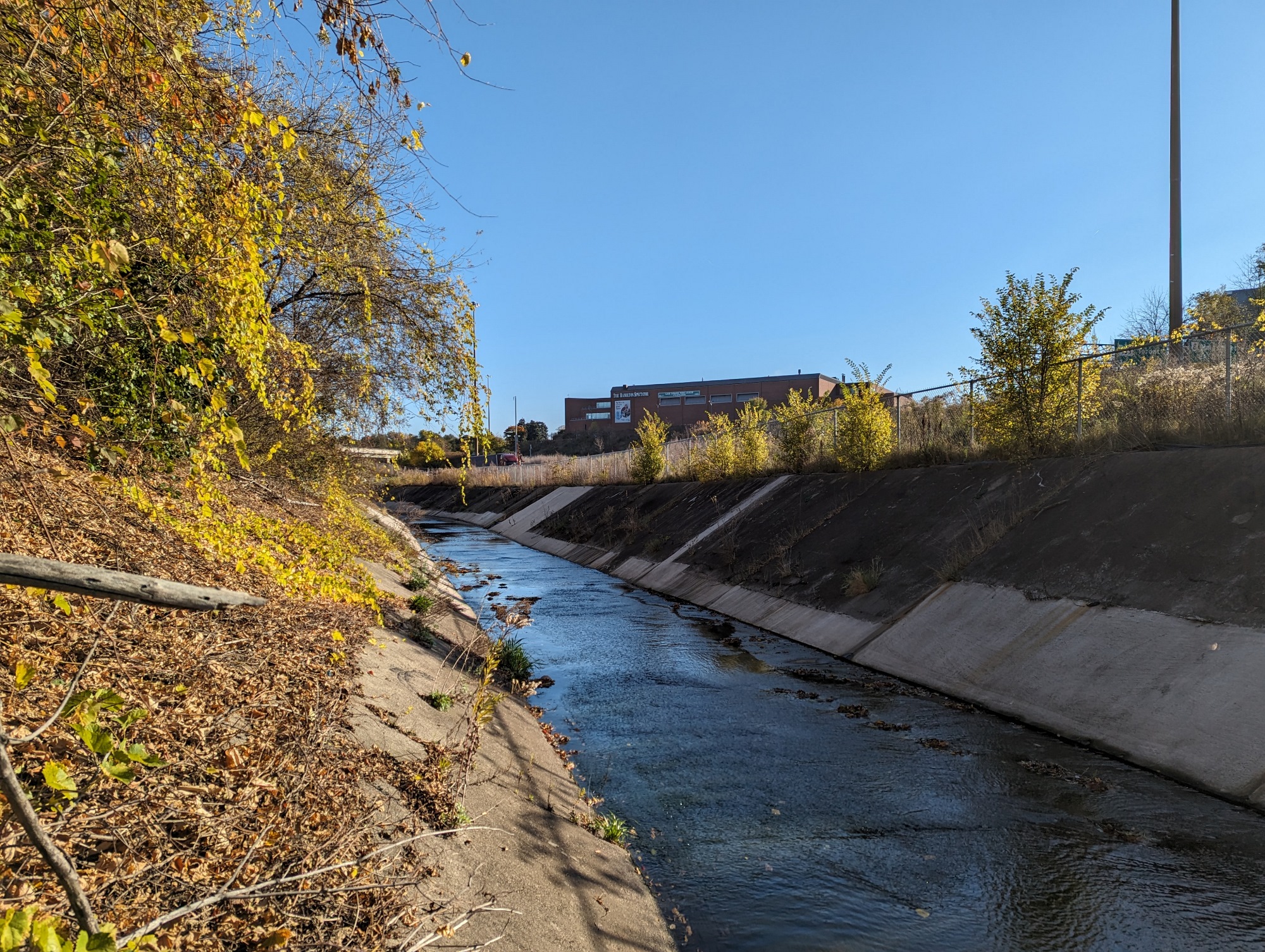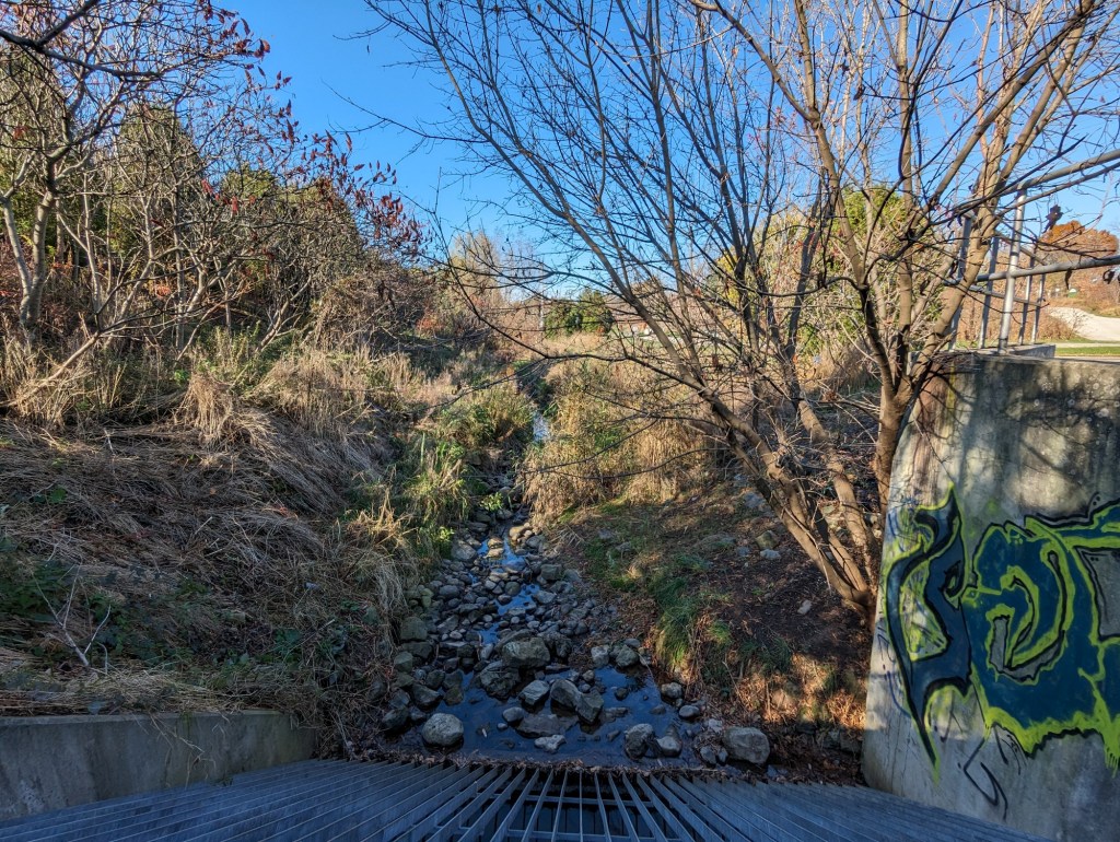 After getting pushed to Macklin Street, there’s a glimpse of the creek at Glen Road, where it pops out of a culvert. It’s then buried until south of Main, where we come to a concrete channel next to the 403.