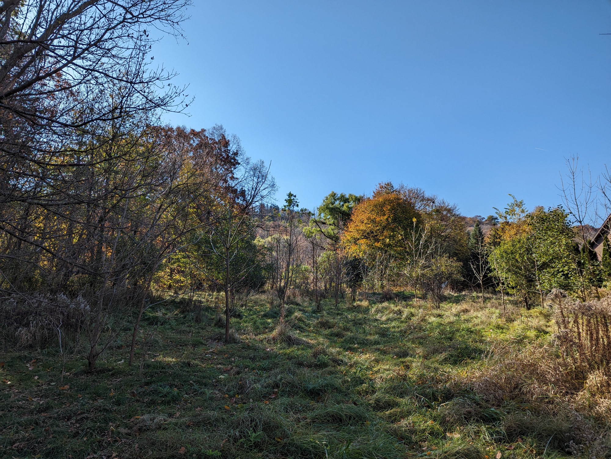 A quick jaunt through the woods brings you to the edge of White Chapel Memorial Gardens, and another small tributary that is the outflow of Scenic Falls. No dramatic falls on the north side. Now for a big detour around the 403 to the top of the mountain.