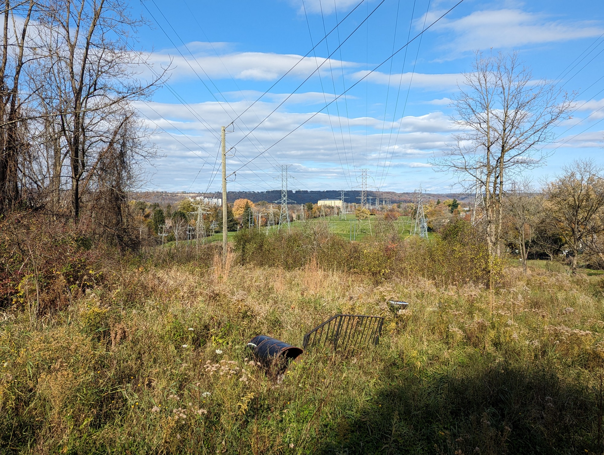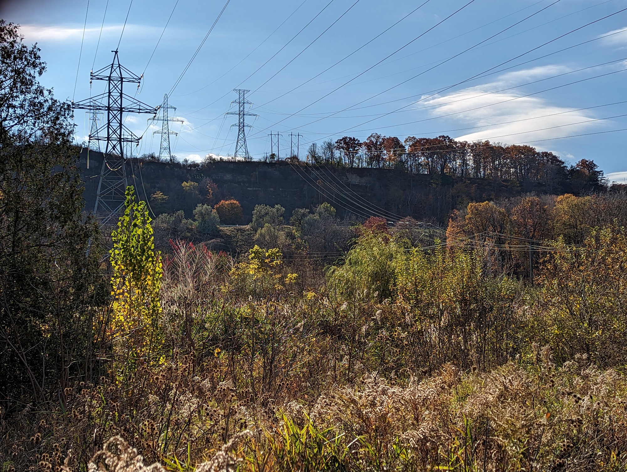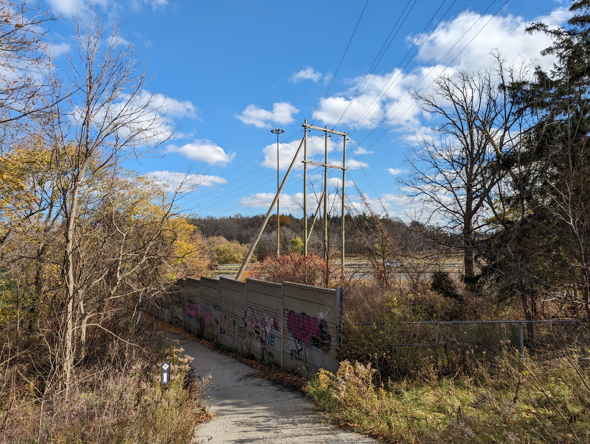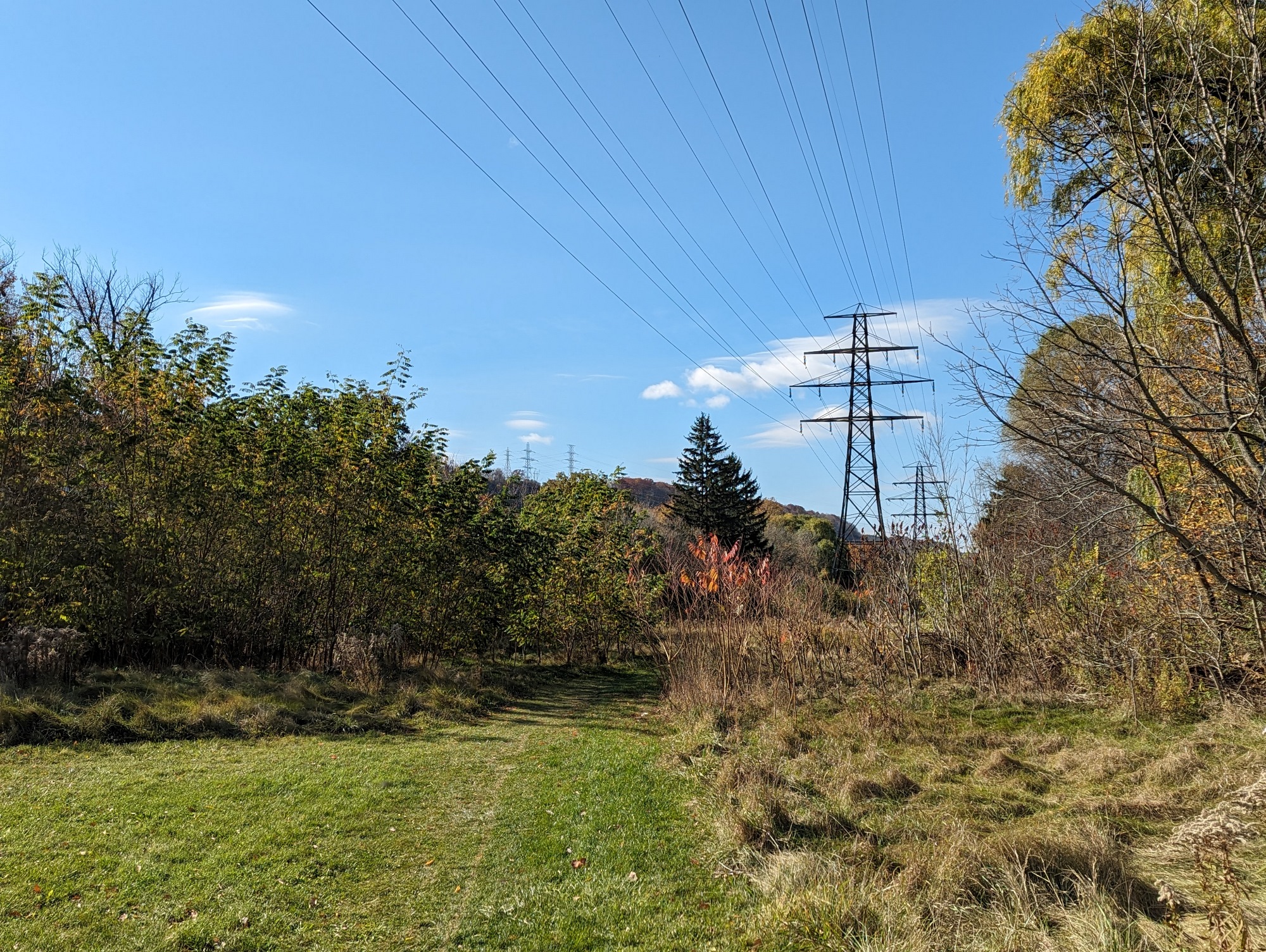The trail along the hydro corridor / Chedoke Creek culvert actually starts west of Bowman Street, as there’s a two-block gap. After a couple bends, you meet Hamilton’s Dundas Mountain Hydro Corridor.