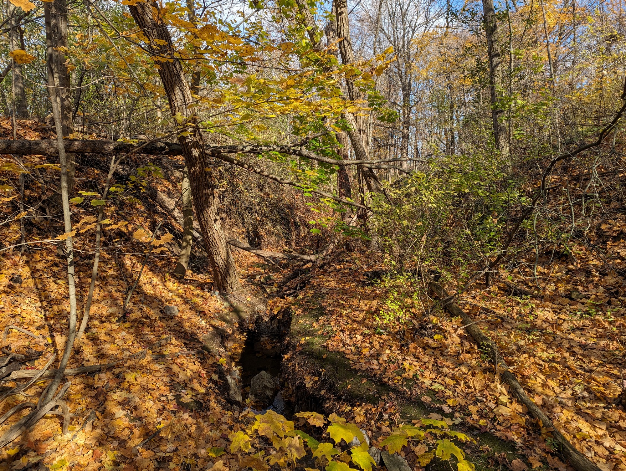 North of the Escarpment Rail Trail, hints of East Chedoke’s power. This culvert is not functional anymore. All flows are diverted underground. What remains of this gully now forms part of private backyards along the adjacent street.