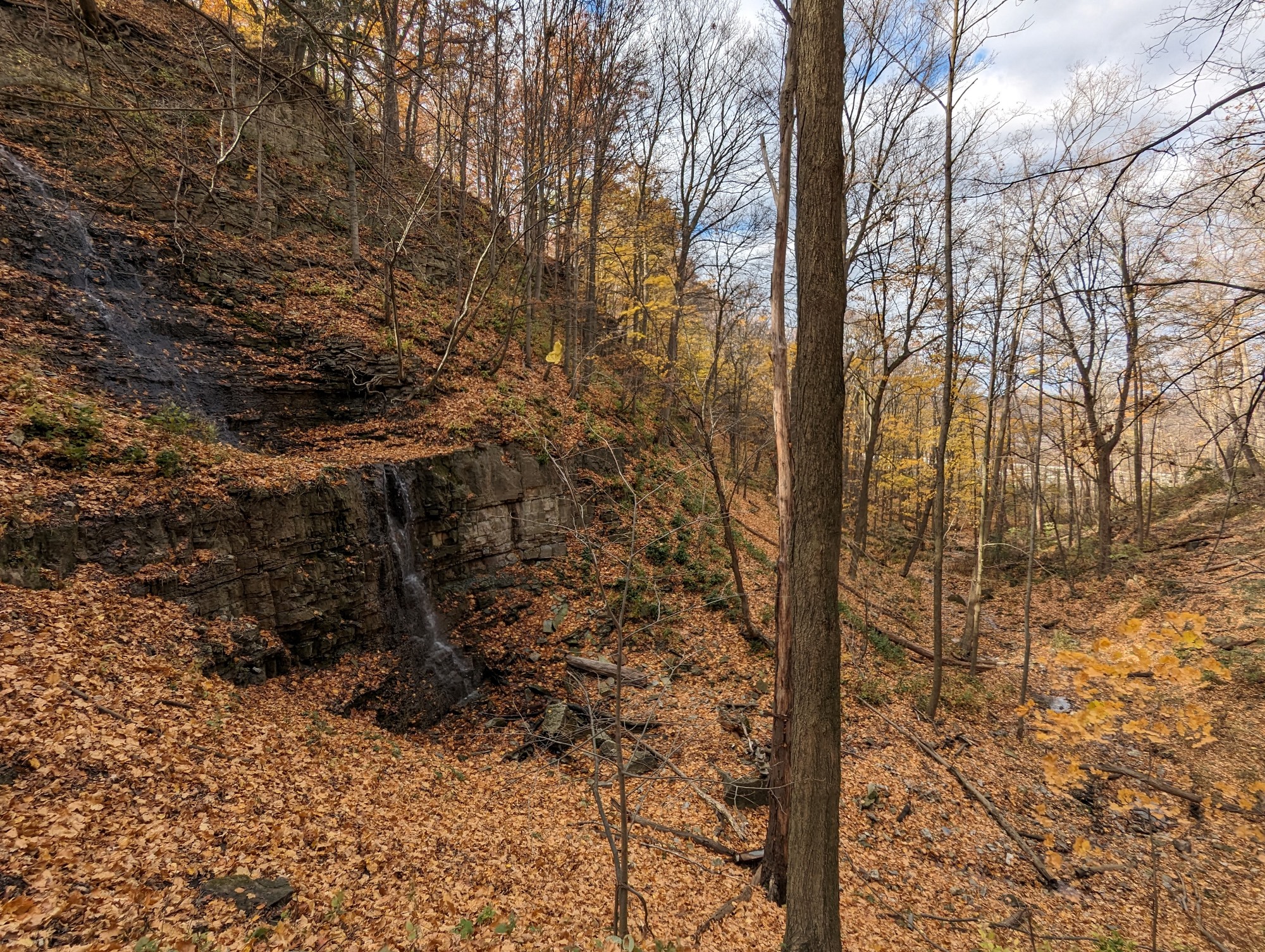 After some hunting, I found the trickle that feeds Sanatorium Falls. Not much flow. But at the very least, there’s a new trail linking this and Cliffview Falls. Westcliffe Falls is also visible from a distance, on the east side of the gully.