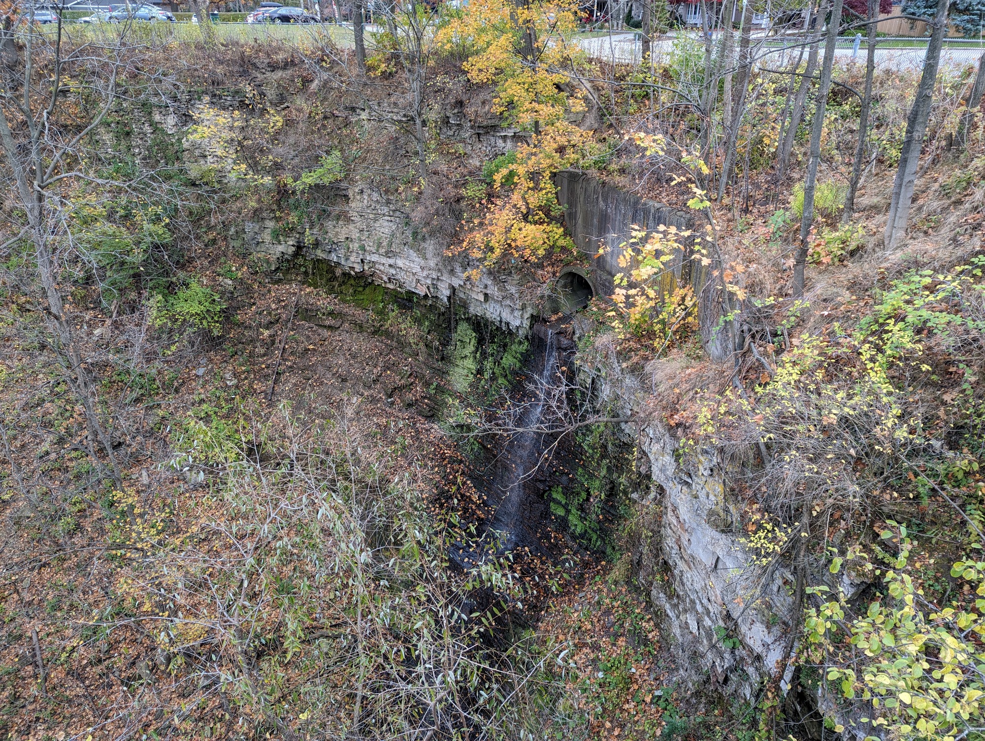 At the trunk hydro corridor, we meet another Chedoke tributary, Lang’s Creek, that is open on the surface. This is the lower reach of the same watercourse that makes Upper and Lower Princess Falls. After snaking up towards the 403, you come to where it flows out of a culvert and over rocks, known as Duchess Falls.
