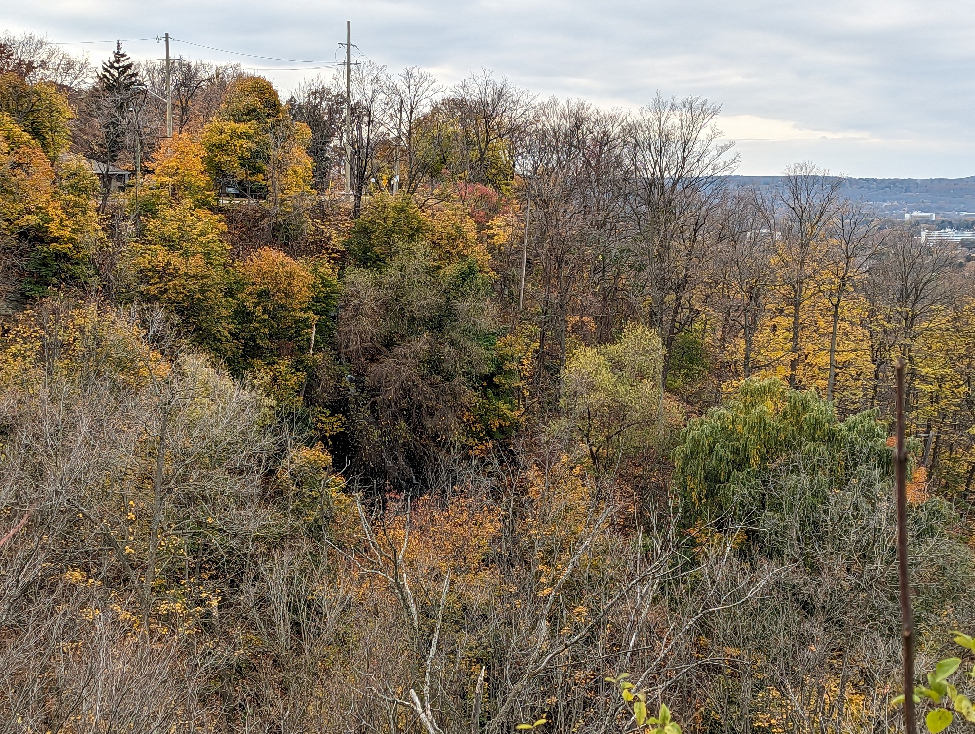 After descending down Dundurn Stairs, I came back to East Chedoke Creek. Went beyond the fence today, and discovered Lower Chedoke Falls. These scenes is emblematic of the whole valley here; steep slopes and active erosion. Getting a bottom view of Upper Chedoke Falls is impossible, if not dangerous. Don’t try this.