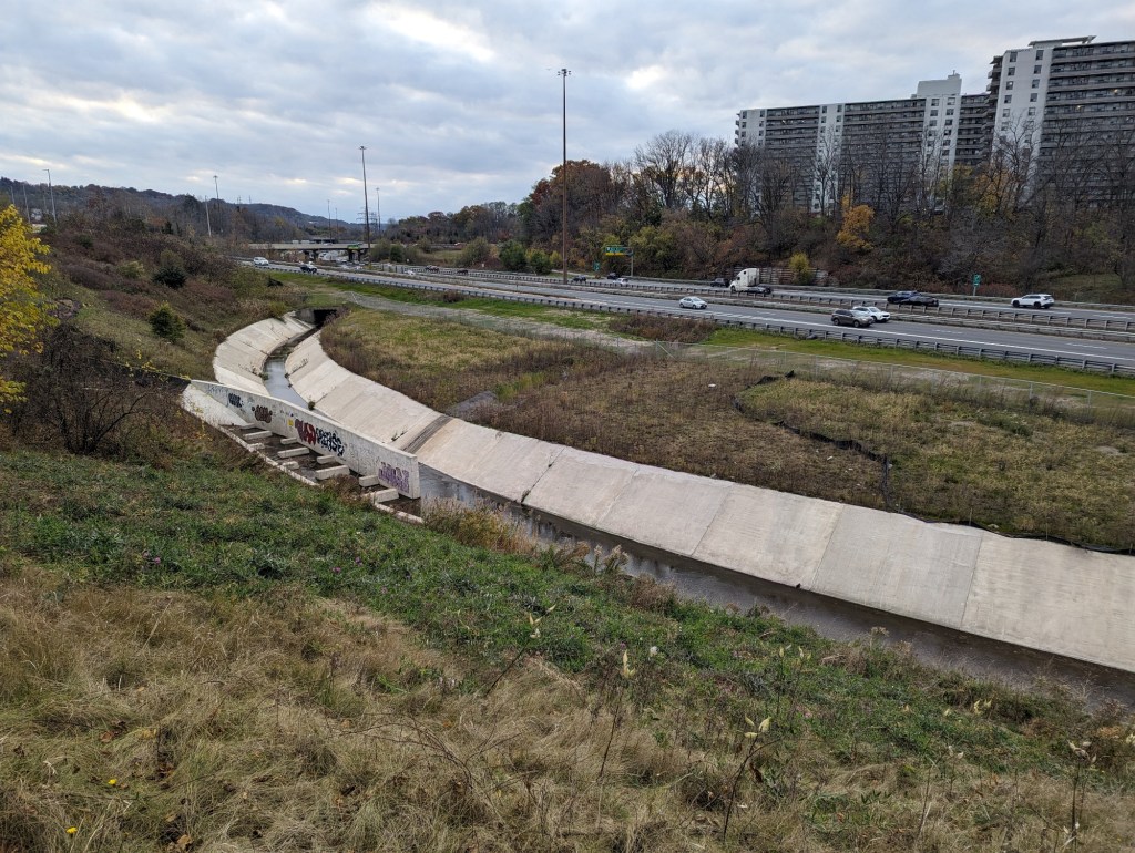 Most concrete channel walls I walk along are less steep than this. These tested my ankles. The creek dives into a culvert at the Longwood Road overpass, but instead of proceeding straight, it actually curves to the south side of the 403 for a bit. Fences and highway ramps push me out of the valley.