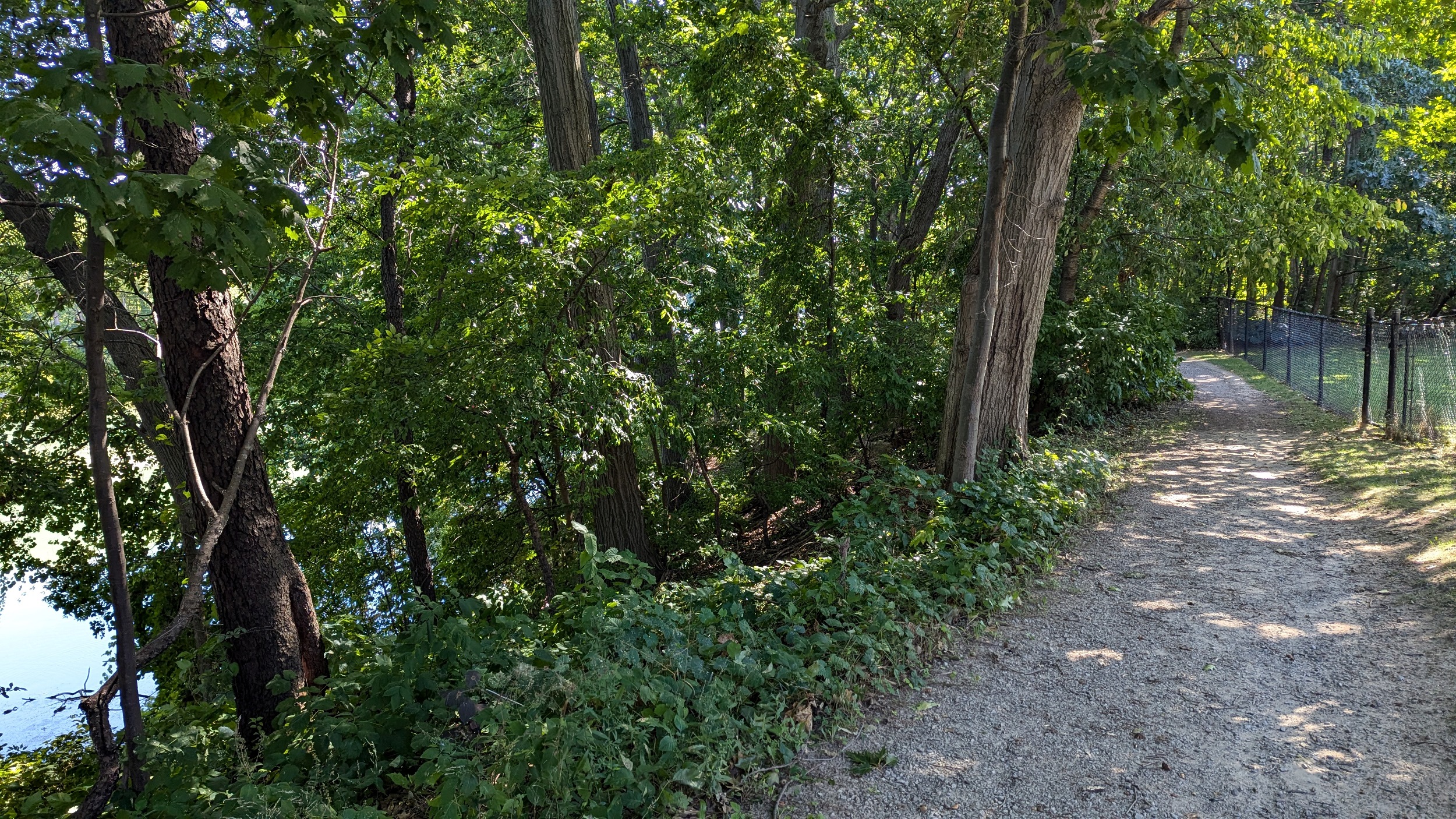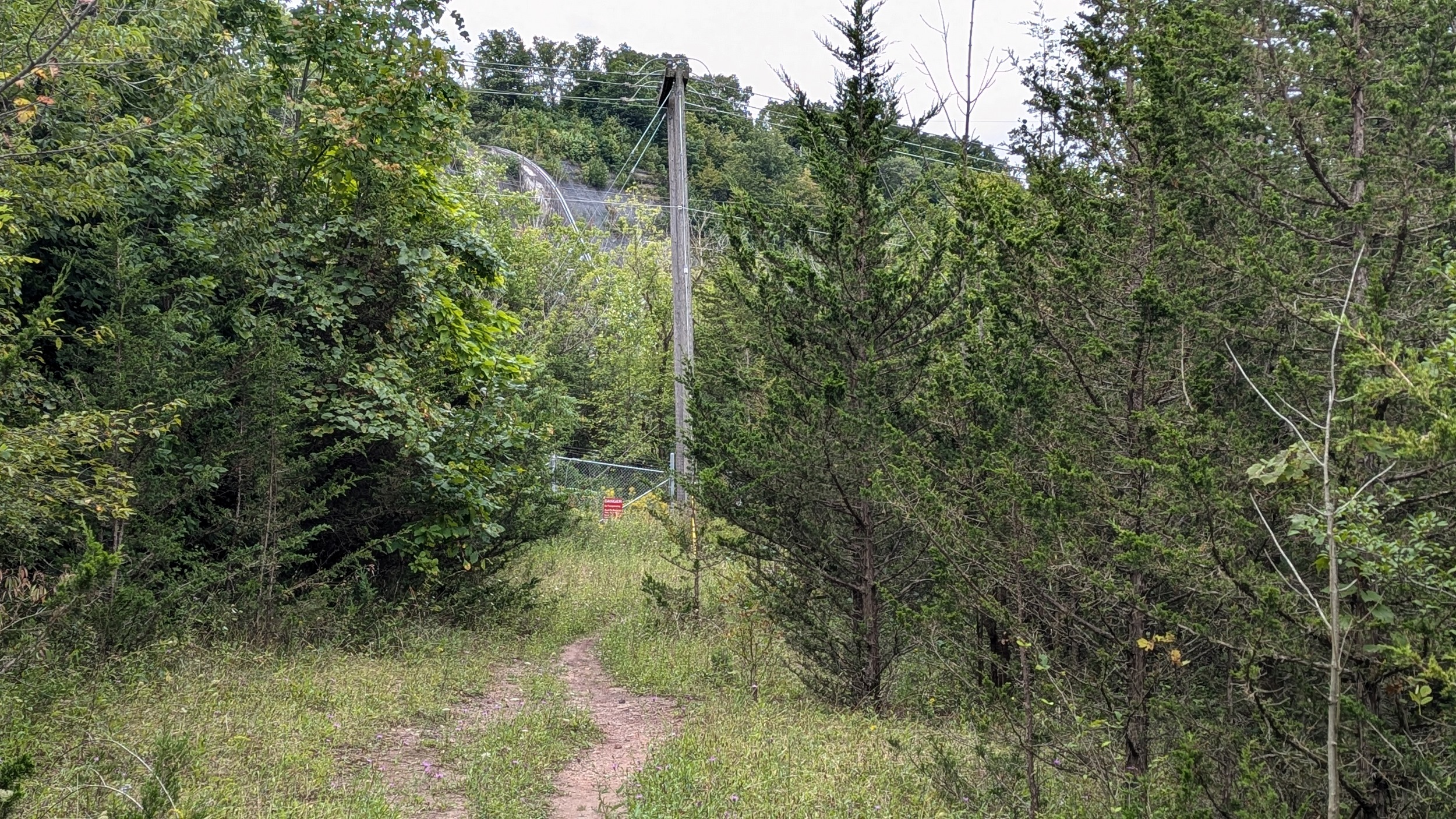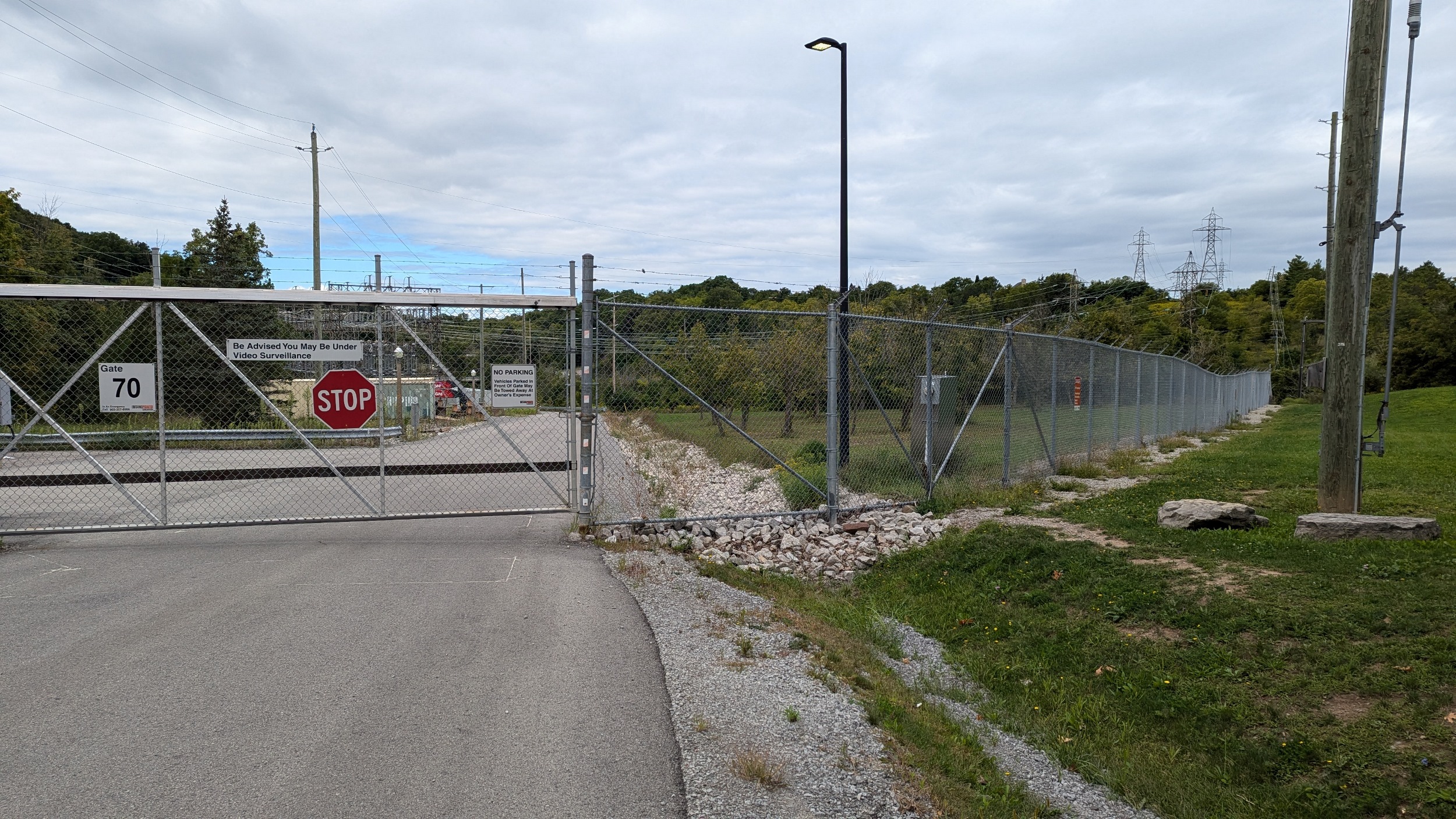 A wide gravel road and winding segment of the Bruce Trail lead you to Lake Moodie, the reservoir inbehind the generation station. There’s a nice view, and then you head along a fence protecting the dam’s intake channel.