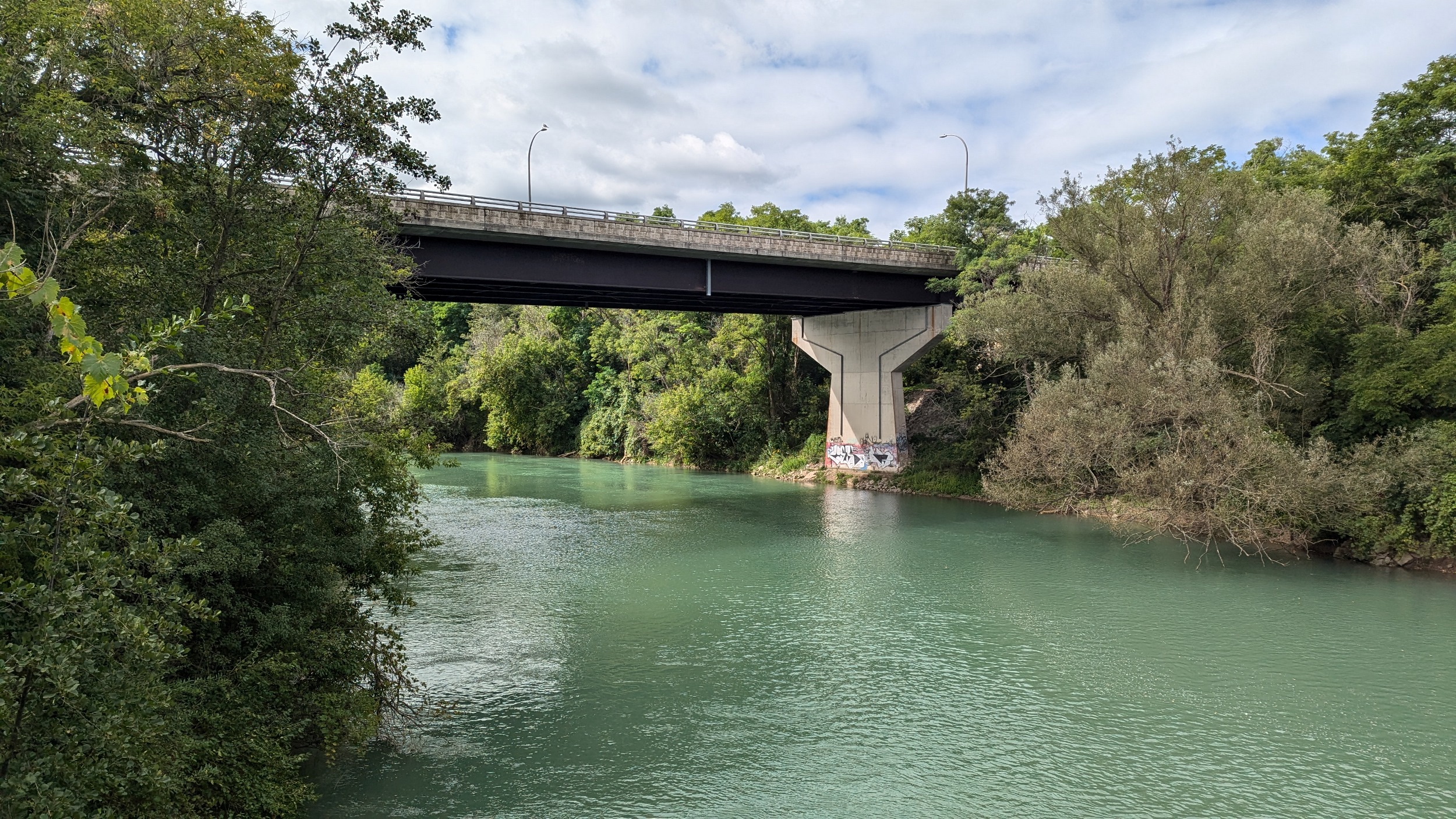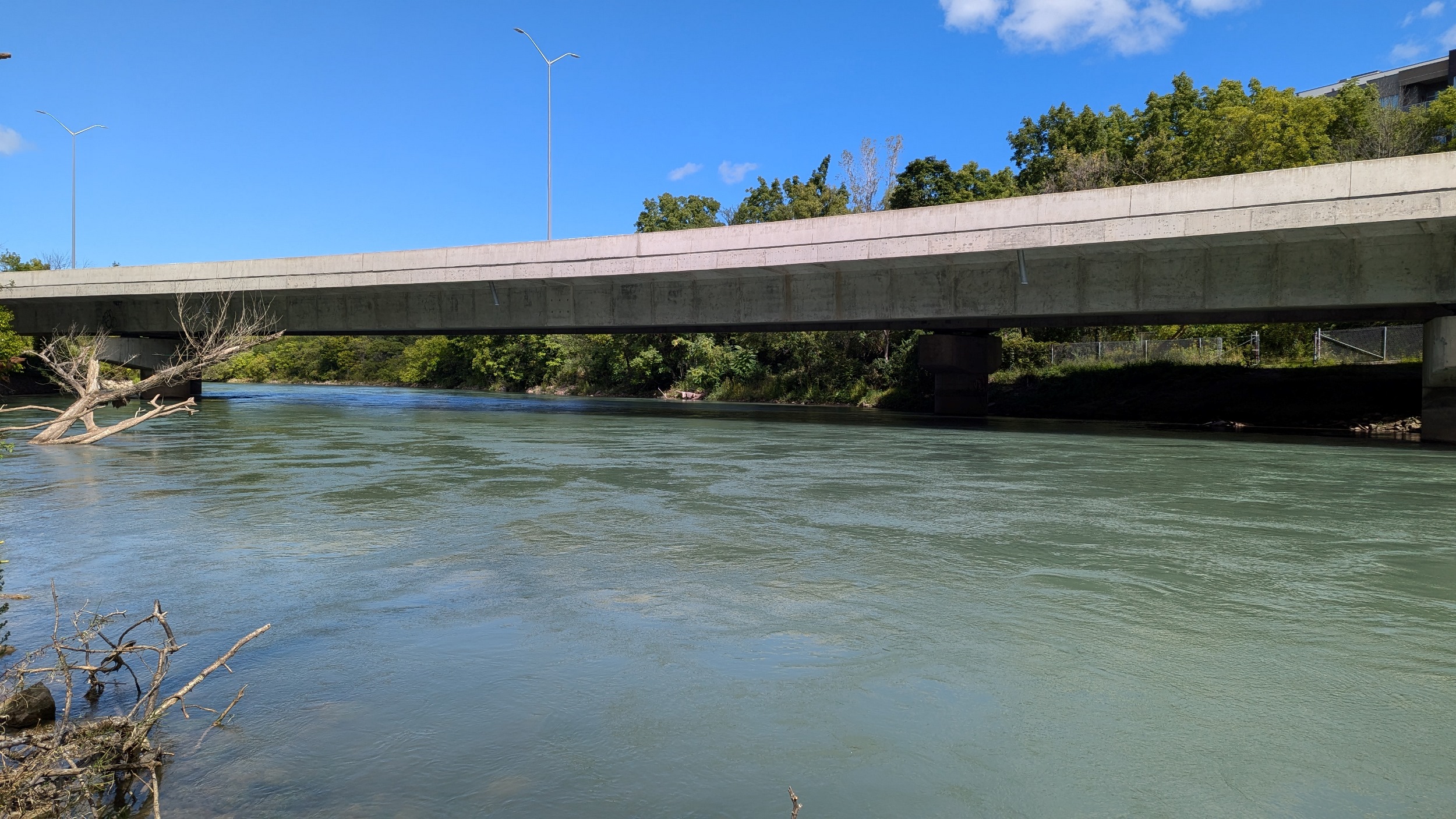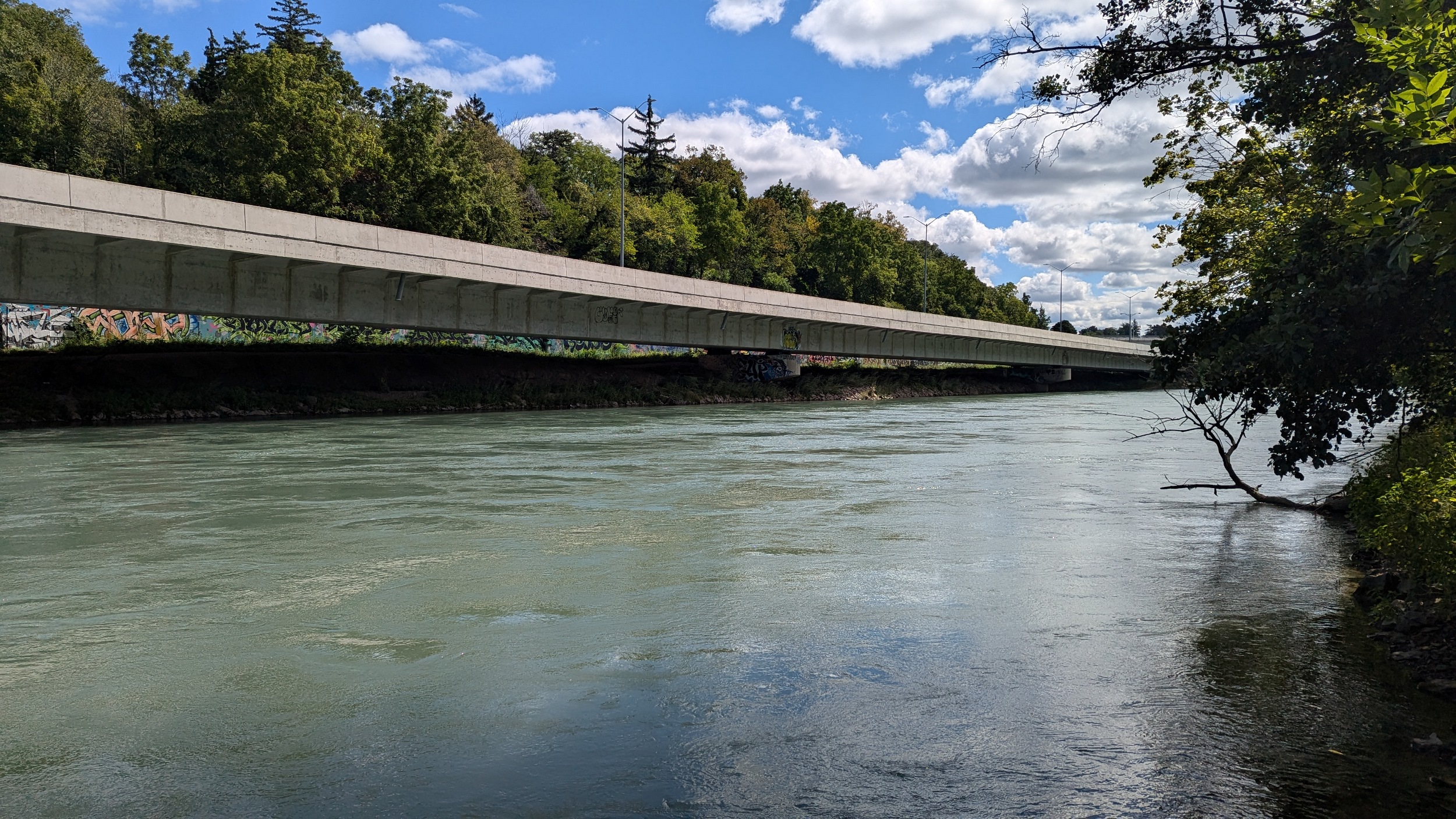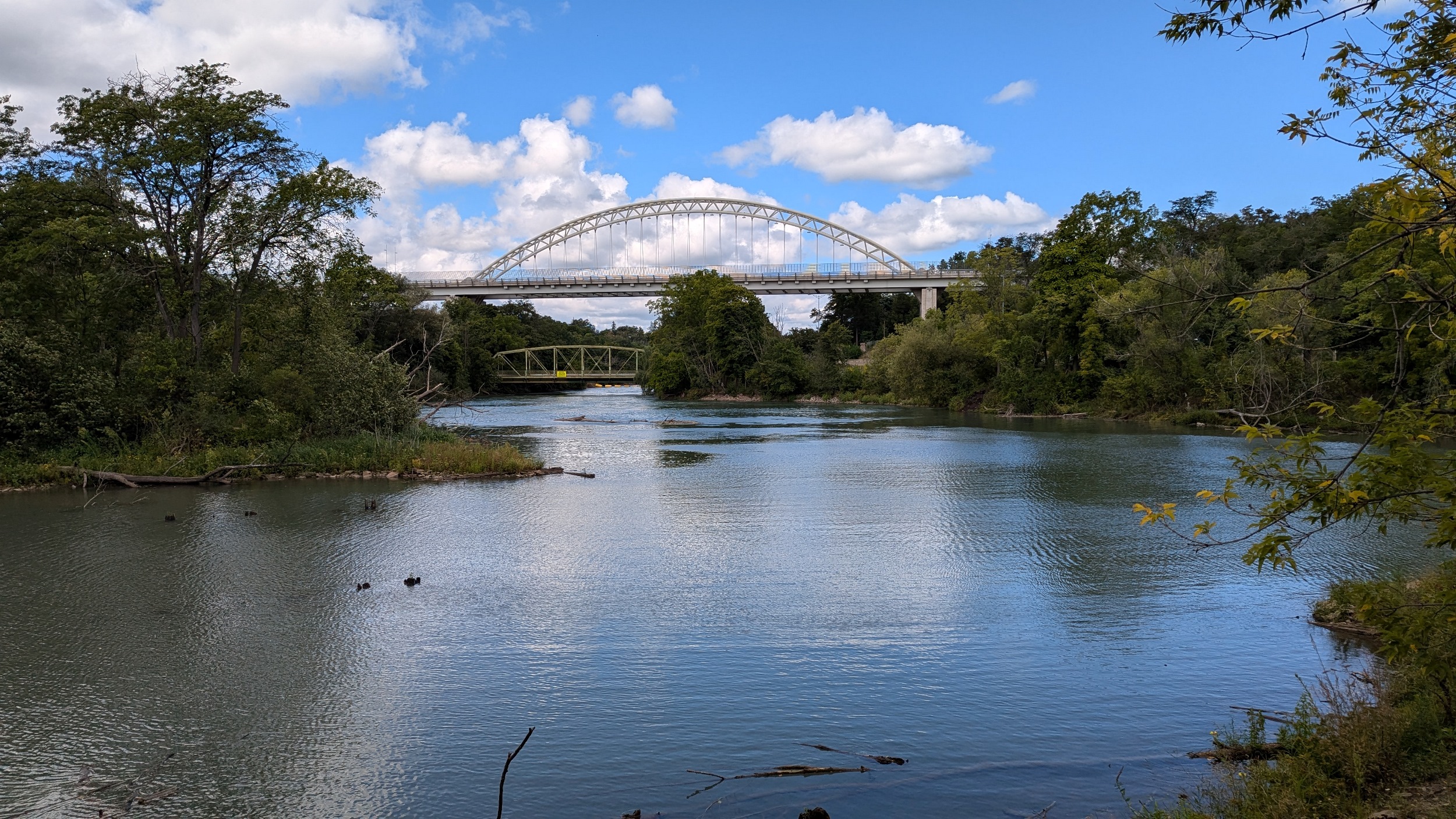Across an old bridge and under a new one. The St Paul Street bridge was replaced a while ago to continue carrying people over the creek and Highway 406, and it looks fantastic. The creek gets choppy over another weir.
