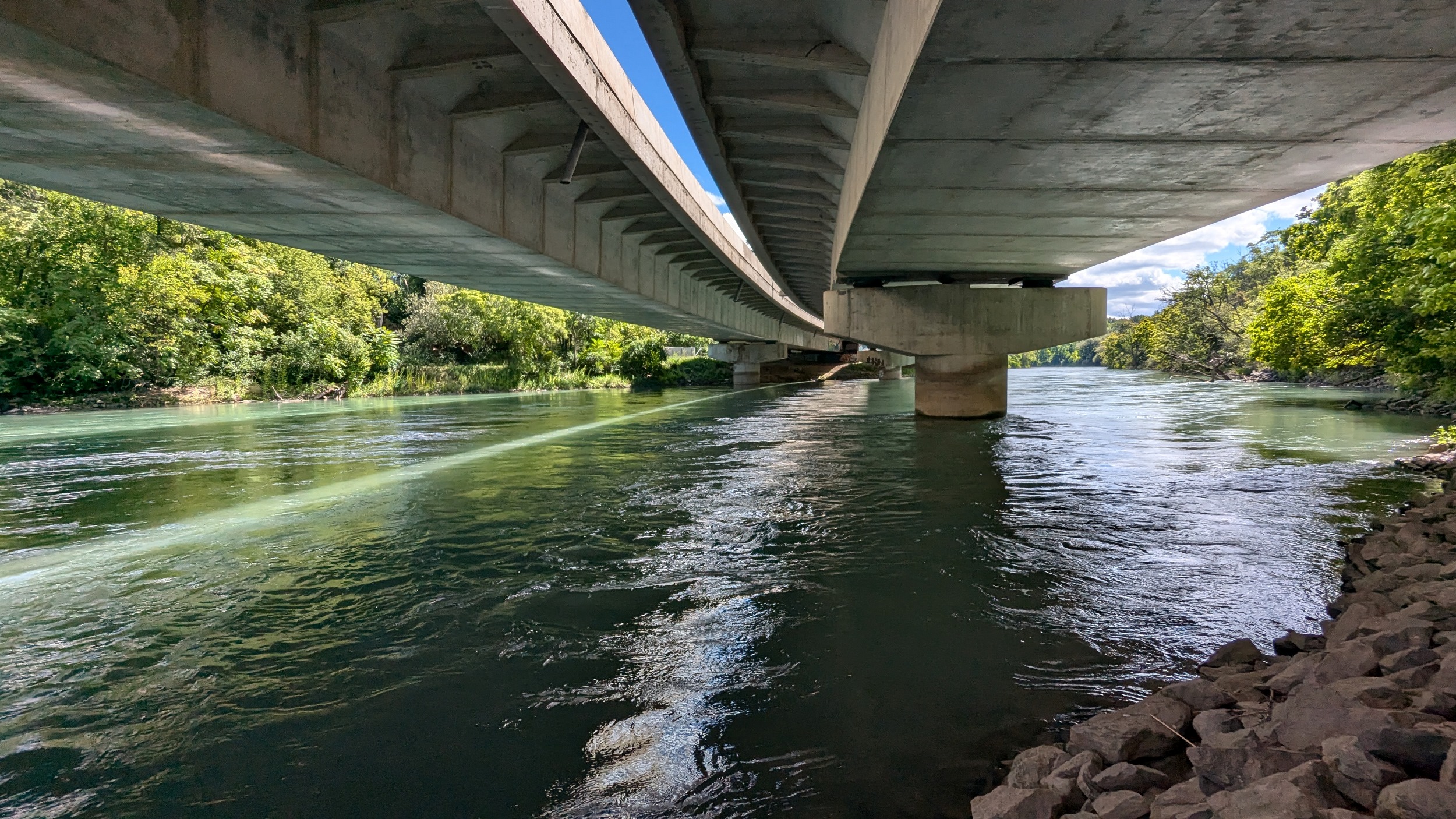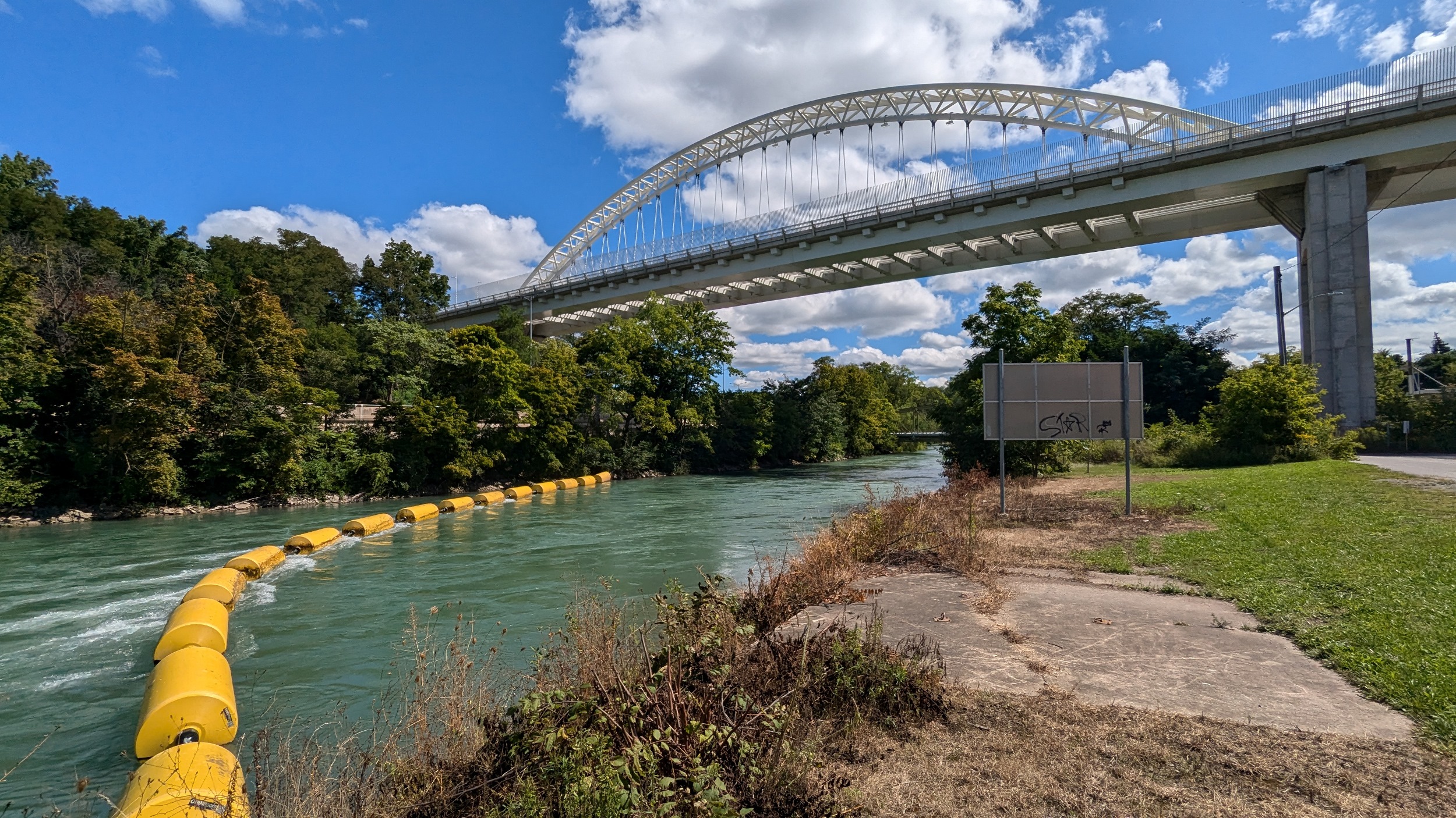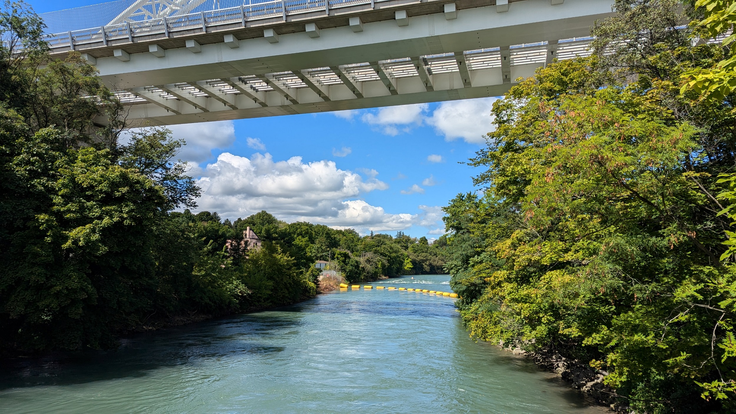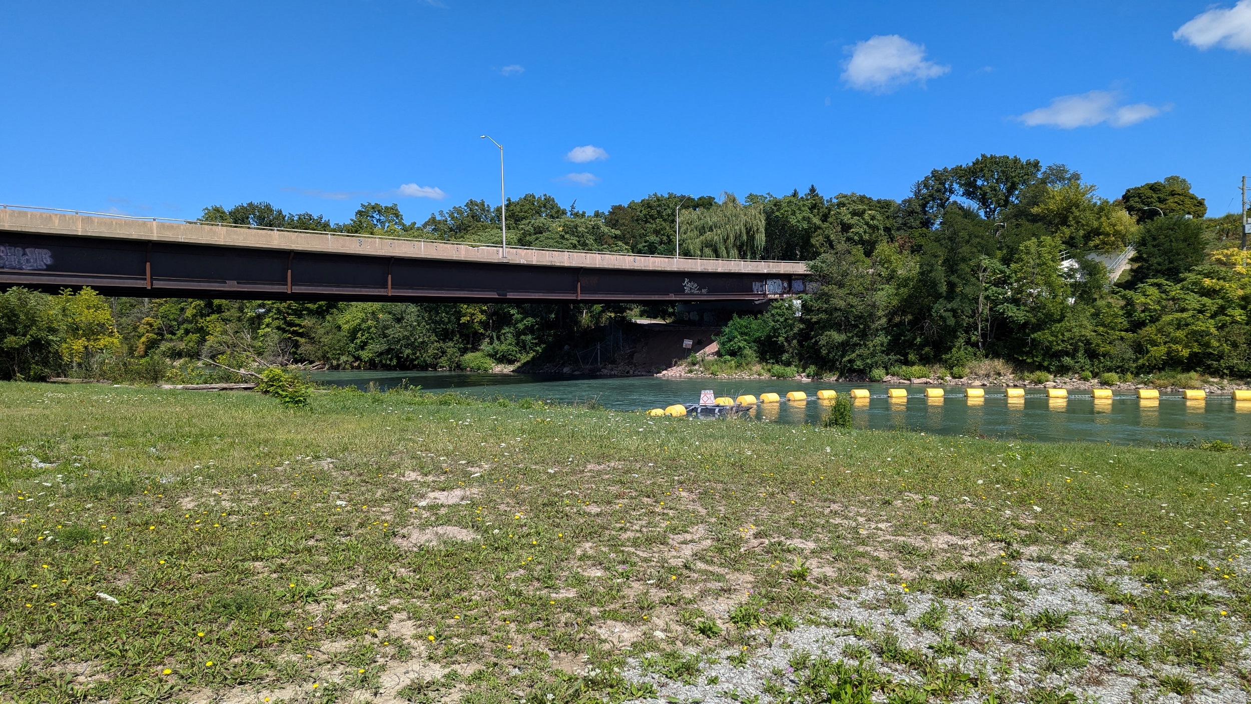 Across an old bridge and under a new one. The St Paul Street bridge was replaced a while ago to continue carrying people over the creek and Highway 406, and it looks fantastic. The creek gets choppy over another weir.