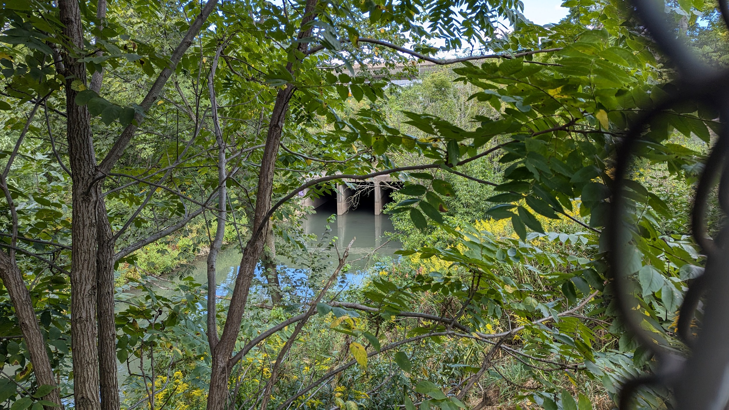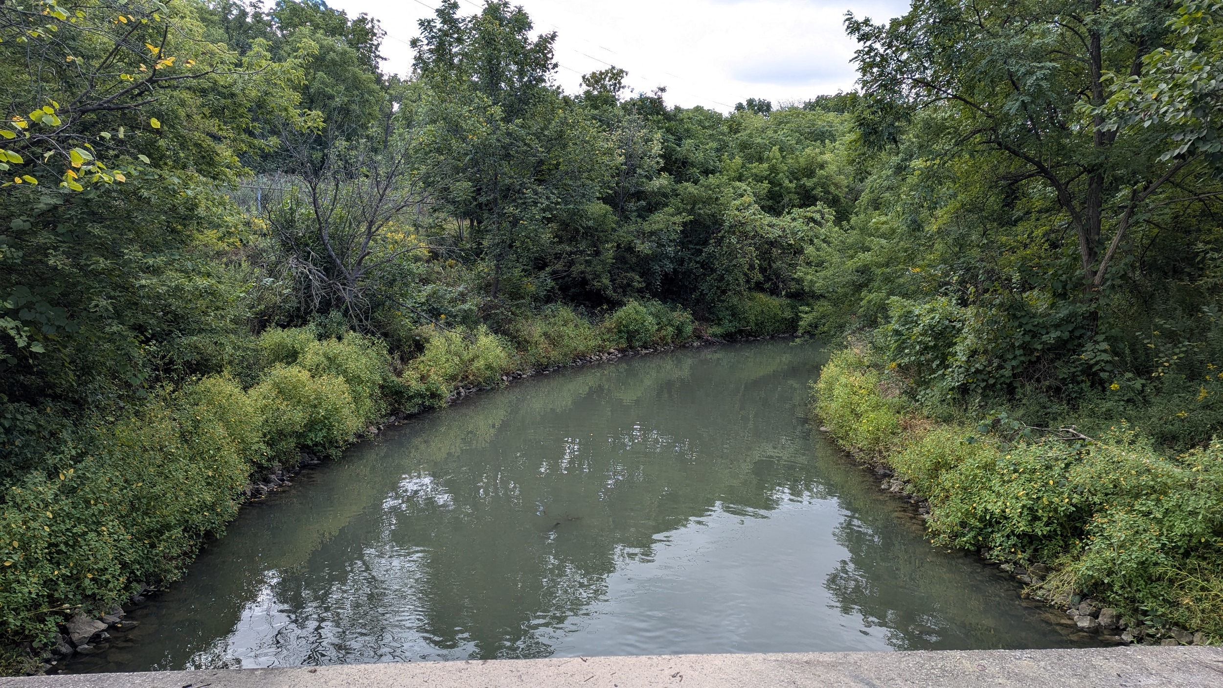 Downtown St Catharines is now in sight. The creek gets a little crazy, it seems to flow over a weir-like structure, and then it meets an outfall that I believe is along an old Welland Canal. It then makes a bend west to go under St Paul Street and along the 406.