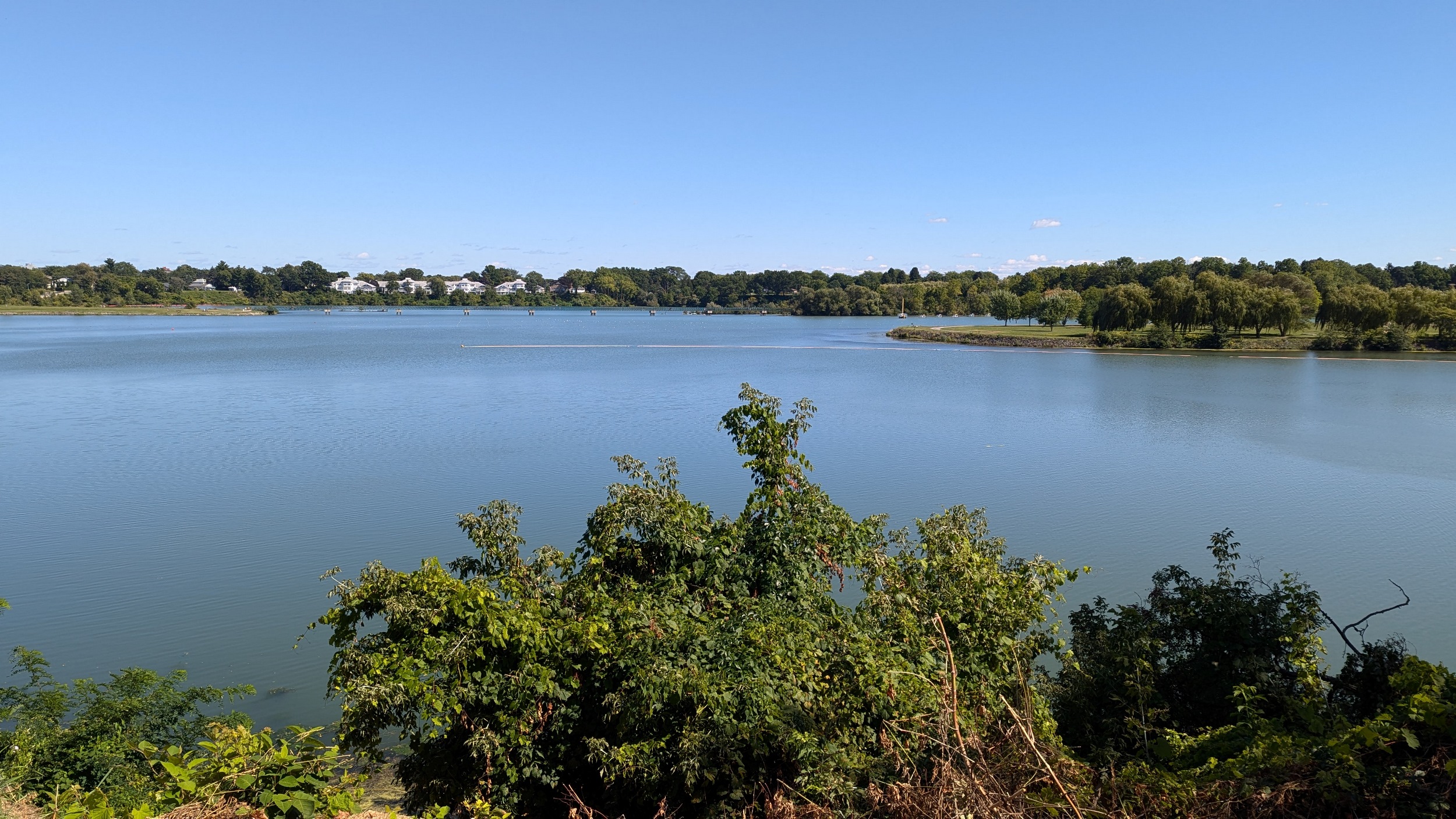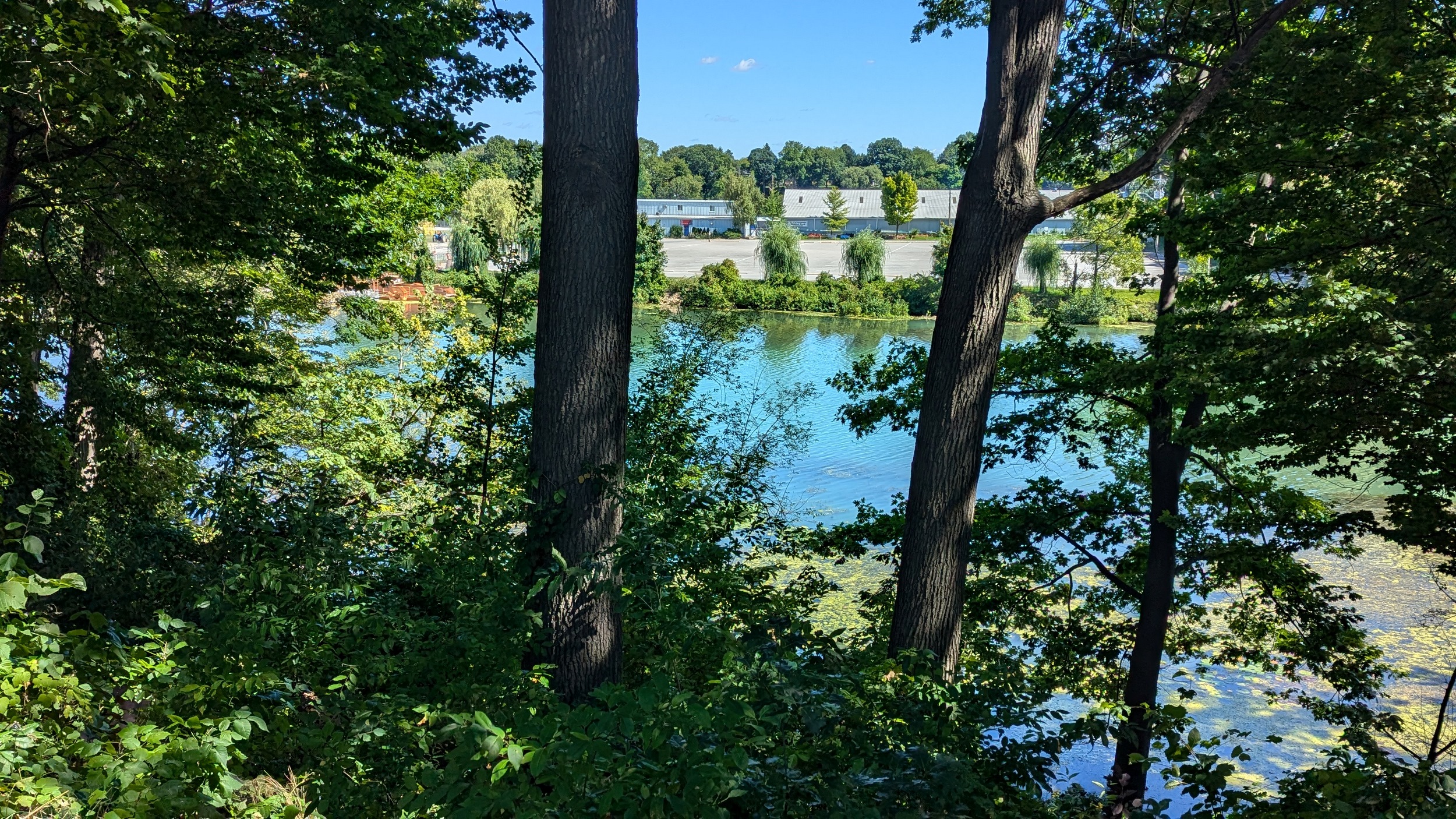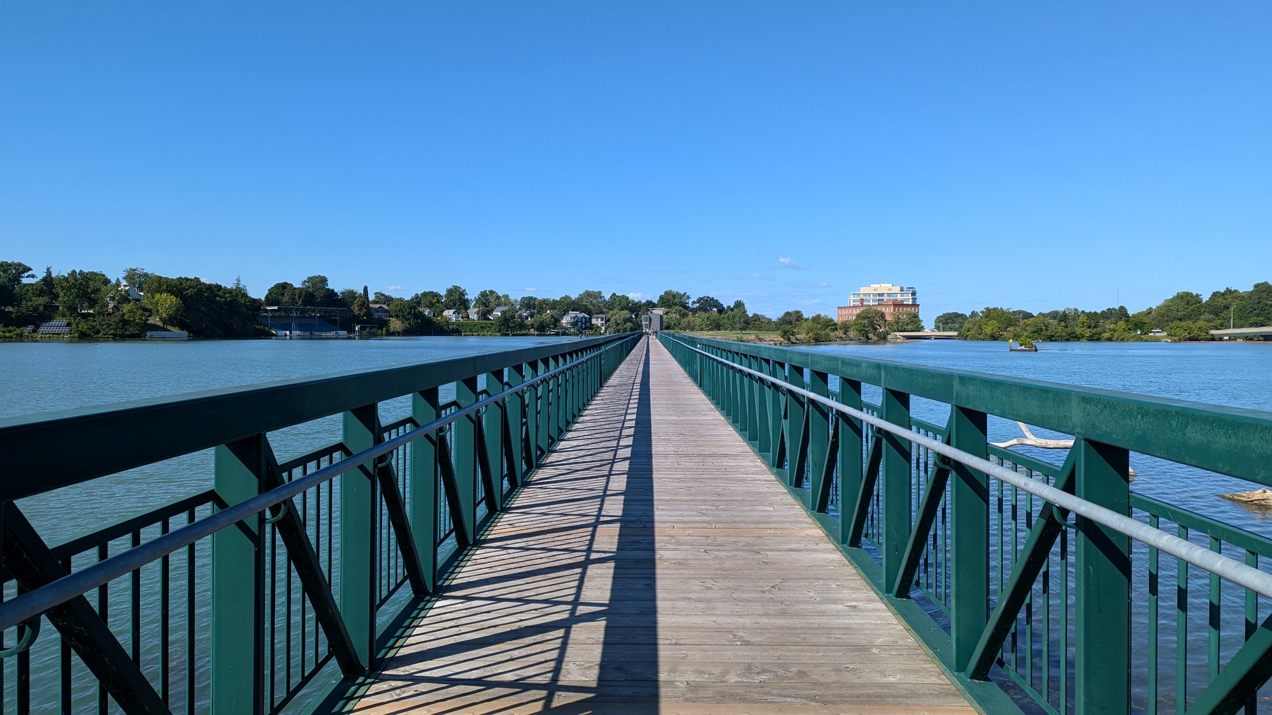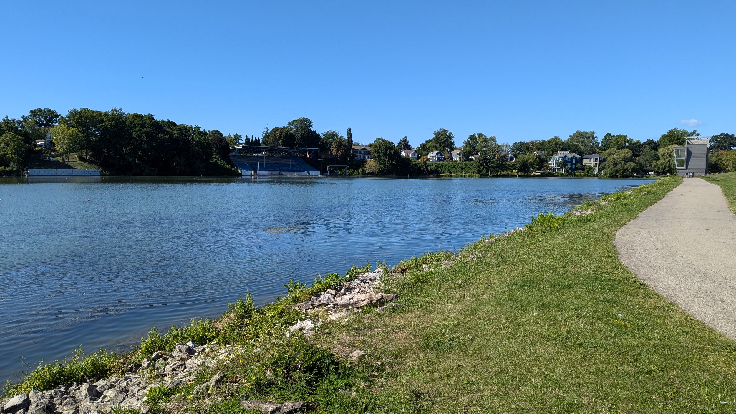 Over a small bridge to some waterfalls and the Heywood Generation Station (no relation). I hadn’t realized there was this much elevation differential between the lake and the pond. Another look back to various structures for rowing competitions.
