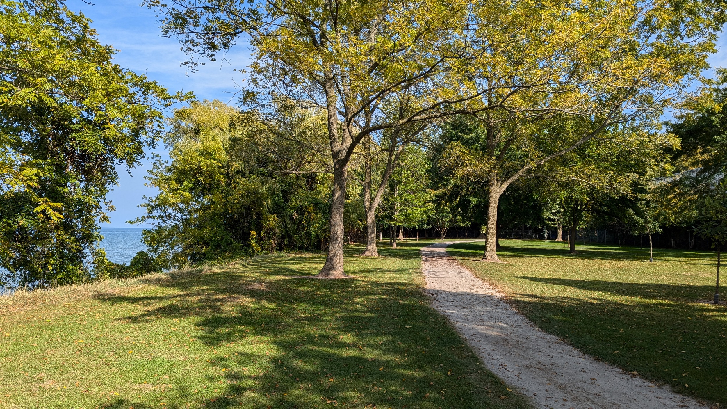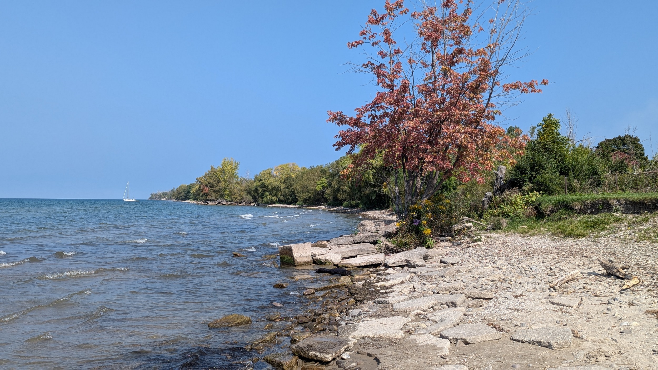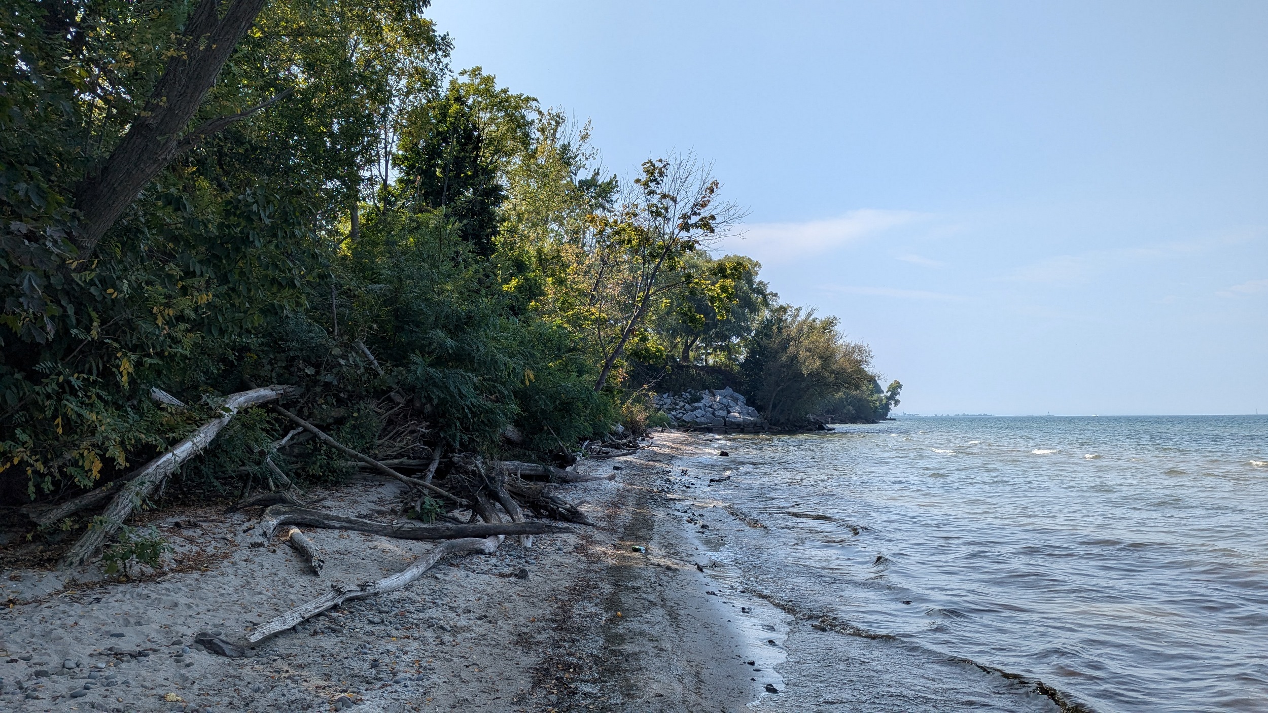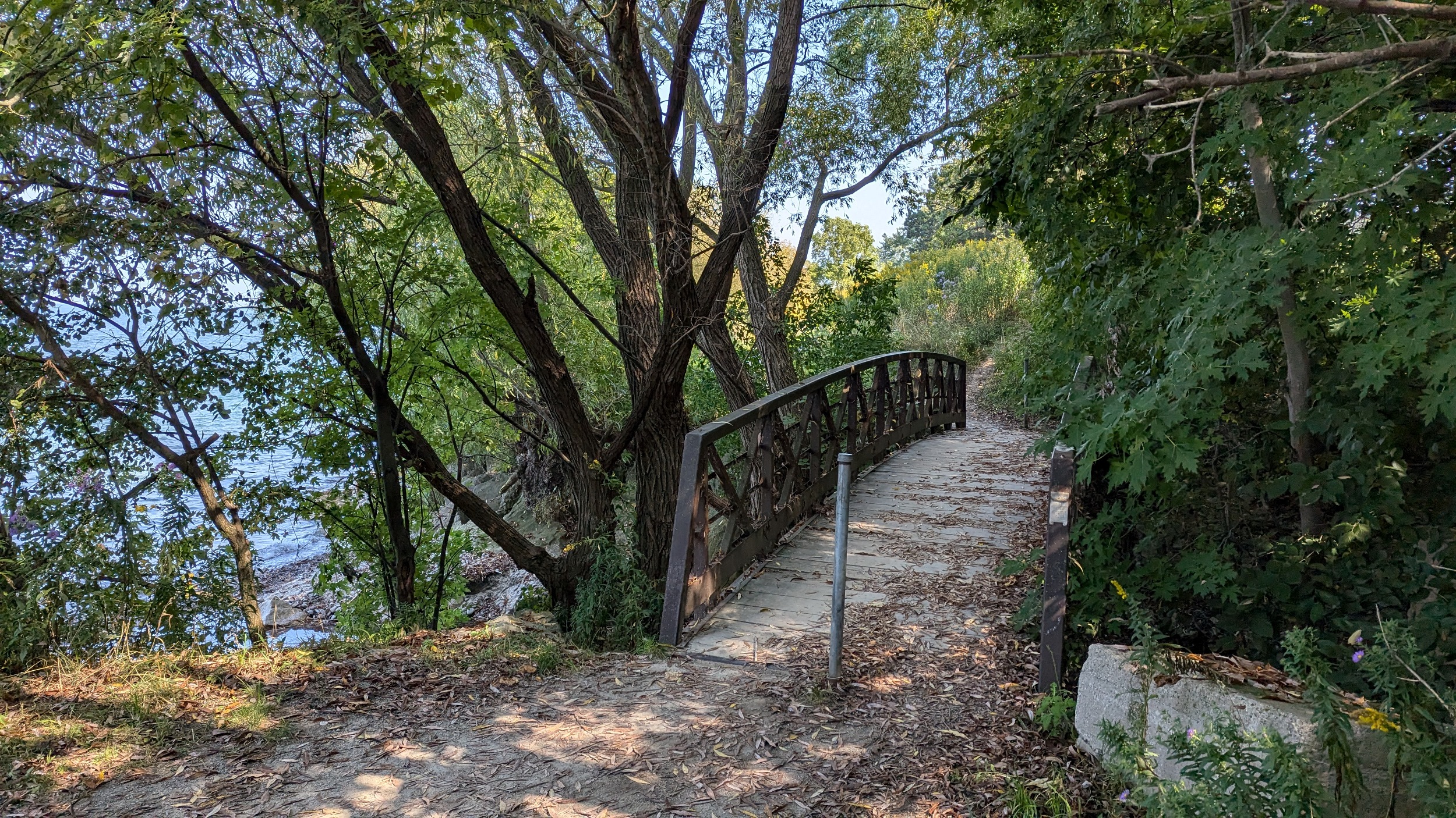 The park becomes terraced again after a short break. A wooden bridge leads you over a stream, and little beaches pop up alongside some small groynes. This uninterrupted stretch of shoreline comes to and end because of one mansion on Lantana Circle. Around two more properties at Butler and Vine, and back onto public parkland. Lakebreeze Park has no eastern access so it’s a single point in and out.
