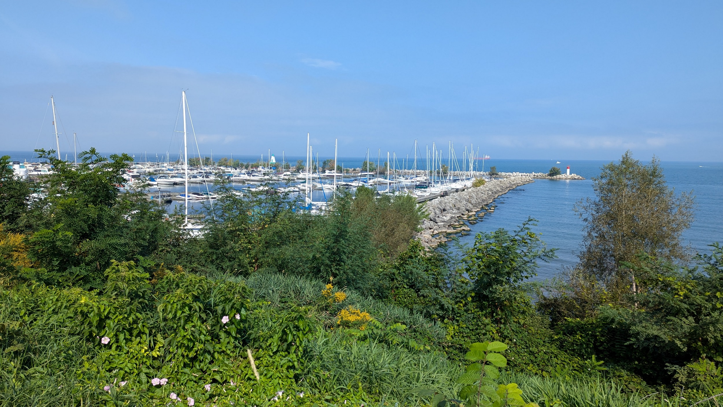 Around the lighthouse and back south from the pier’s end, past a rocky breakwall, then east again. You cut along a marina until scrambling up the bluff and continuing along the top.