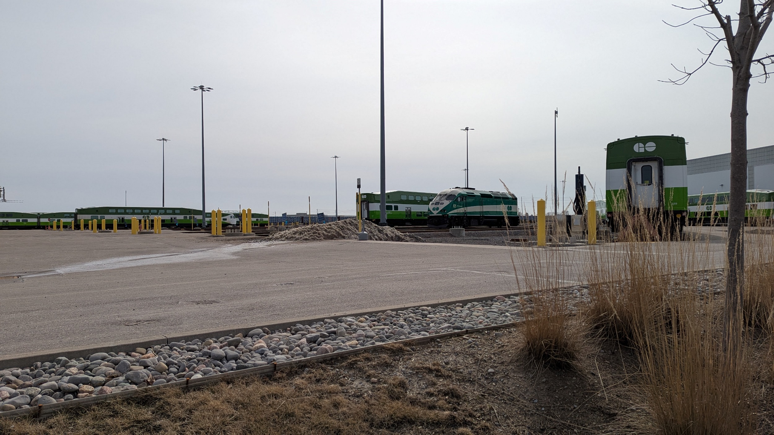 Under the tracks, and past GO Transit’s Whitby Rail Maintenance Facility, a large complex sitting in the shadow of industrial Oshawa. This is home to take care of everything: washing, painting, maintenance, fuel, even signal work.