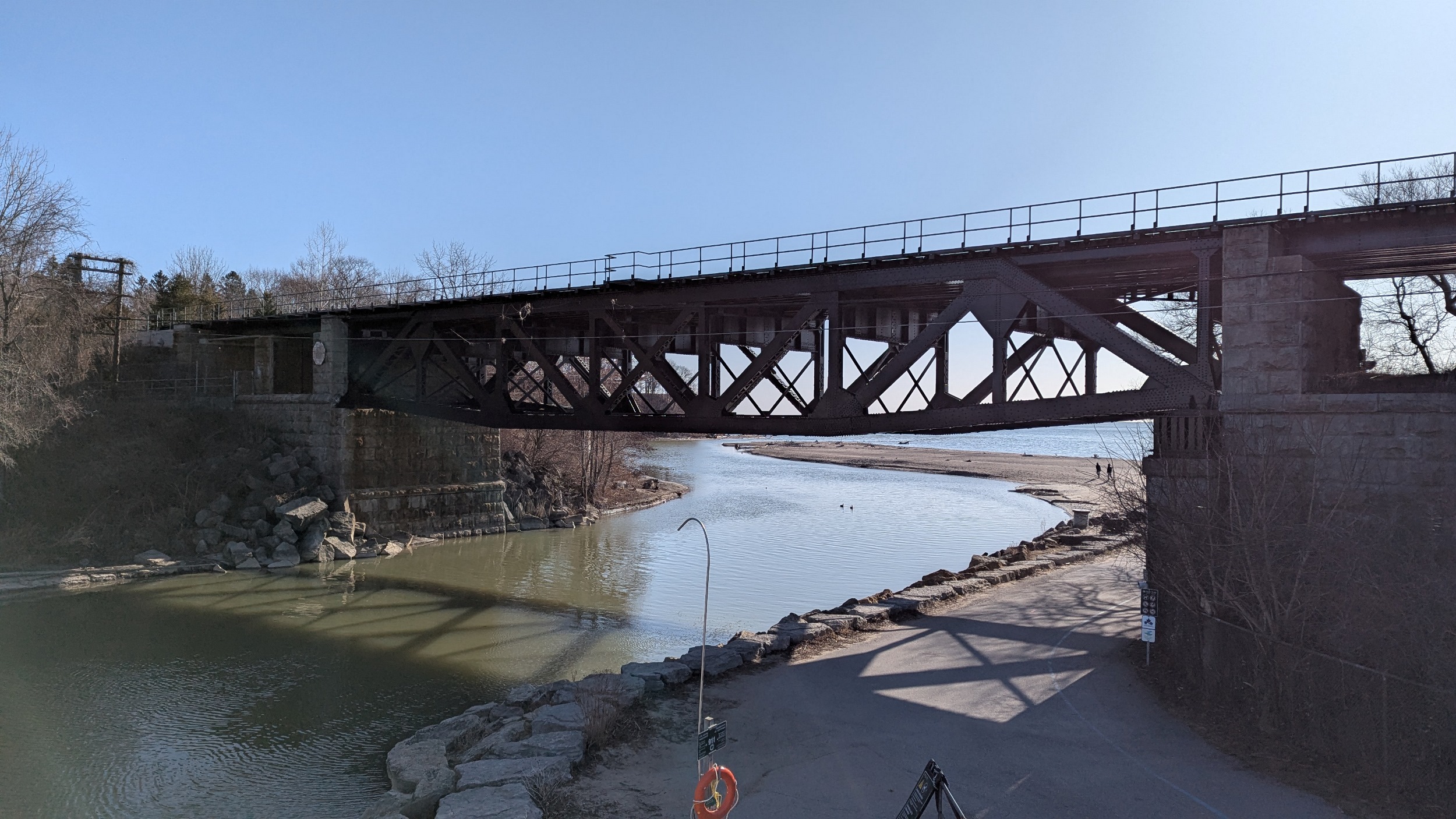Good morning from Rouge Hill. Today I’ll be following the GO Transit Lakeshore East line from here to it’s current terminus in Oshawa. A bit of a quiet start, as GO trains are not running this section this weekend. Makes the walk parallel to the line and the shore nice and quiet. The tracks run on a berm from the station to the Rouge River, with no crossings in between.