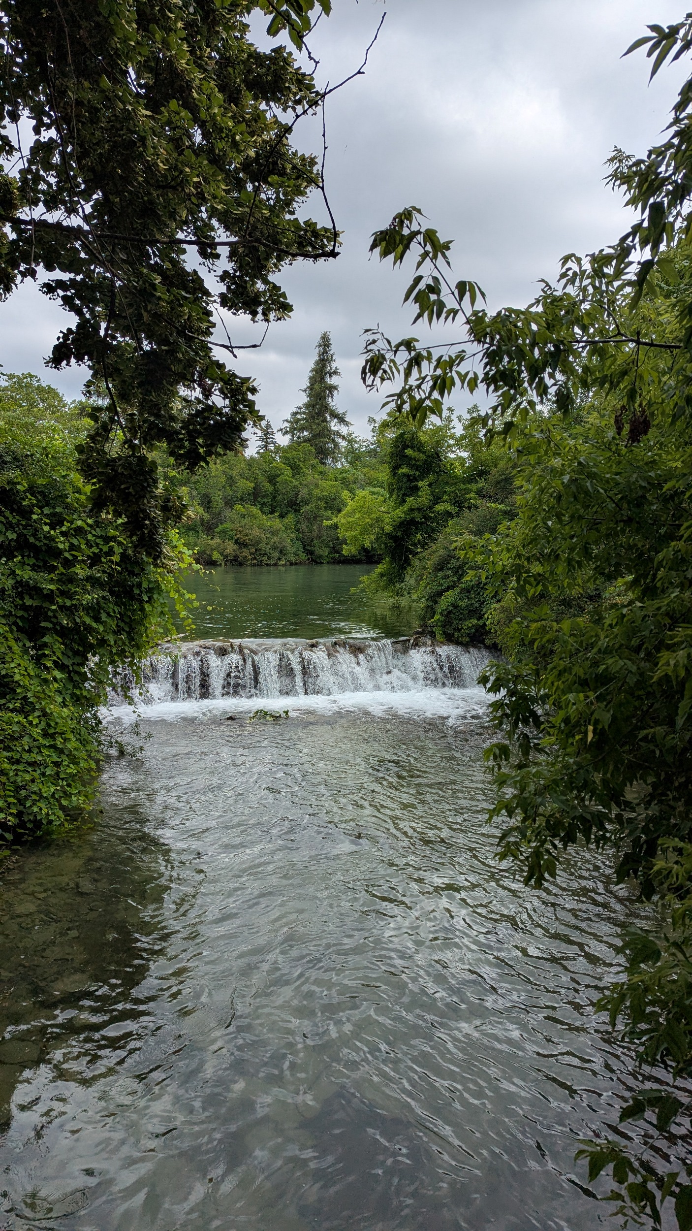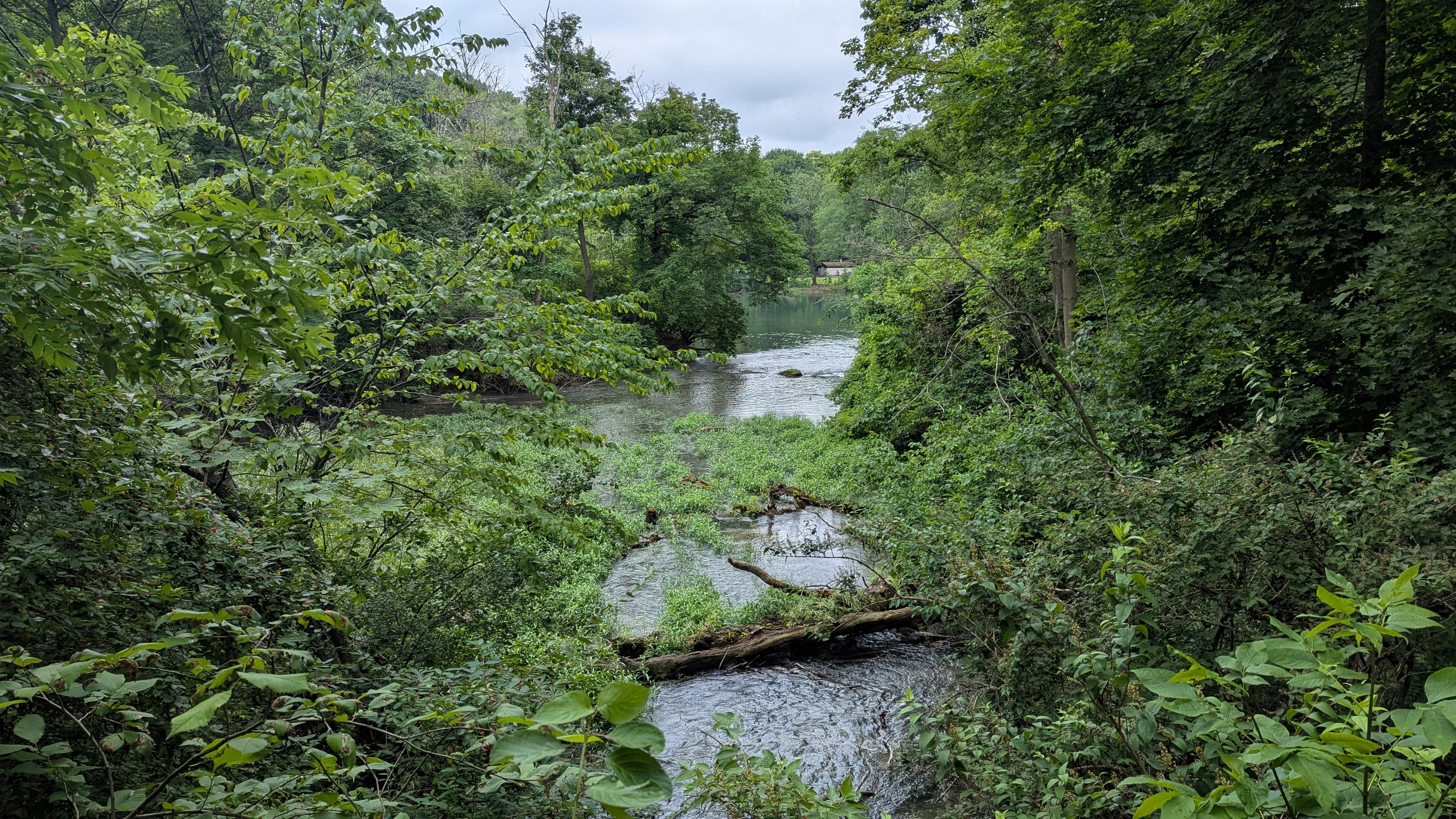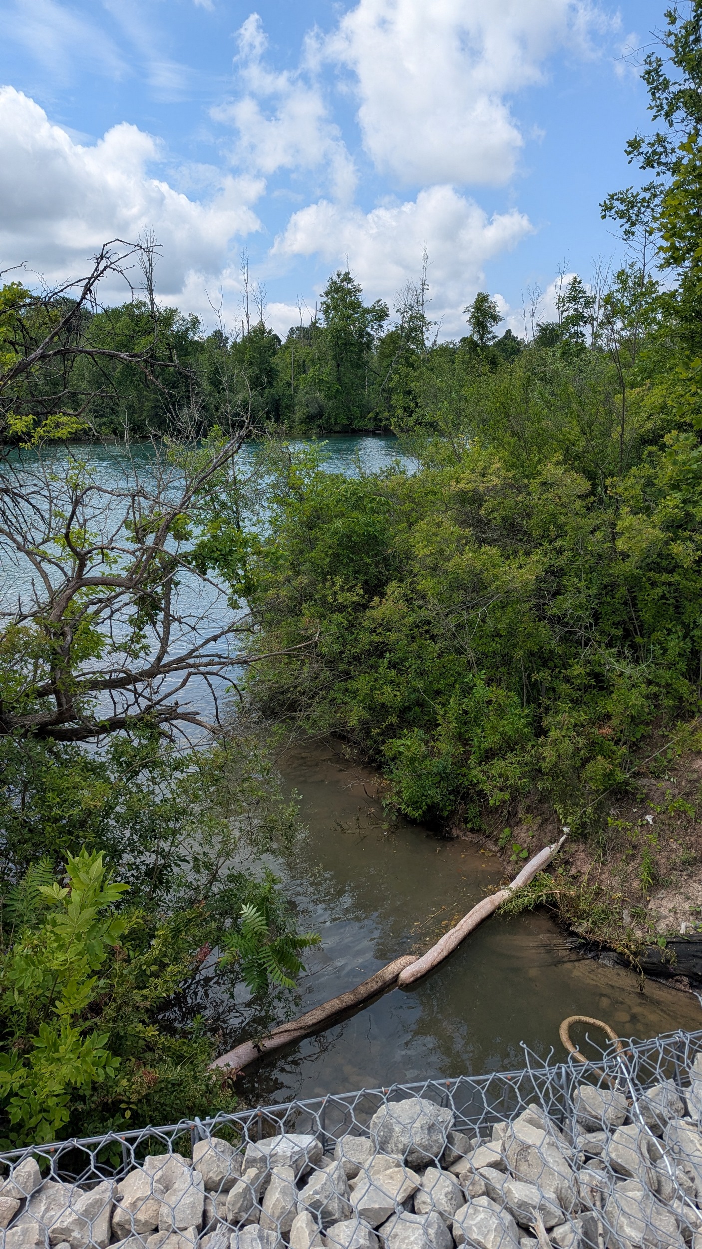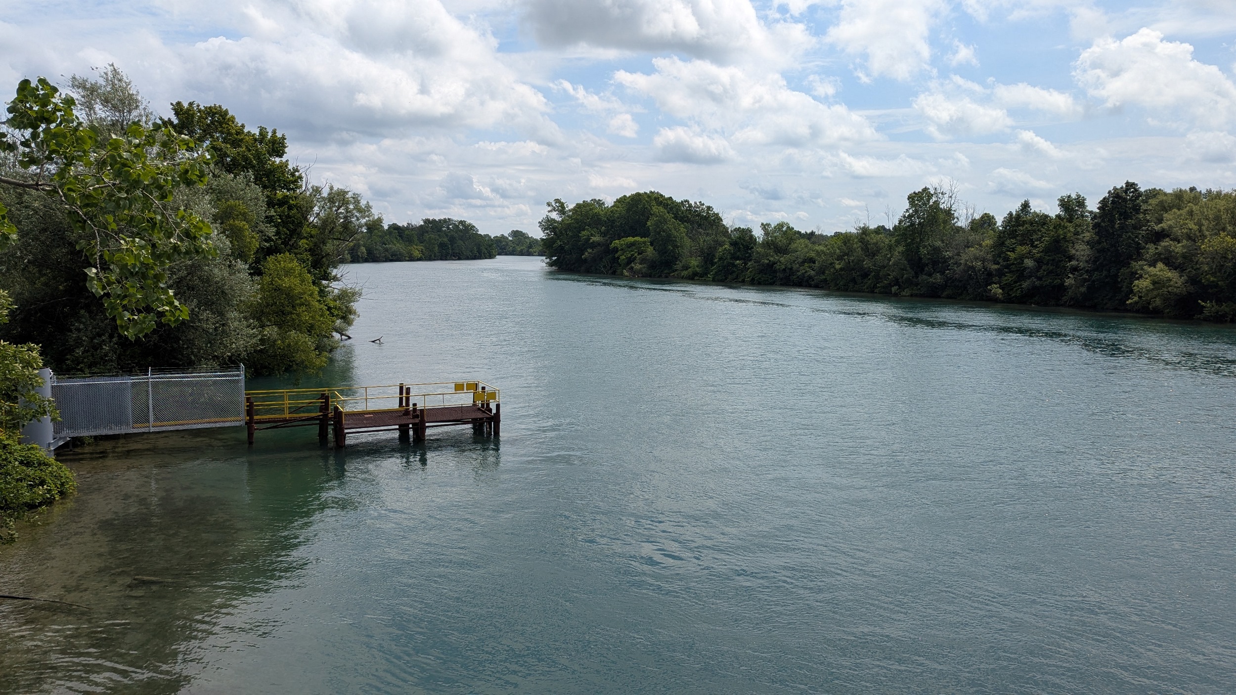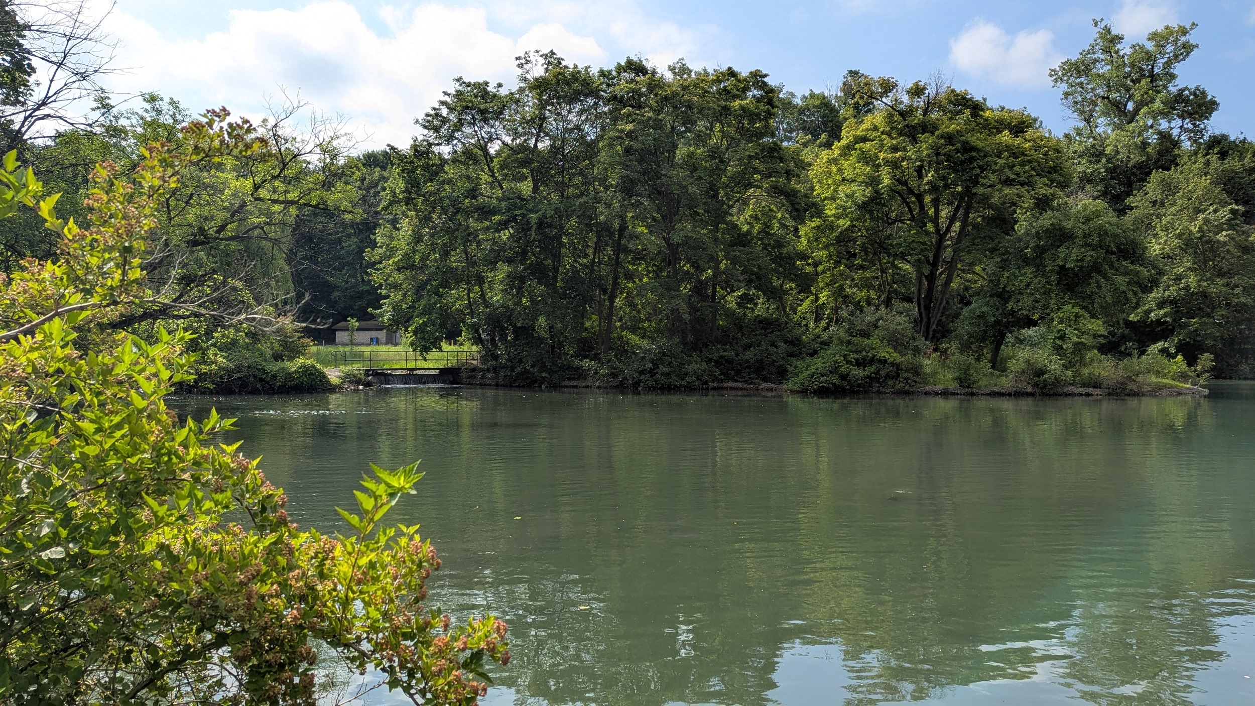 So much to see and so little time. Out of the islands and back to the main river. The forebay and weir confirm that the river was altered here for power, and some of it goes through the islands.