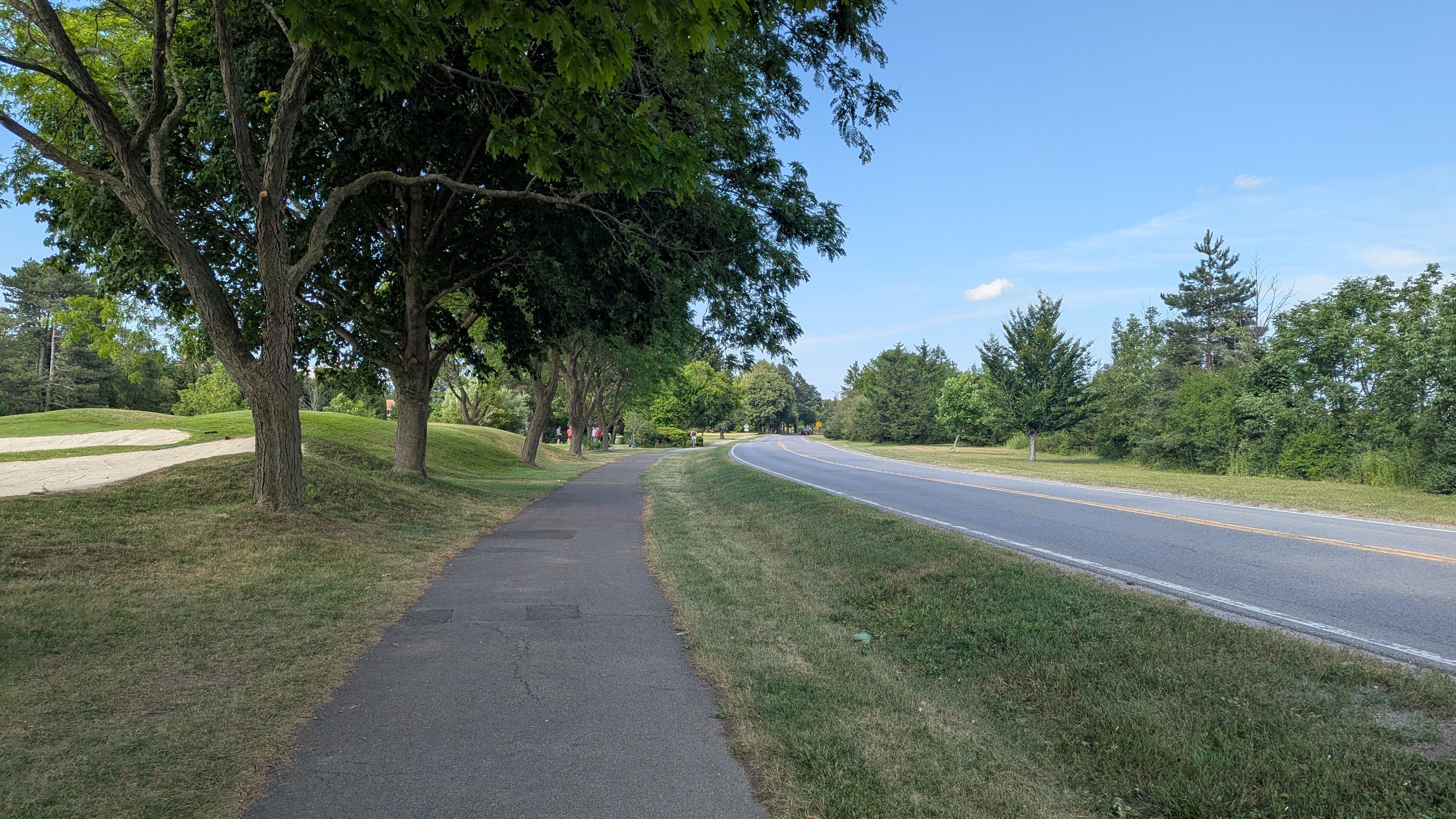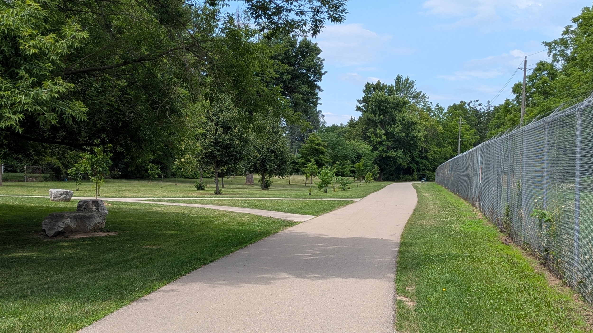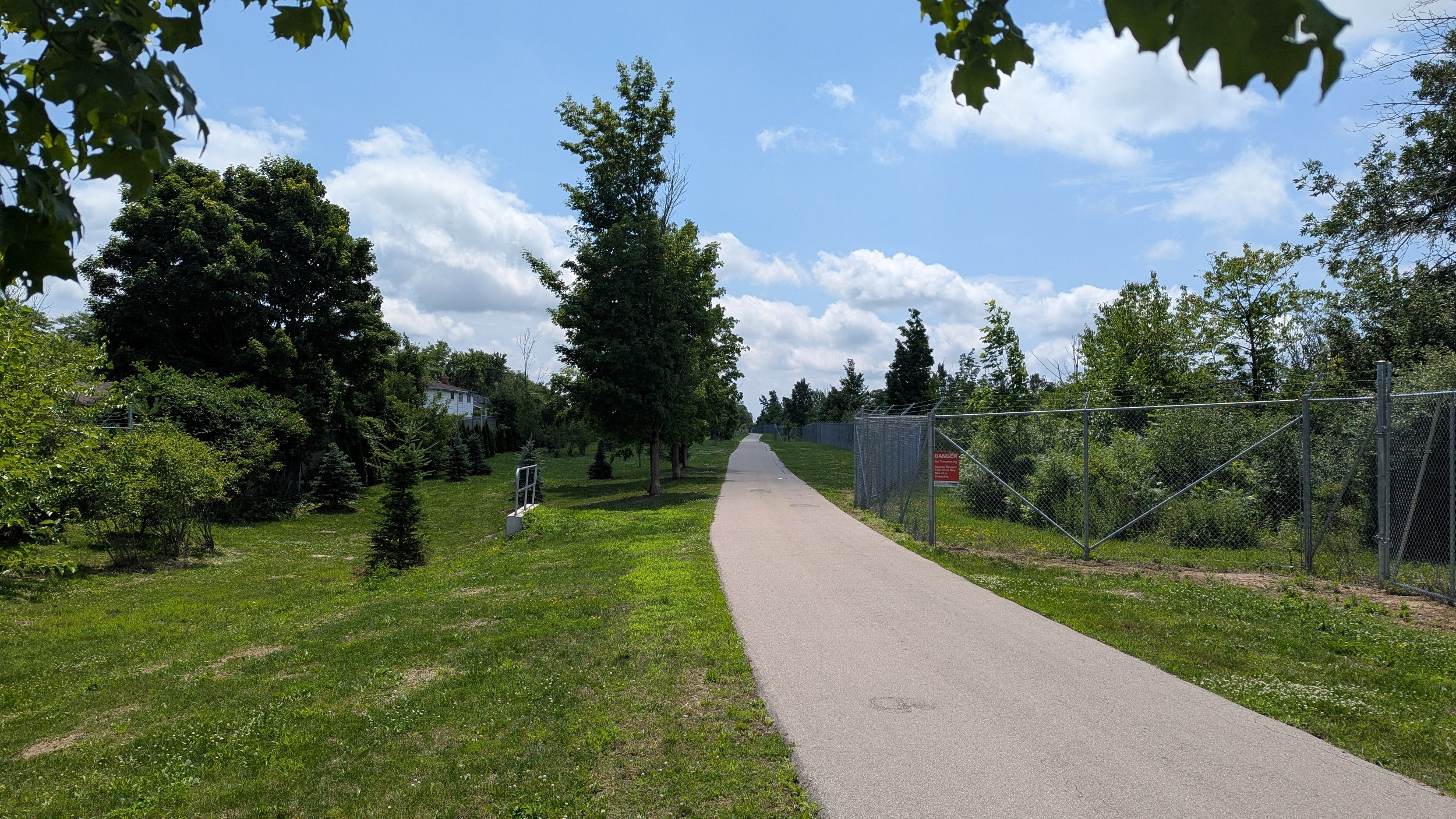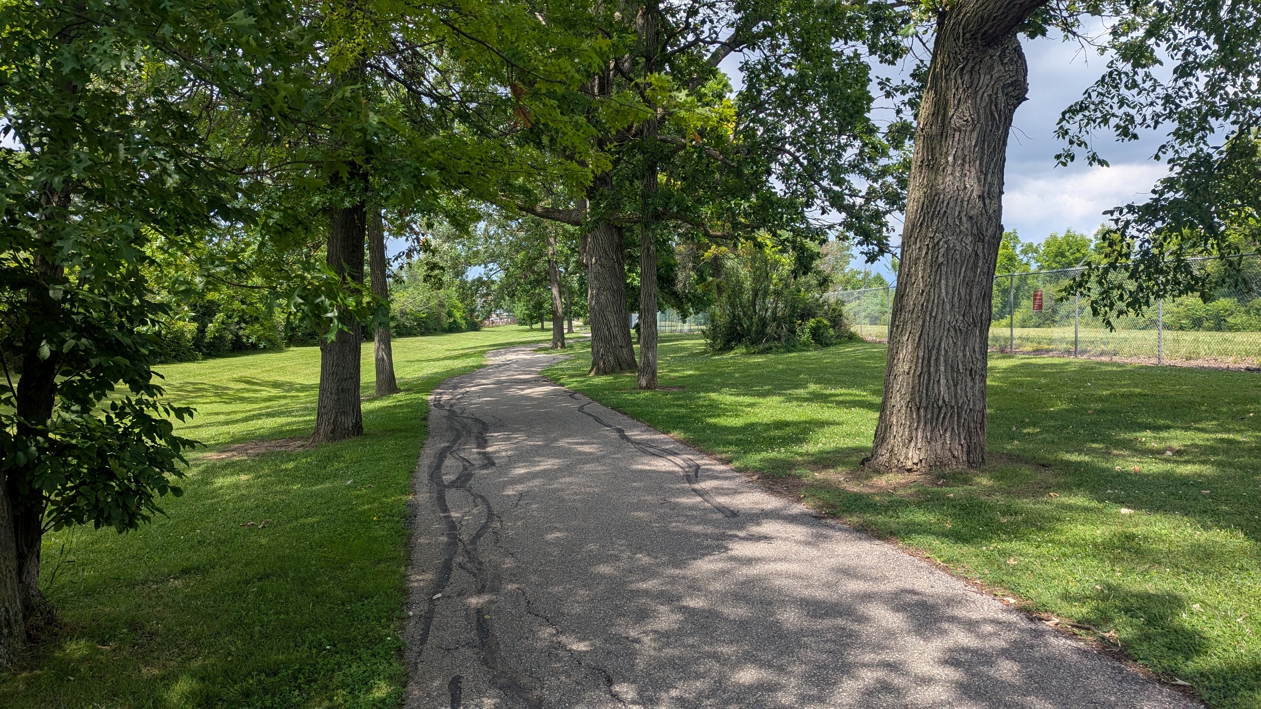Continuing west along Chippawa Parkway, you come to George Bukator Park. This finally establishes formal riverside trails, which are stonedust and allow for some shade and cool breeze, just what’s needed on a hot muggy day like today. There’s a couple gaps but it’s fine on such a chill road.