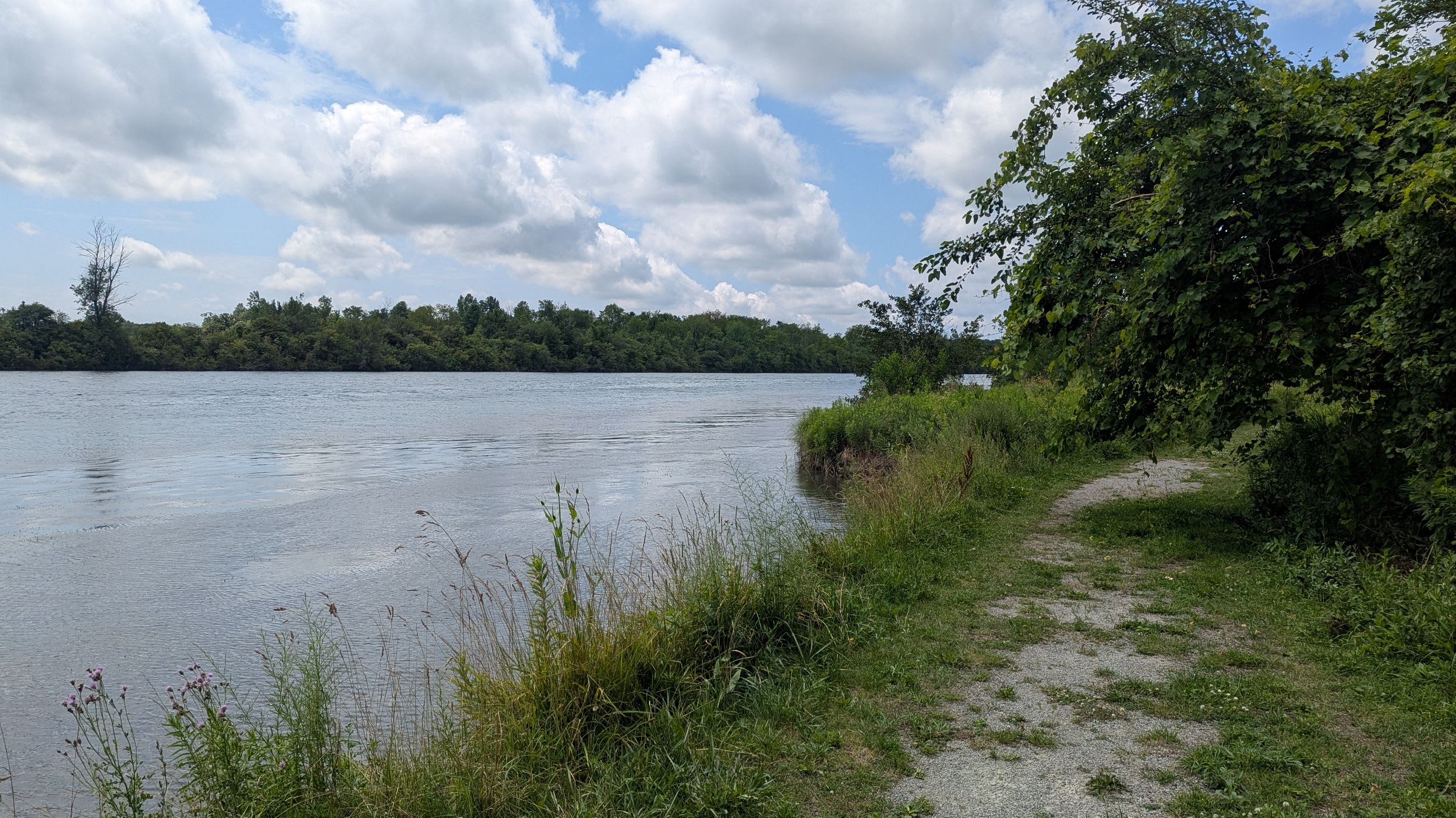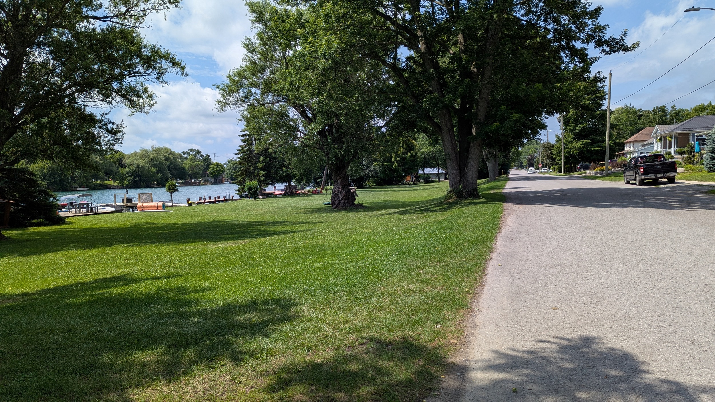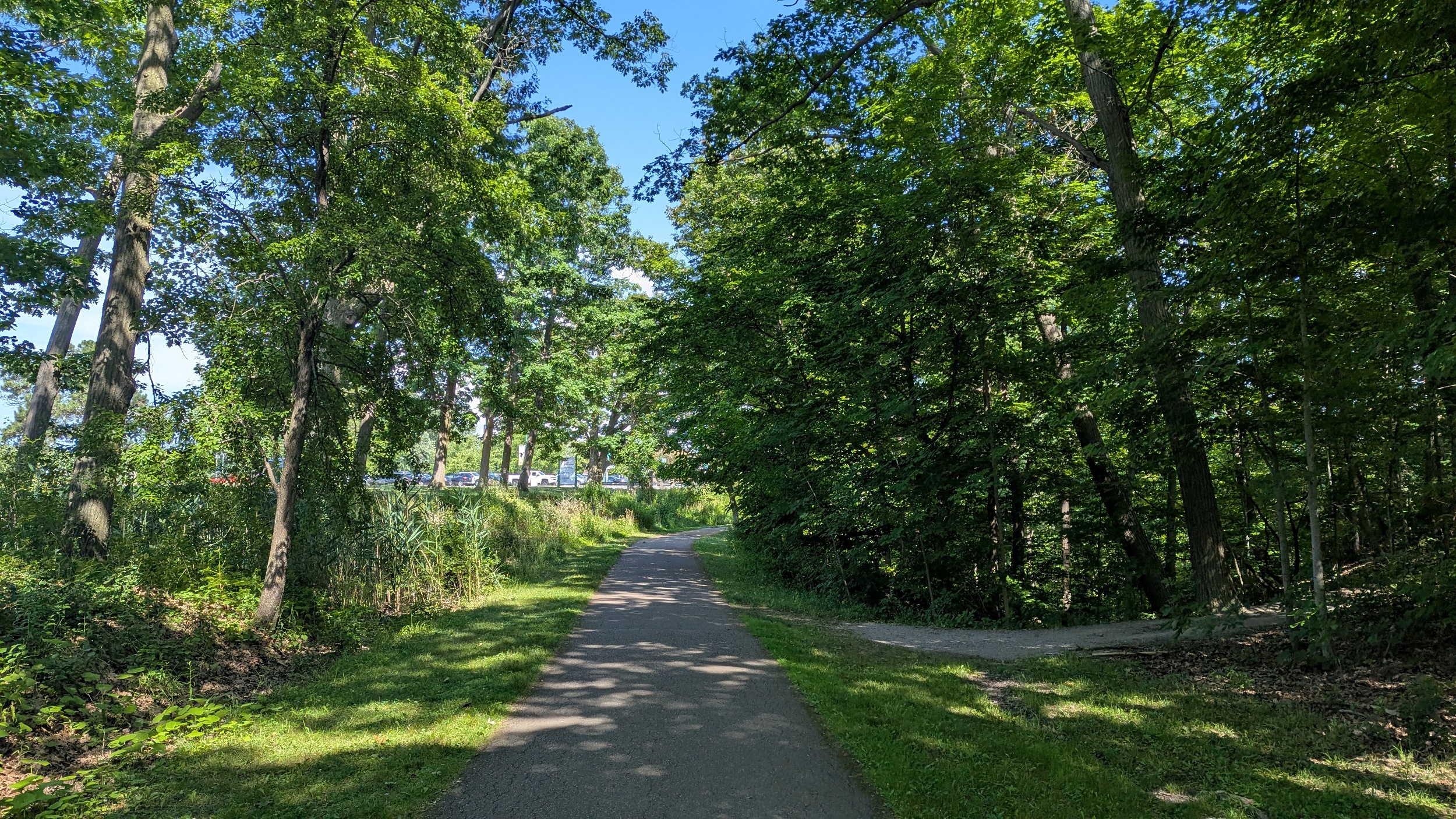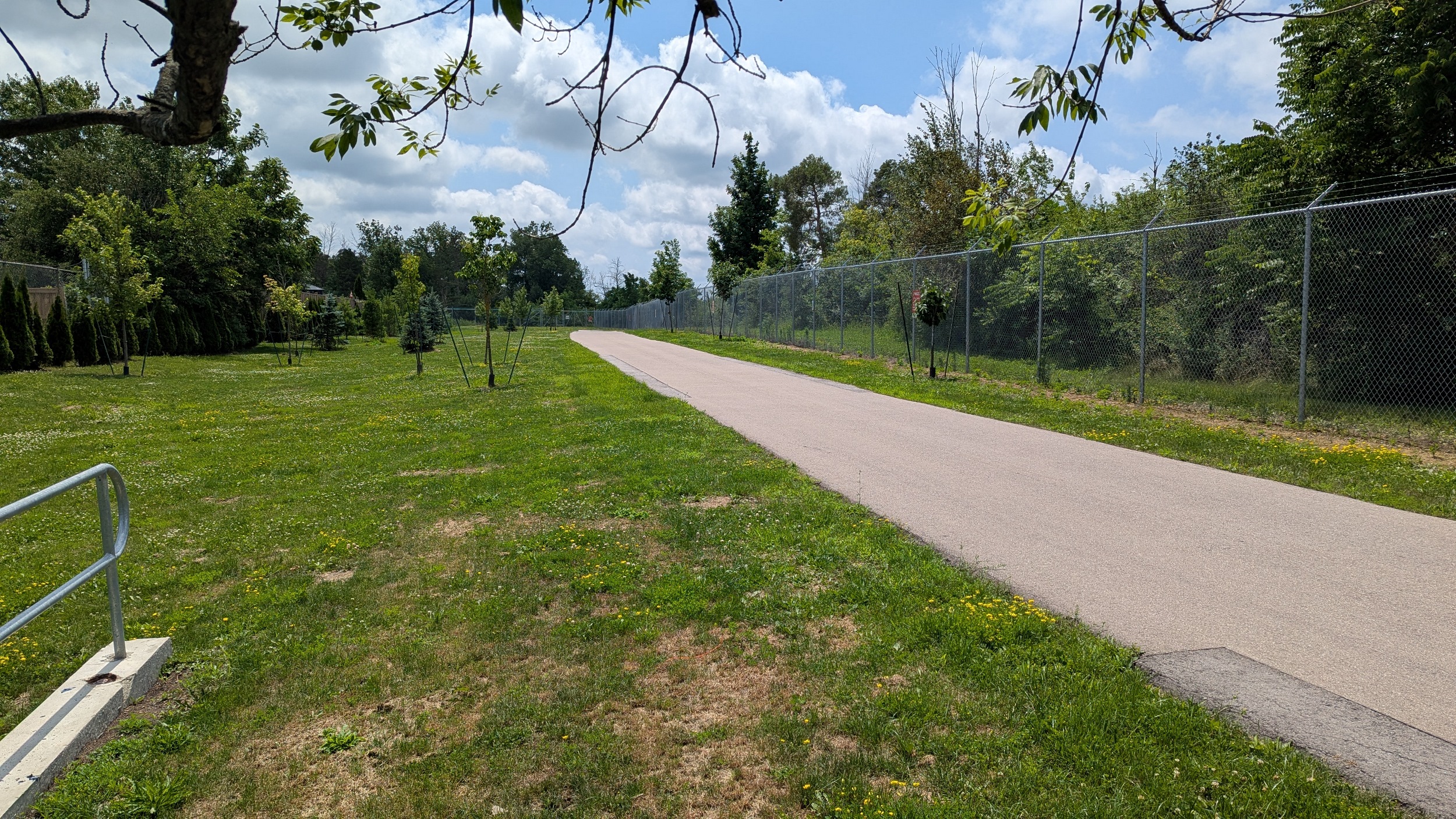 Continuing west along Chippawa Parkway, you come to George Bukator Park. This finally establishes formal riverside trails, which are stonedust and allow for some shade and cool breeze, just what’s needed on a hot muggy day like today. There’s a couple gaps but it’s fine on such a chill road.