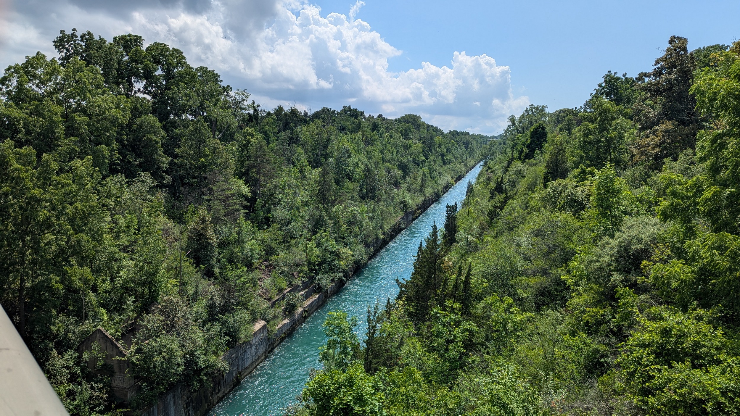The trail wobbles a bit more, and I even pass a neighbourhood connection, probably the first that isn’t a major road. Then I see the canal again at Royal Manor Drive, and holy cow! It’s way down there! A century old cut into the bedrock below. Just gorgeous.