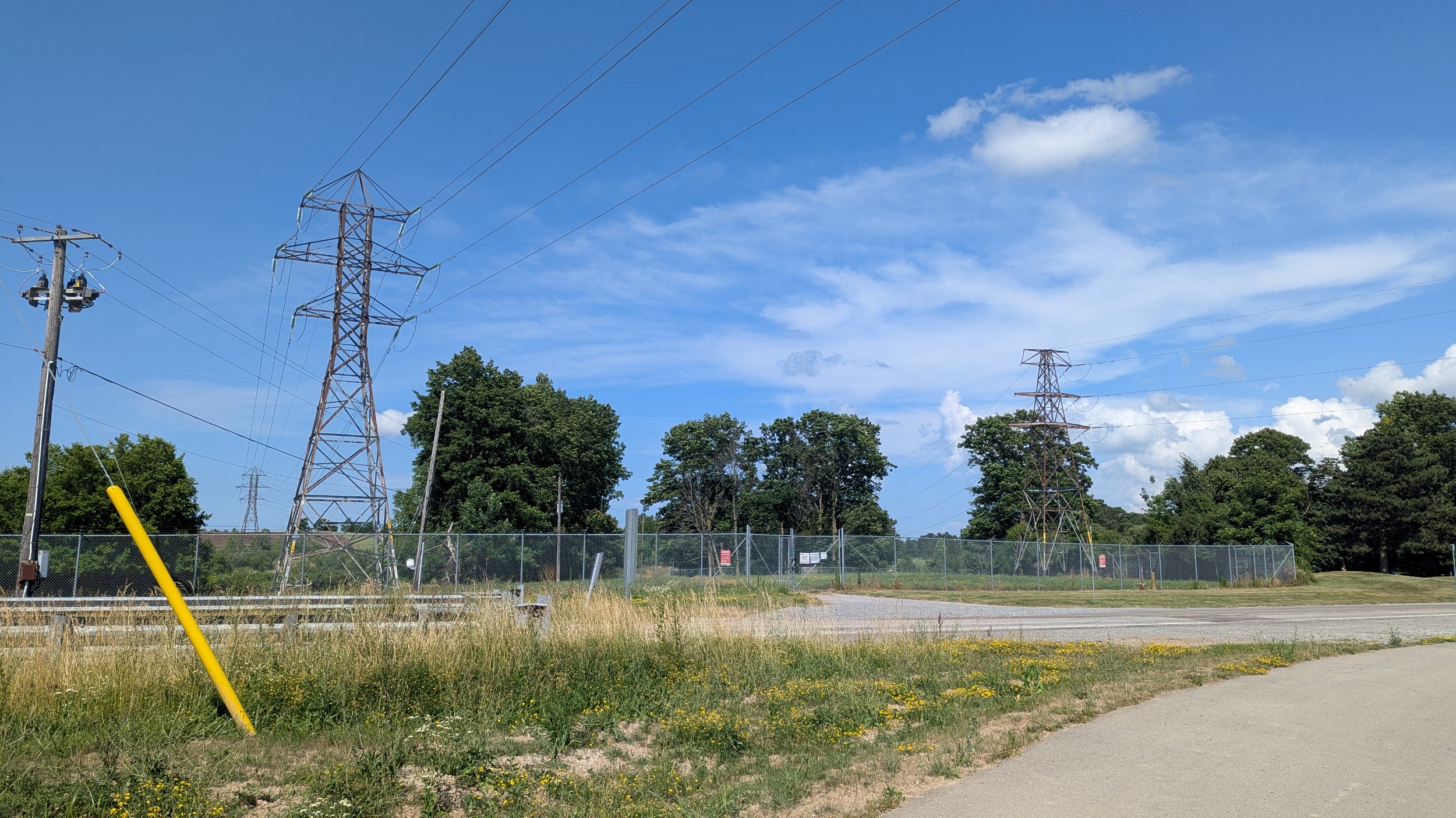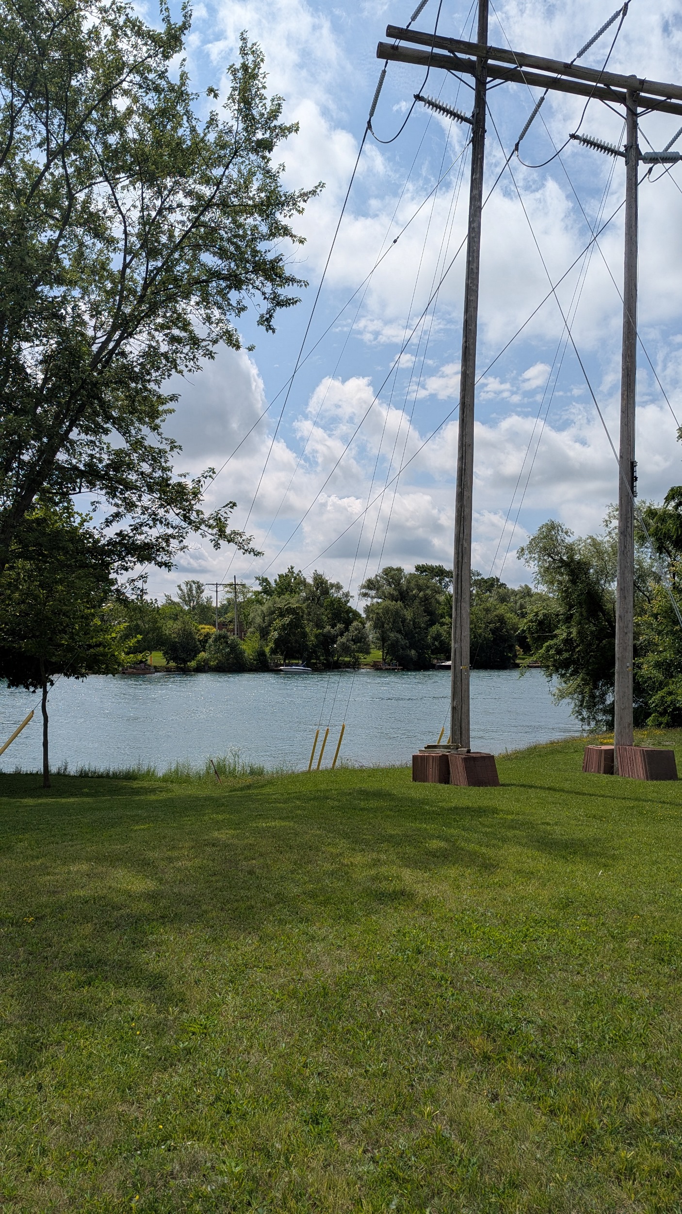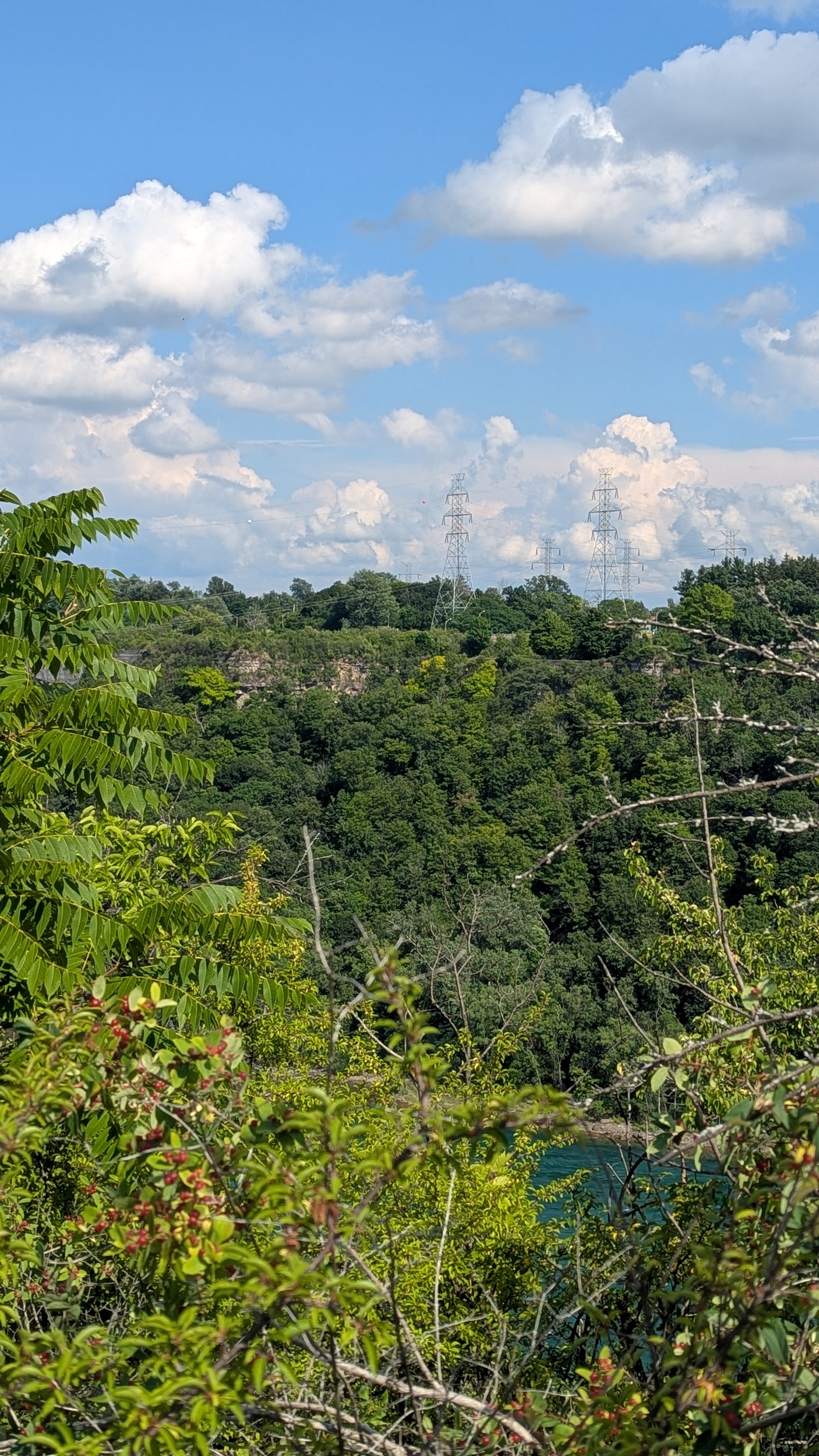 … I’m still going for some reason. Haven’t dwelled too much as, again, I’m so hot, but also because this will be subject to a future walk. I’ve hiked north from Whirlpool Road along the edge of the Niagara River. The power interconnects to the US tell me I’m close to my finish point.