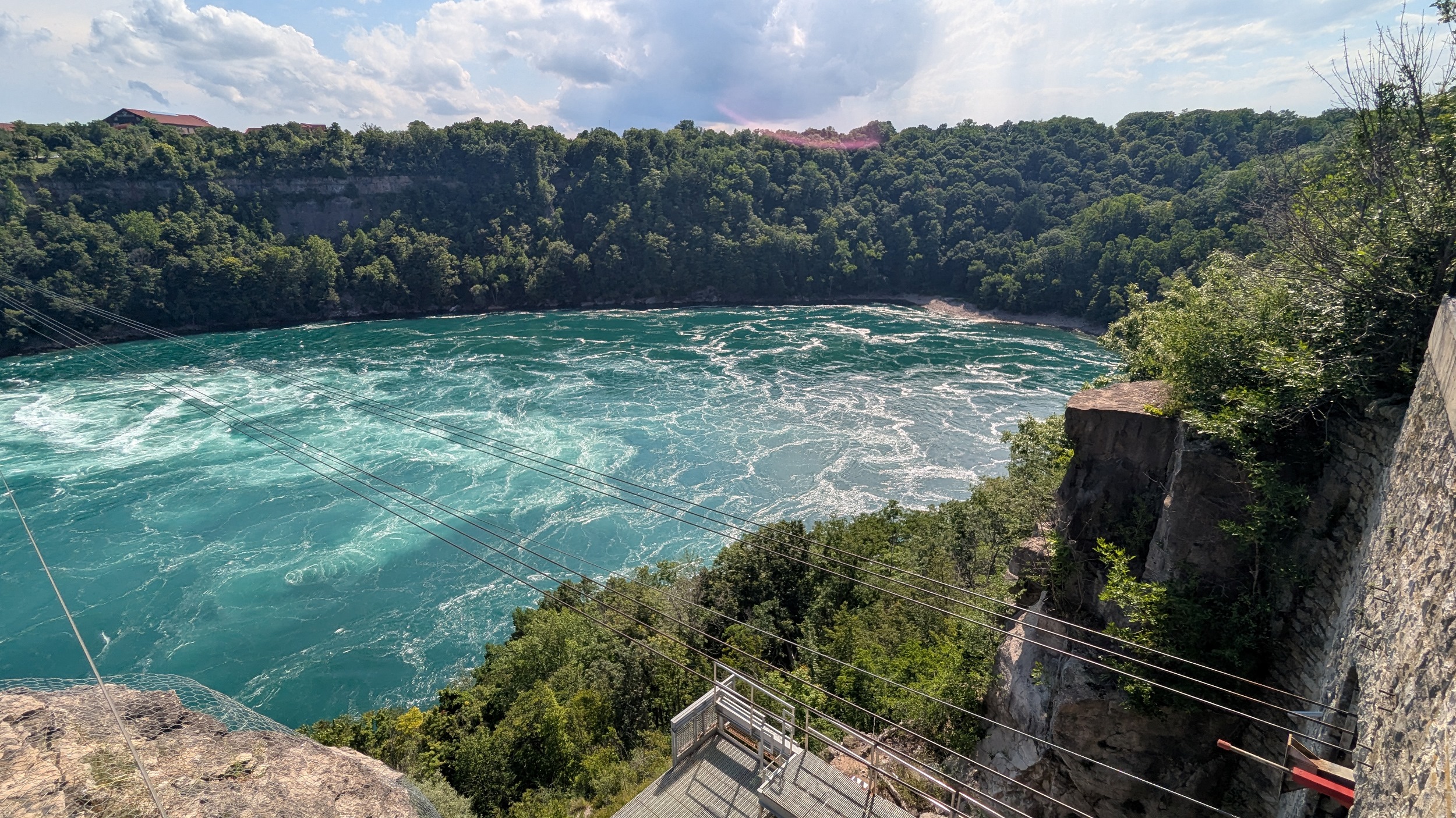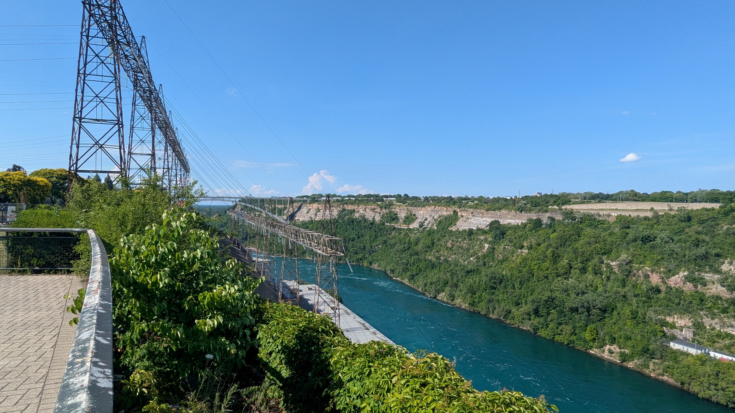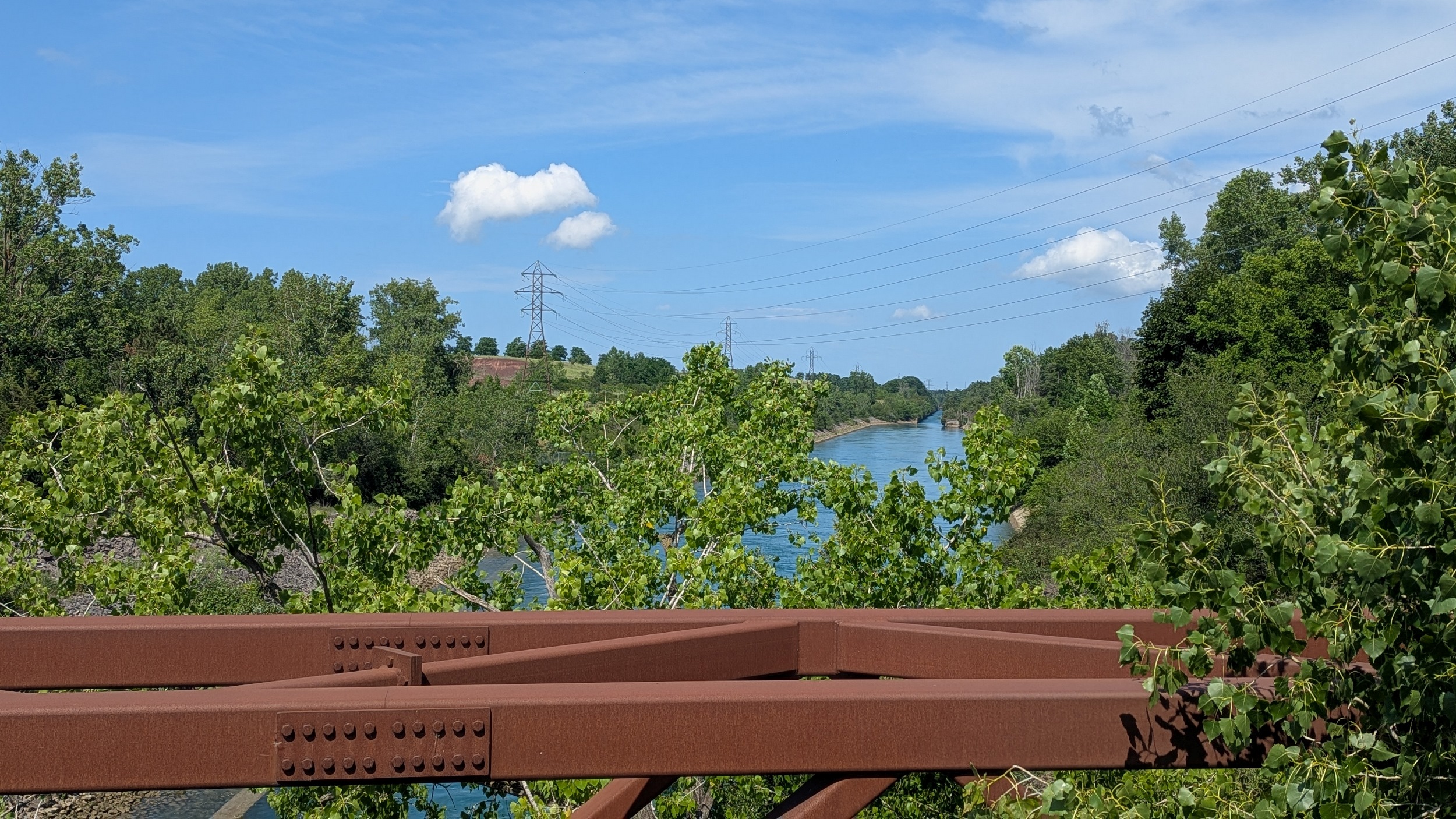 … I’m still going for some reason. Haven’t dwelled too much as, again, I’m so hot, but also because this will be subject to a future walk. I’ve hiked north from Whirlpool Road along the edge of the Niagara River. The power interconnects to the US tell me I’m close to my finish point.